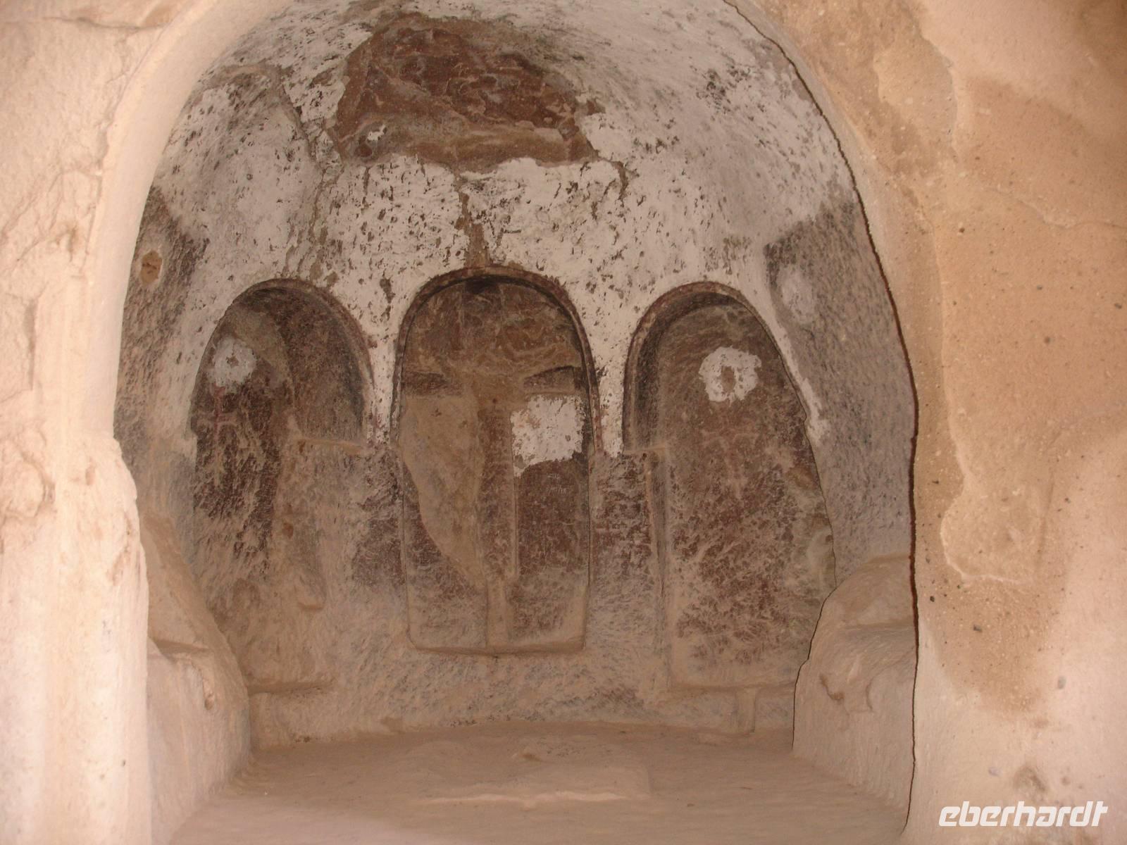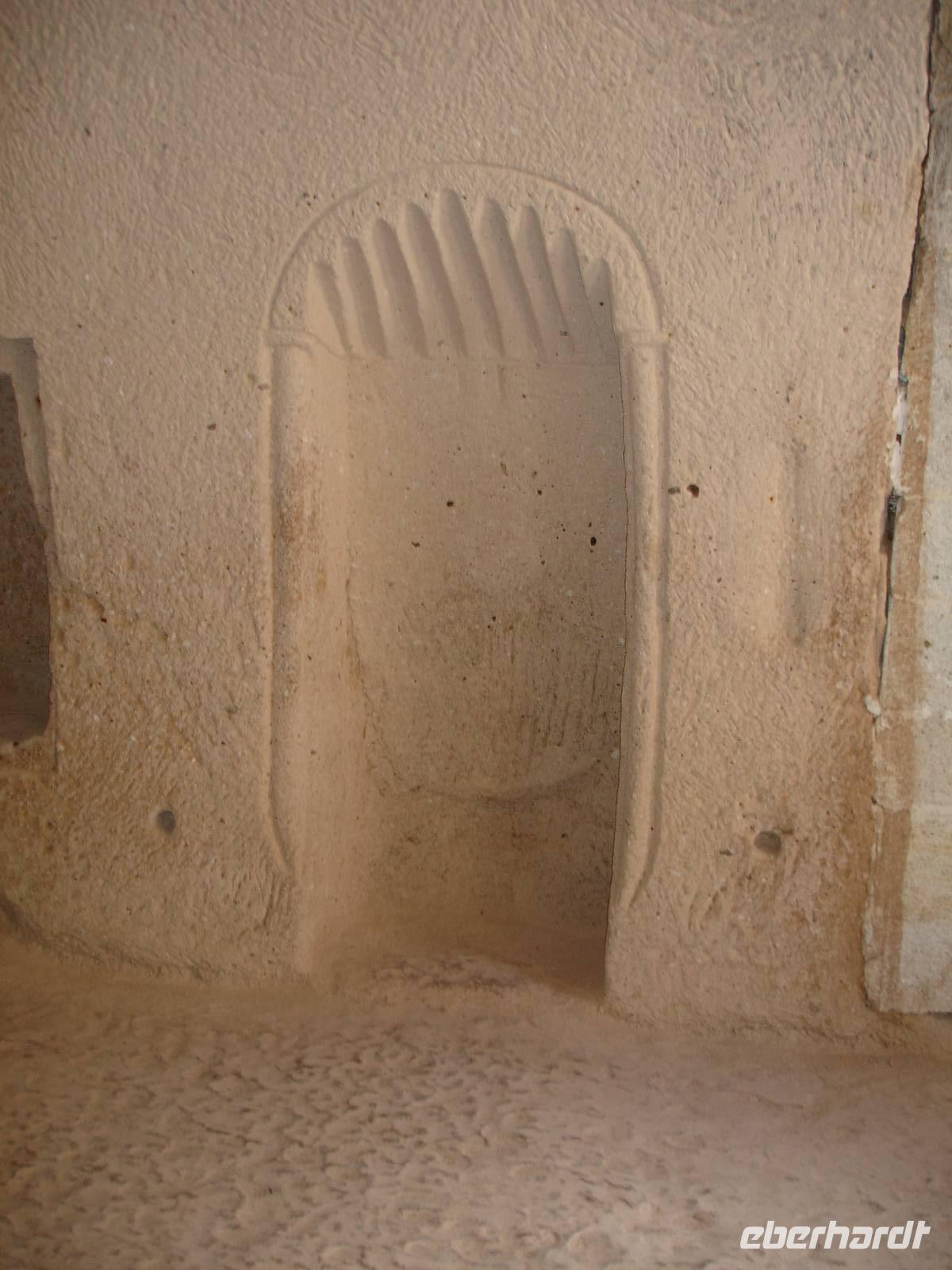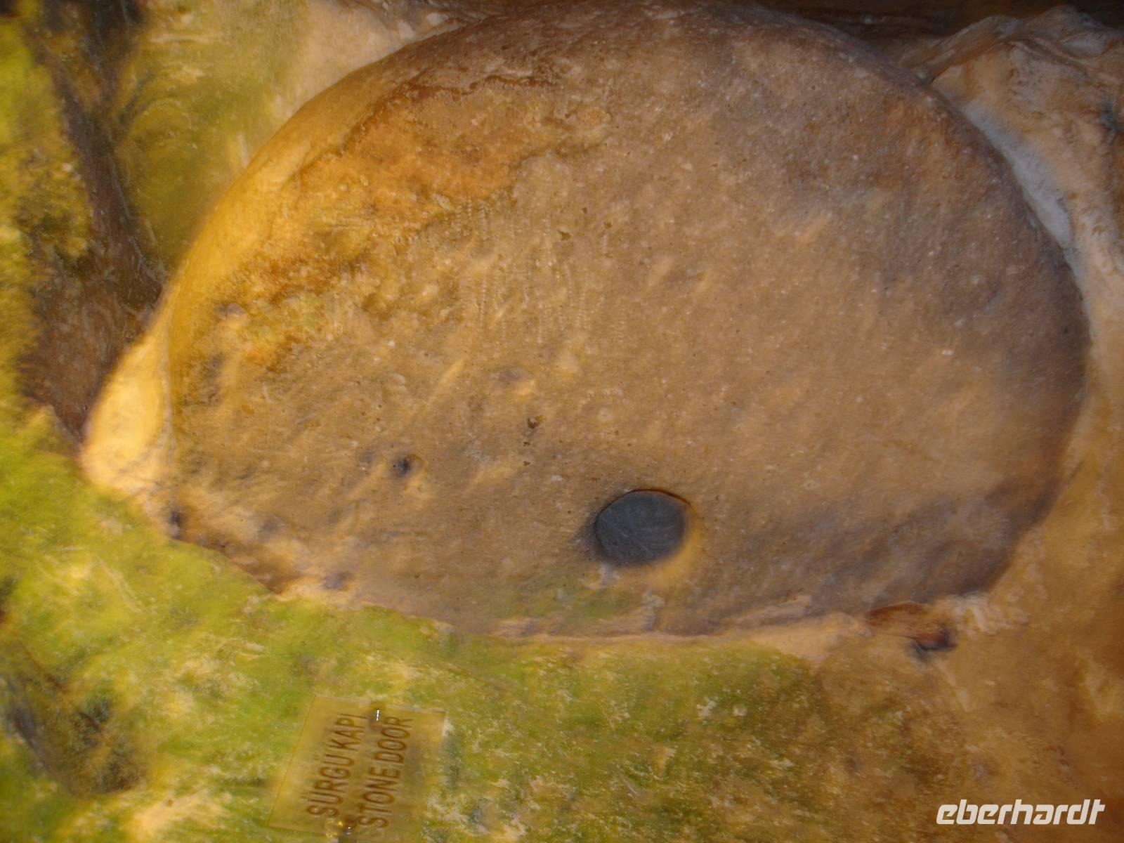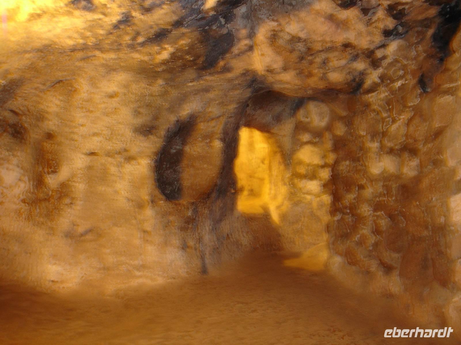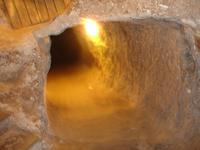 Gestärkt reisten wir weiter nach Derinkuyu und besuchten dort eine unterirdische Stadt. Von den 200 in Kappadokien entdeckten unterirdischen Städten, wobei nur 50 erschlossen wurden, ist die in Derinkuyu die Größte. Sie wurde zufällig 1963 entdeckt und ist 85 Meter tief. Wir stiegen bis zur 4. Etage hinab und konnten uns davon überzeugen, daß bei Gefahr für ein unterirdisches Leben mit belüfteten Wohnräumen, Stallungen, Kirche, Friedhof und auch Toiletten alles vorhanden war. Alle waren jedoch sehr erleichtert nach über 40 Minuten durch die sehr engen Gänge wieder hinauf das Tageslicht erblicken zu können.
