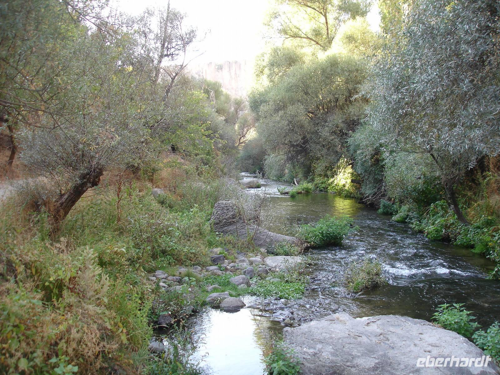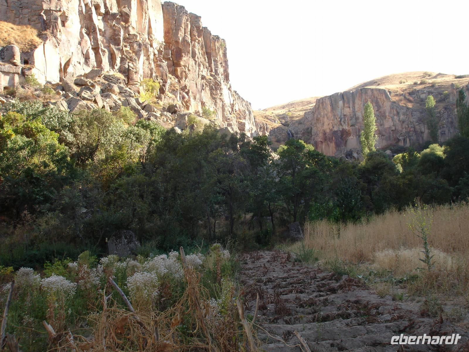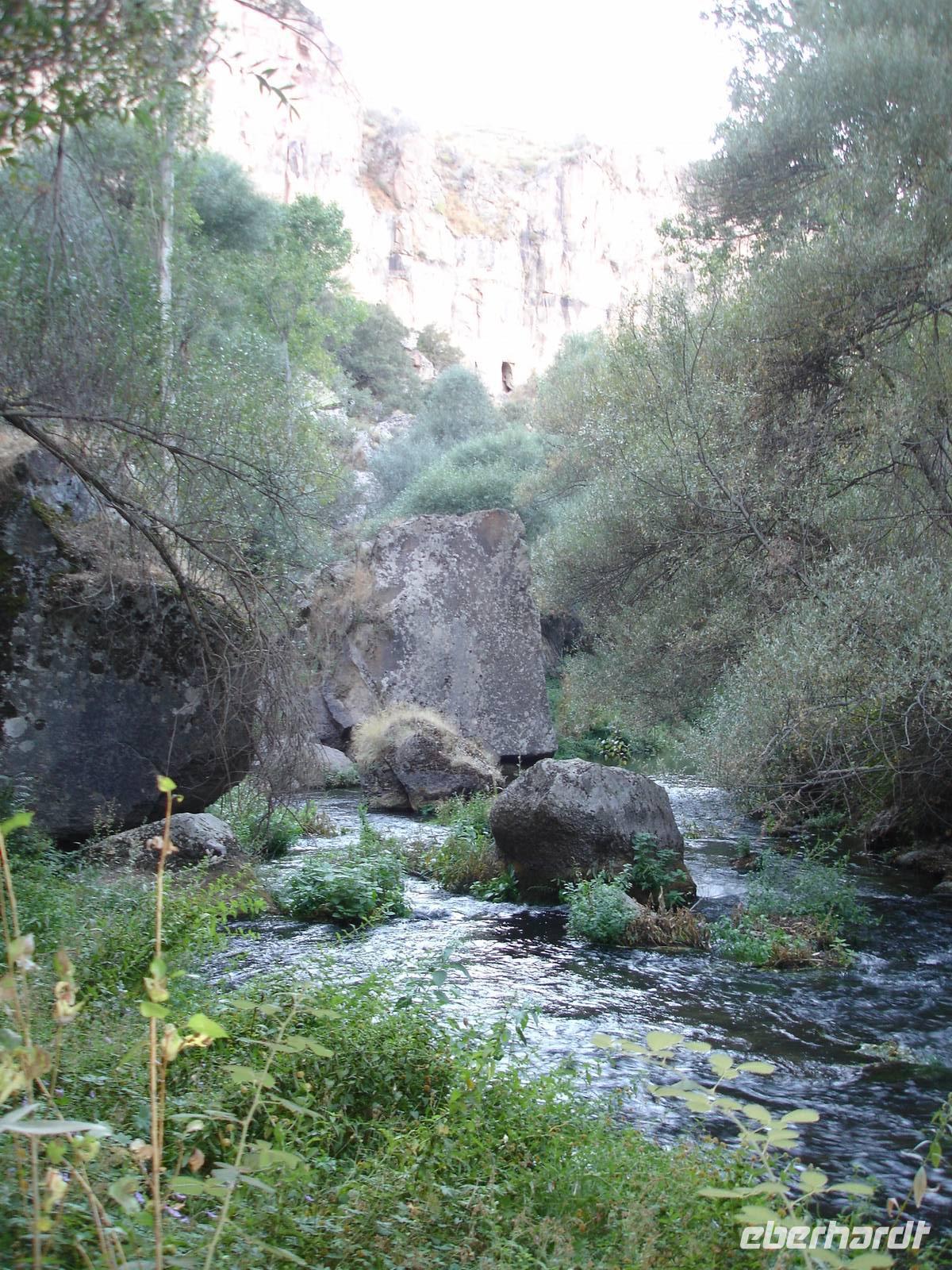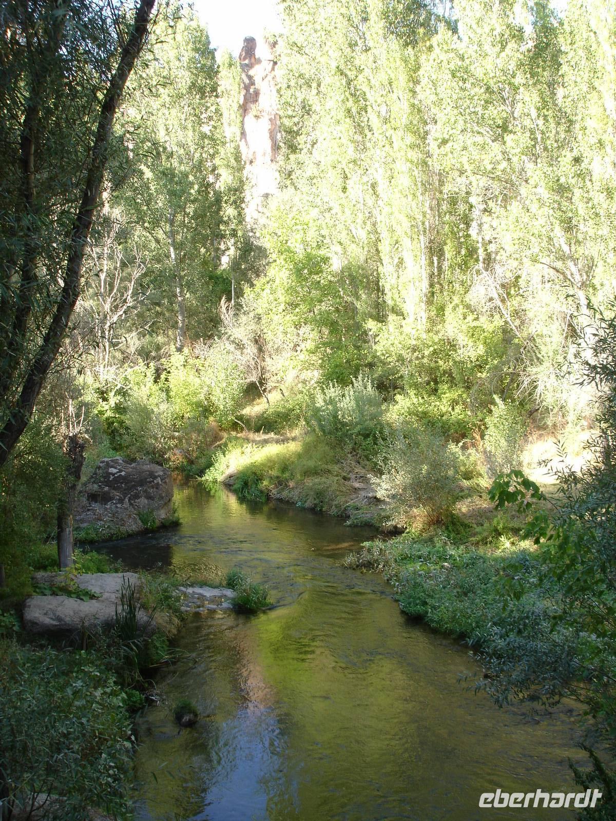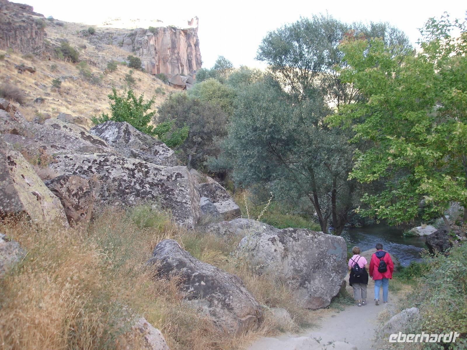 Unten angekommen begann eine ca. vier Kilometer lange Wanderung entlang dem Melendiz-Flusses, welcher sich idyllisch durch das Tal schlängelt. Steil abfallende Felshänge, schattige grüne Landschaften und Höhlenkirchen säumten unseren Weg. Nach mehr als einer Stunde erreichten wir das Ende der Schlucht, wo der Bus schon auf uns wartete. Trotz des angenehmen Spazierganges waren alle froh, nicht noch einmal so viele Stufen wieder hinauf steigen zu müssen. Es blieb jedoch die Frage - Was macht die Gruppe der Mountain-Biker, die uns auf dem Weg entgegen gekommen waren? Vierhundert Stufen aufwärts mit dem Bike oder doch lieber wieder zurück? "Die Anwort wußte allein nur der Wind."