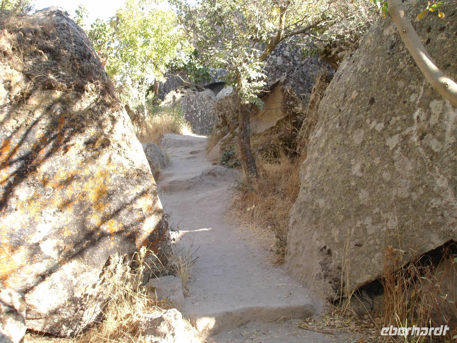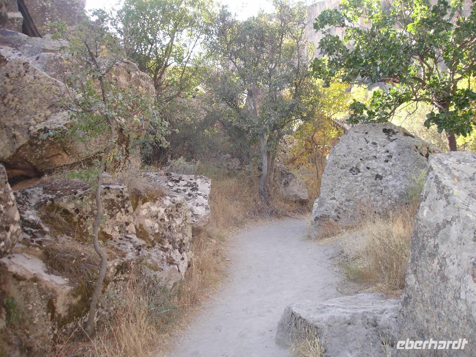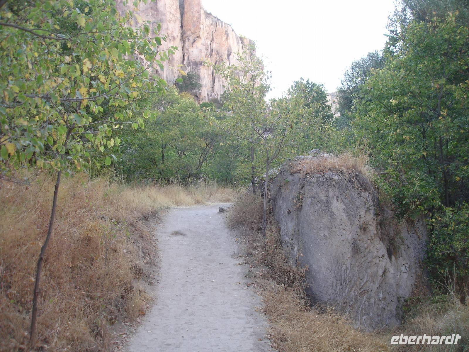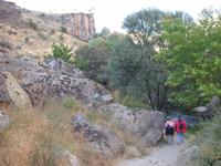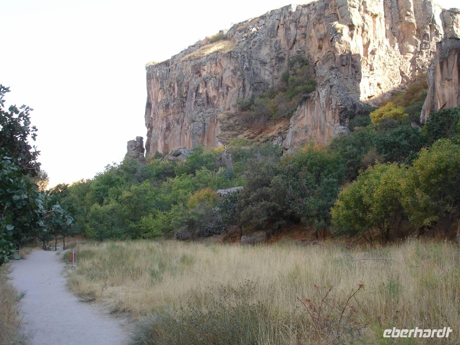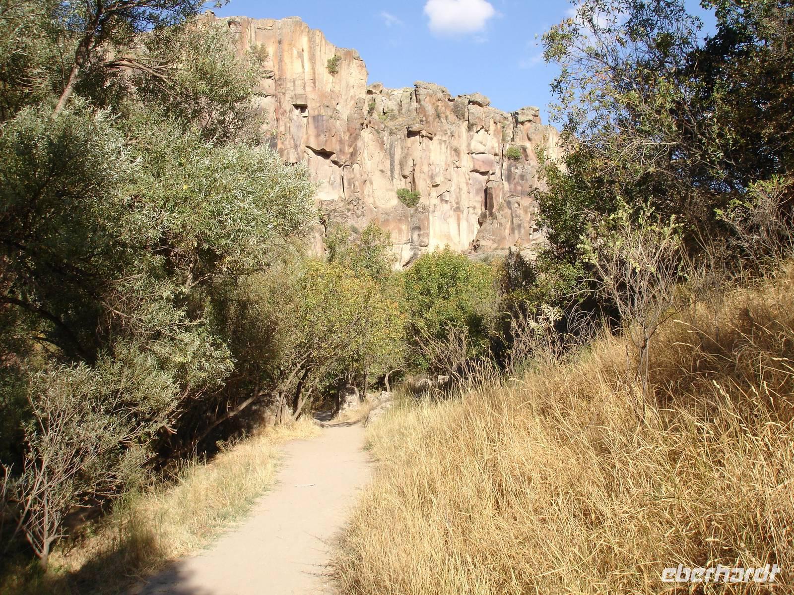 Unten angekommen begann eine ca. vier Kilometer lange Wanderung entlang dem Melendiz-Flusses, welcher sich idyllisch durch das Tal schlängelt. Steil abfallende Felshänge, schattige grüne Landschaften und Höhlenkirchen säumten unseren Weg. Nach mehr als einer Stunde erreichten wir das Ende der Schlucht, wo der Bus schon auf uns wartete. Trotz des angenehmen Spazierganges waren alle froh, nicht noch einmal so viele Stufen wieder hinauf steigen zu müssen. Es blieb jedoch die Frage - Was macht die Gruppe der Mountain-Biker, die uns auf dem Weg entgegen gekommen waren? Vierhundert Stufen aufwärts mit dem Bike oder doch lieber wieder zurück? "Die Anwort wußte allein nur der Wind."
