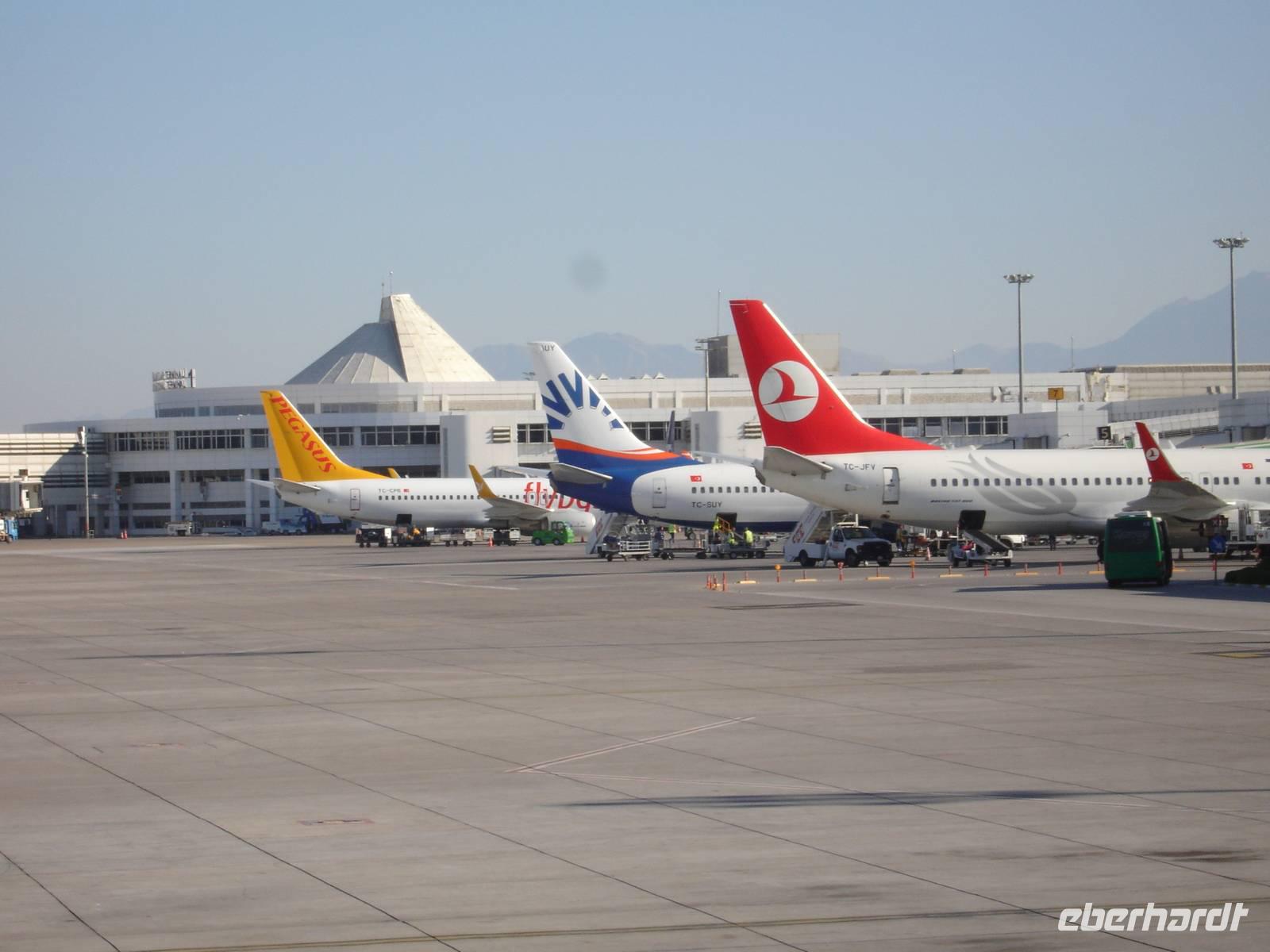 Durch die Haustürtransfere pünktlich zum Flughafen Leipzig gebracht, konnte unsere Reise beginnen. Gemeinsam wollten wir dem kühlen und regnerischem Wetter hier zu Hause entfliehen und dem Sommer nachreisen. Dazu flogen wir zunächst nach Istanbul, von wo es dann weiter nach Antalya ging. Das Flugzeug landete sogar 20 Minuten früher als vorgesehen in Istanbul, so dass wir in Ruhe zum Inlandterminal laufen konnten und das war gut so, denn der Weg dahin war ein weiter.Hier in Istanbul vergrößerte sich dann unsere Gruppe um die Gäste, welche von Berlin- Tegel angereist waren und gemeinsam flogen wir nach Antalya.