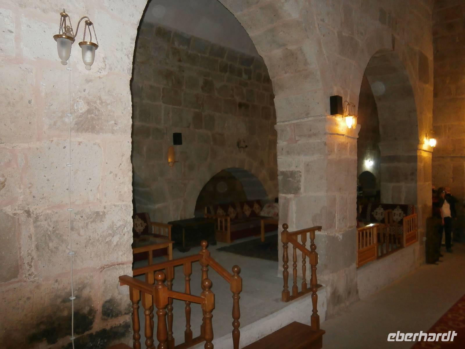 Der Tag beginnt mit dem Besuch der unterirdischen Stadt von Derinkuyu. Sie beherbergt die größte der berühmten unterirdischen Städte in der Region Kappadokien. Bereits seit dem vierten Jahrhundert finden sich in der Stadt Besiedlungsspuren. Das Tunnelsystem wurde 1963 zufällig entdeckt und seit dem wurden zahlreiche Passagen freigelegt. Wir stiegen hinab bis zur vierten Etage. Über enge und verwinkelte Gänge erreichten wir nach einer Stunde wieder die Oberfläche.
