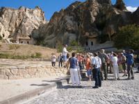 Nur wenige Kilometer entfernt stoppen wir in Cavusin. Die Besichtigung der hiesigen Felskirche steht auf dem Programm. Über der heutige Ortschaft erblicken wir bereits die zahlreichen in den Fels geschlagenen Bauten. Seit einem gewaltigen Felssturz ist ein Großteil des Innenlebens freigelegt. Ein kleiner Rundweg führt uns hinauf. Danach genießen wir noch einen typisch türkischen Tee bevor sich die Reise nach Avanos fortsetzt. Zum Abschluss des ersten Tages in Kappadokien statten wir der wohl berühmtesten Felsenstadt, Göreme, einen Besuch ab.Wir besichtigen das Freilichtmuseum mit den berühmten Felsenkirchen.