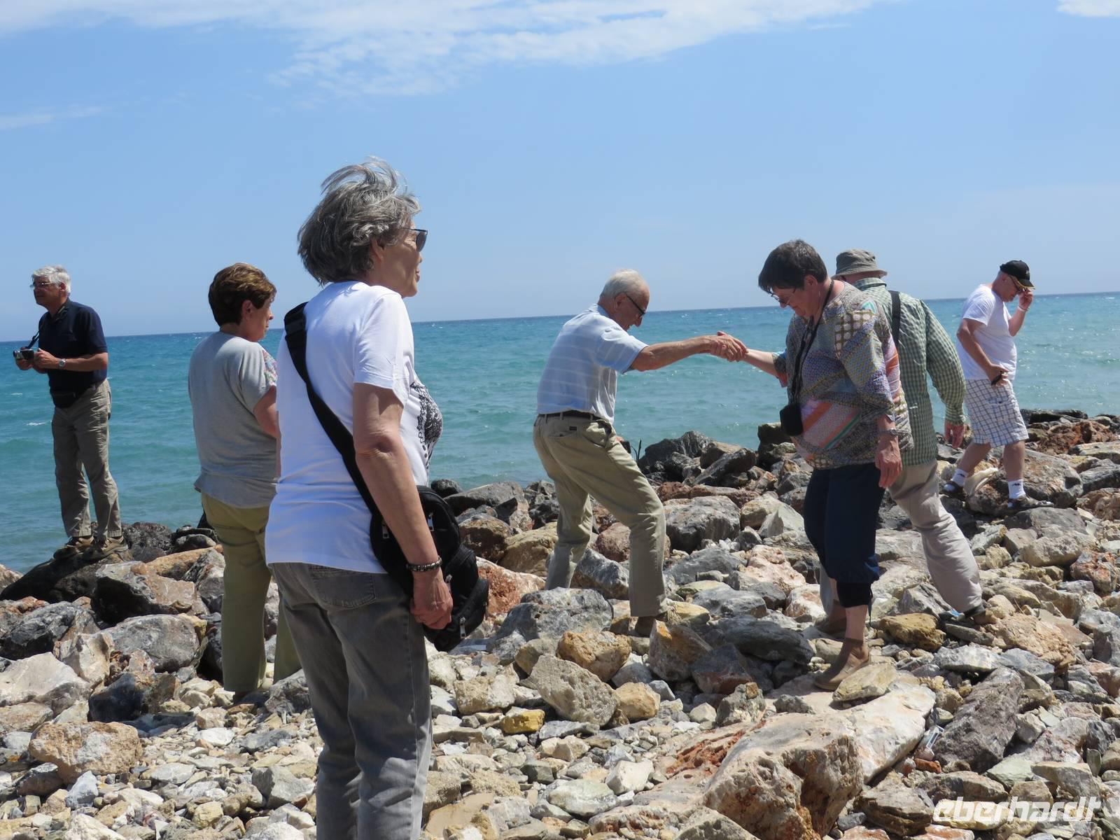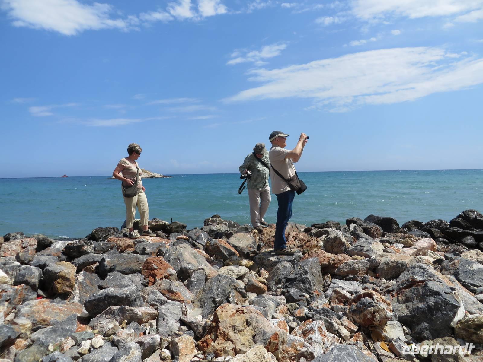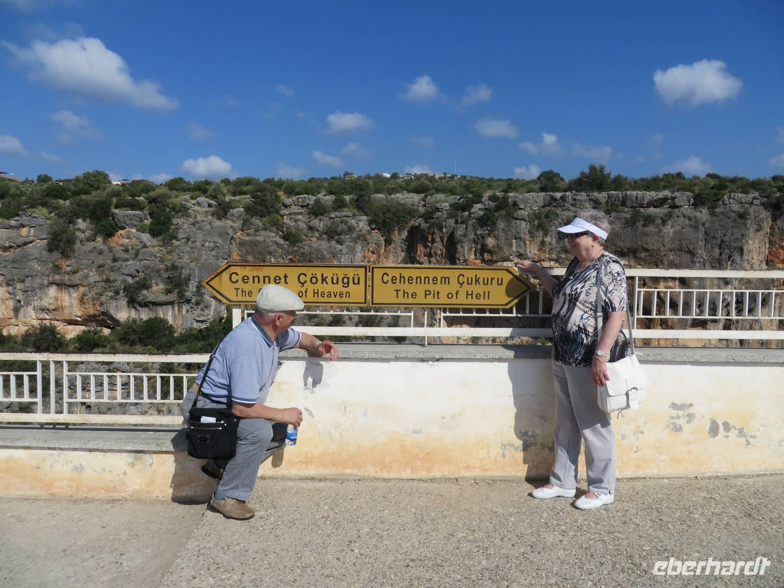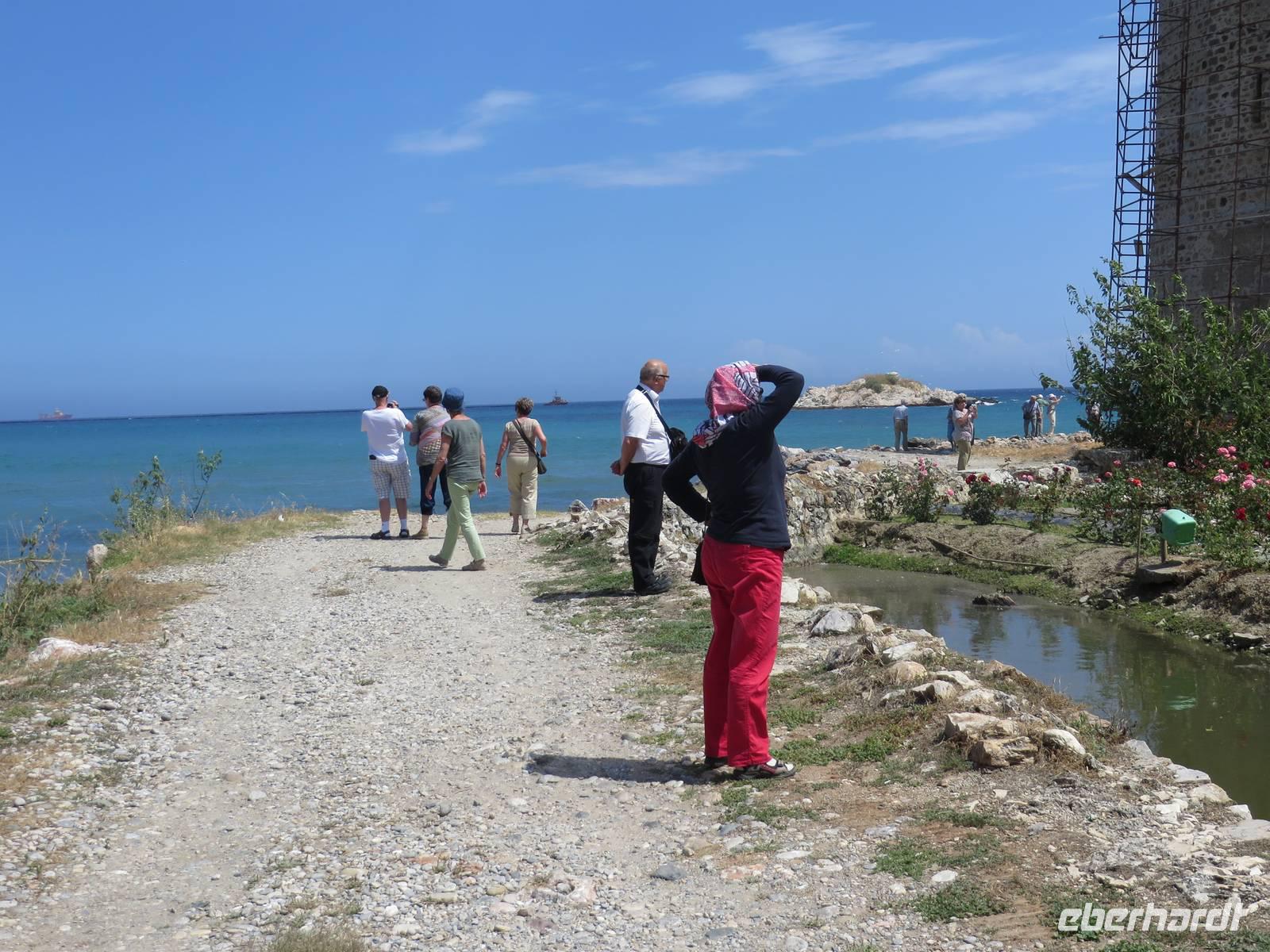 Wie geplant fahren wir heute als erstes zu den Korykischen Grotten. Bei diesen handelt es sich um zwei so genannte Dolinen - das sind Karsttrichter, also trichterförmige Senken mit rundem oder elliptischen Grundriss. Die Grotten werden Hölle und Paradies genannt, wobei die Hölle nicht zu begehen ist, da die Wände zu steil sind und es giftige Dämpfe geben soll. Zum Paradies hingegen führen 455 Stufen, die auch einige Gäste bewältigen. Selbst Herrmann kommt bis zur Mitte. Zum Mittagessen hat Serdar heute ein kleines Restaurant am Meer ausgesucht. Auf der Speisekarte steht heute Gözleme, eine anatolische Spezialität. Fladenbrote gefüllt mit Kartoffeln oder Käse oder wie Serdar sagt - grünem Zeugs - oder allem zusammen. Jedes Fladenbrot wird einzeln zubereitet, so dass es eine Weile dauert bis alle verköstigt sind. Um so länger können wir die erholsame Atmosphäre dieses schönen Ortes genießen. Einer der letzten Haltepunkte ist die Festung Marmure Kalesi, die besterhaltene mittelalterliche Burg an der türkischen Südküste. Sie ist nur von außen zu besichtigen, da sie seit Jahren rekonstruiert wird. Doch auch so bekommt man einen Eindruck von dem gewaltigen Bauwerk. Gegen 18 Uhr halten wir in Incekum-Alanya und verabschieden uns von zwei Gästen, die das Glück haben und noch eine Woche im 5-Sterne-All-Inklusive-Hotel Incekum Beach Resort verbringen werden. Alle anderen fahren weiter bis Antalya in unser Ausgangshotel Adonis. Da wir erst kurz vor 20 Uhr ankommen, müssen wir uns wieder sputen, um das reichhaltige Buffet plündern zu können.