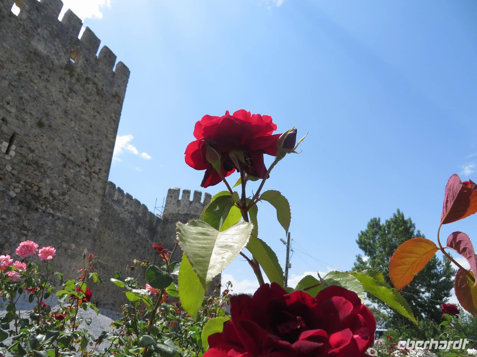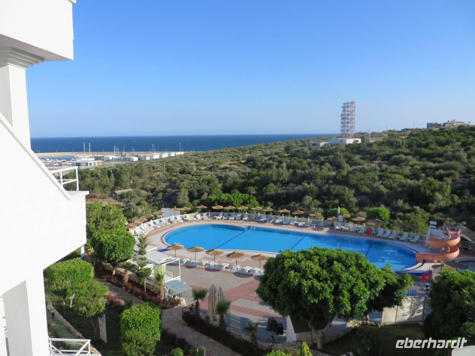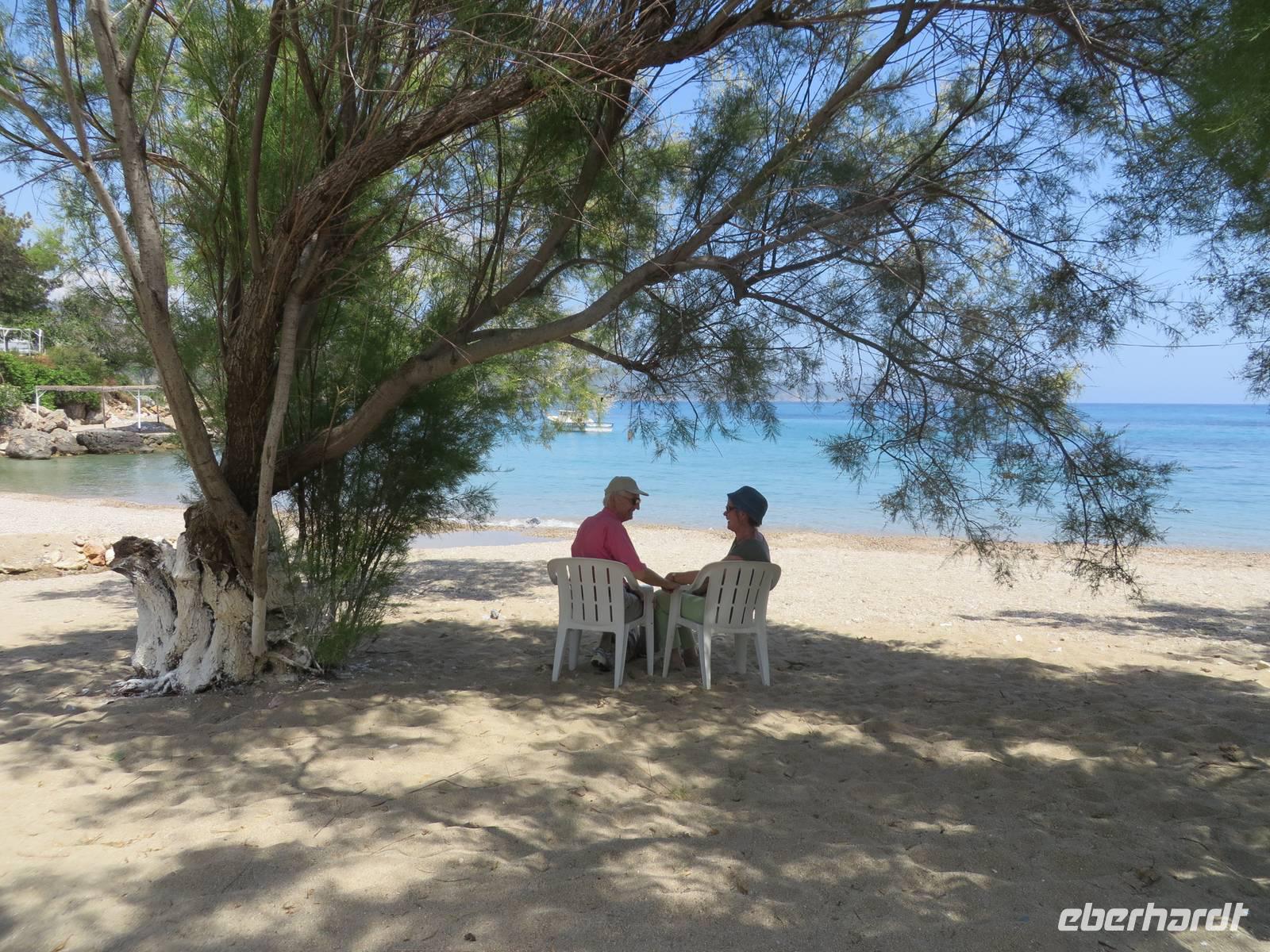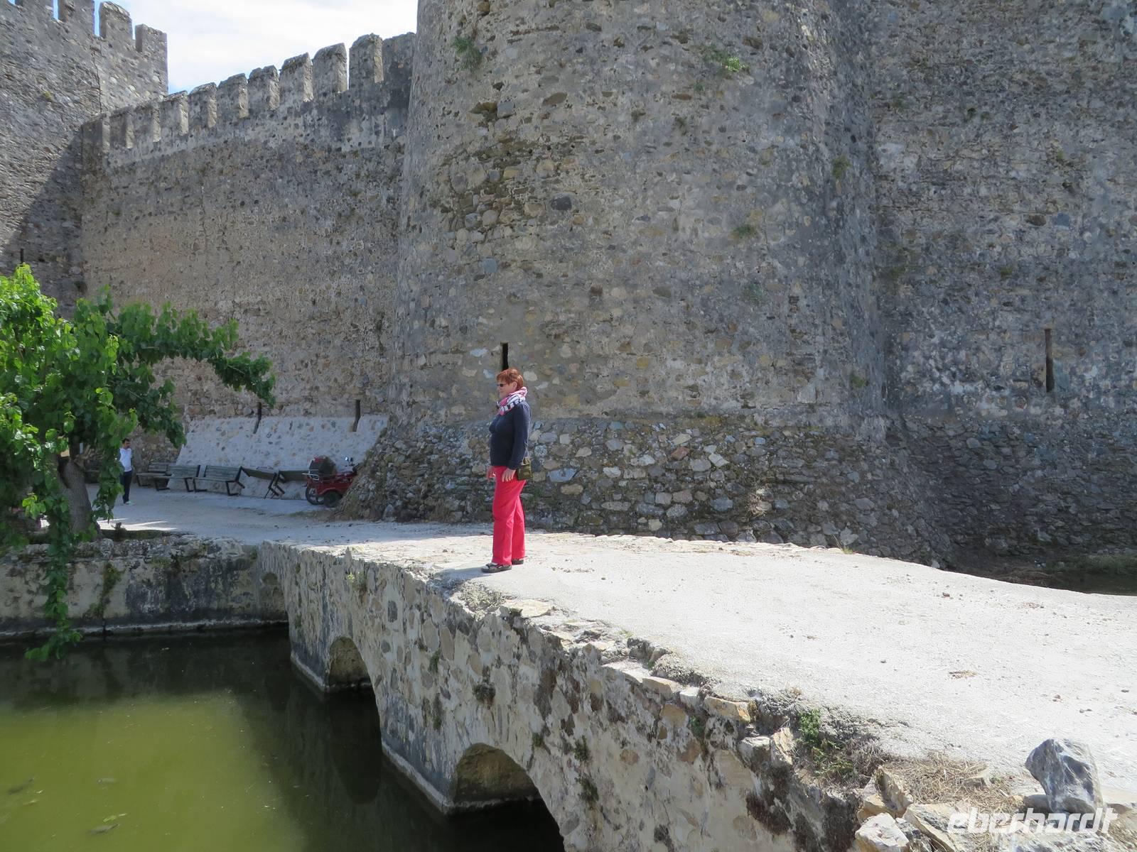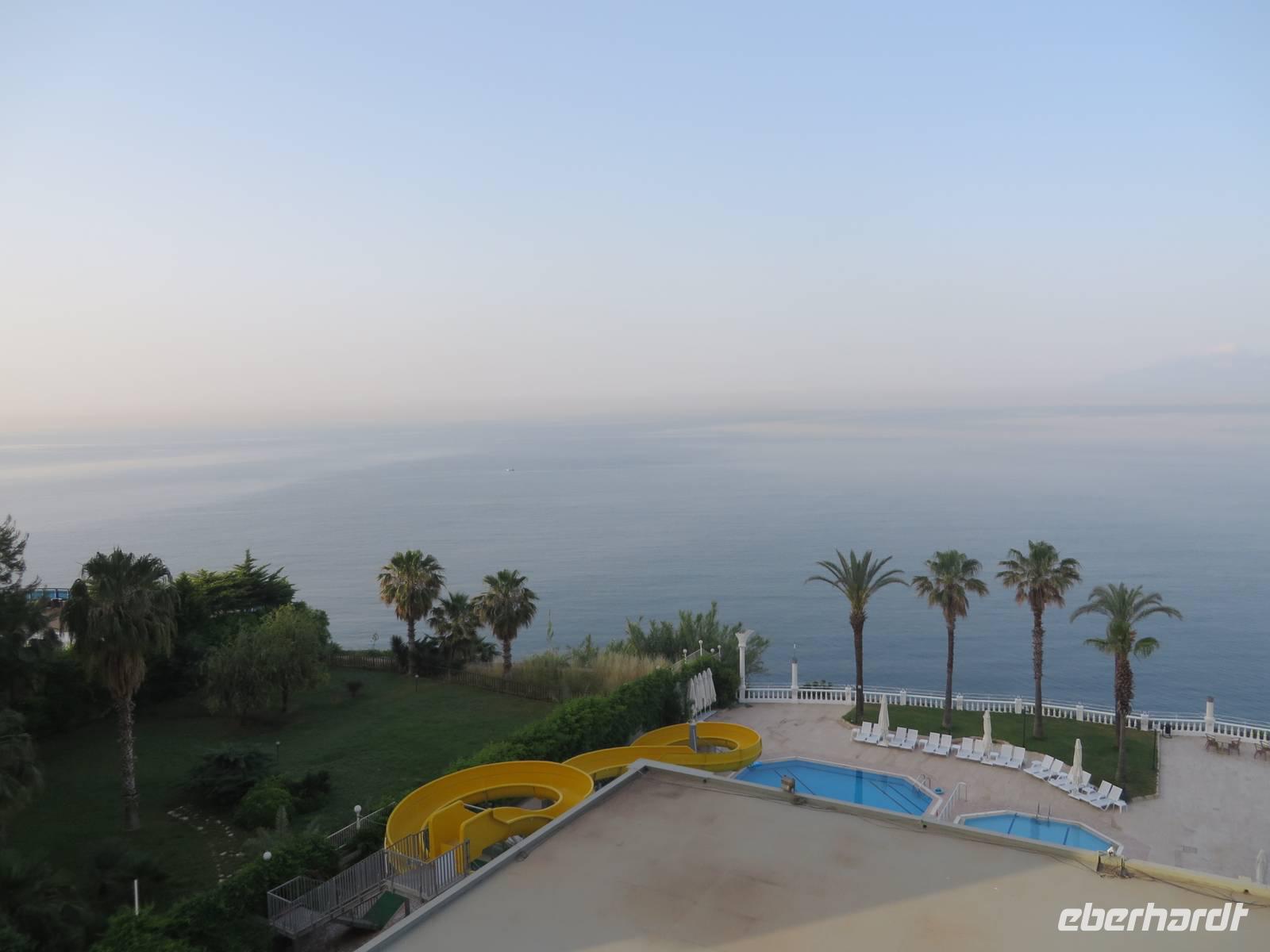 Wie geplant fahren wir heute als erstes zu den Korykischen Grotten. Bei diesen handelt es sich um zwei so genannte Dolinen - das sind Karsttrichter, also trichterförmige Senken mit rundem oder elliptischen Grundriss. Die Grotten werden Hölle und Paradies genannt, wobei die Hölle nicht zu begehen ist, da die Wände zu steil sind und es giftige Dämpfe geben soll. Zum Paradies hingegen führen 455 Stufen, die auch einige Gäste bewältigen. Selbst Herrmann kommt bis zur Mitte. Zum Mittagessen hat Serdar heute ein kleines Restaurant am Meer ausgesucht. Auf der Speisekarte steht heute Gözleme, eine anatolische Spezialität. Fladenbrote gefüllt mit Kartoffeln oder Käse oder wie Serdar sagt - grünem Zeugs - oder allem zusammen. Jedes Fladenbrot wird einzeln zubereitet, so dass es eine Weile dauert bis alle verköstigt sind. Um so länger können wir die erholsame Atmosphäre dieses schönen Ortes genießen. Einer der letzten Haltepunkte ist die Festung Marmure Kalesi, die besterhaltene mittelalterliche Burg an der türkischen Südküste. Sie ist nur von außen zu besichtigen, da sie seit Jahren rekonstruiert wird. Doch auch so bekommt man einen Eindruck von dem gewaltigen Bauwerk. Gegen 18 Uhr halten wir in Incekum-Alanya und verabschieden uns von zwei Gästen, die das Glück haben und noch eine Woche im 5-Sterne-All-Inklusive-Hotel Incekum Beach Resort verbringen werden. Alle anderen fahren weiter bis Antalya in unser Ausgangshotel Adonis. Da wir erst kurz vor 20 Uhr ankommen, müssen wir uns wieder sputen, um das reichhaltige Buffet plündern zu können.