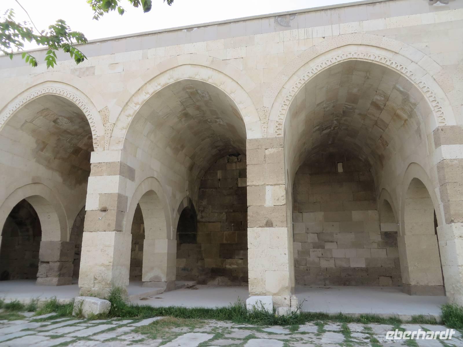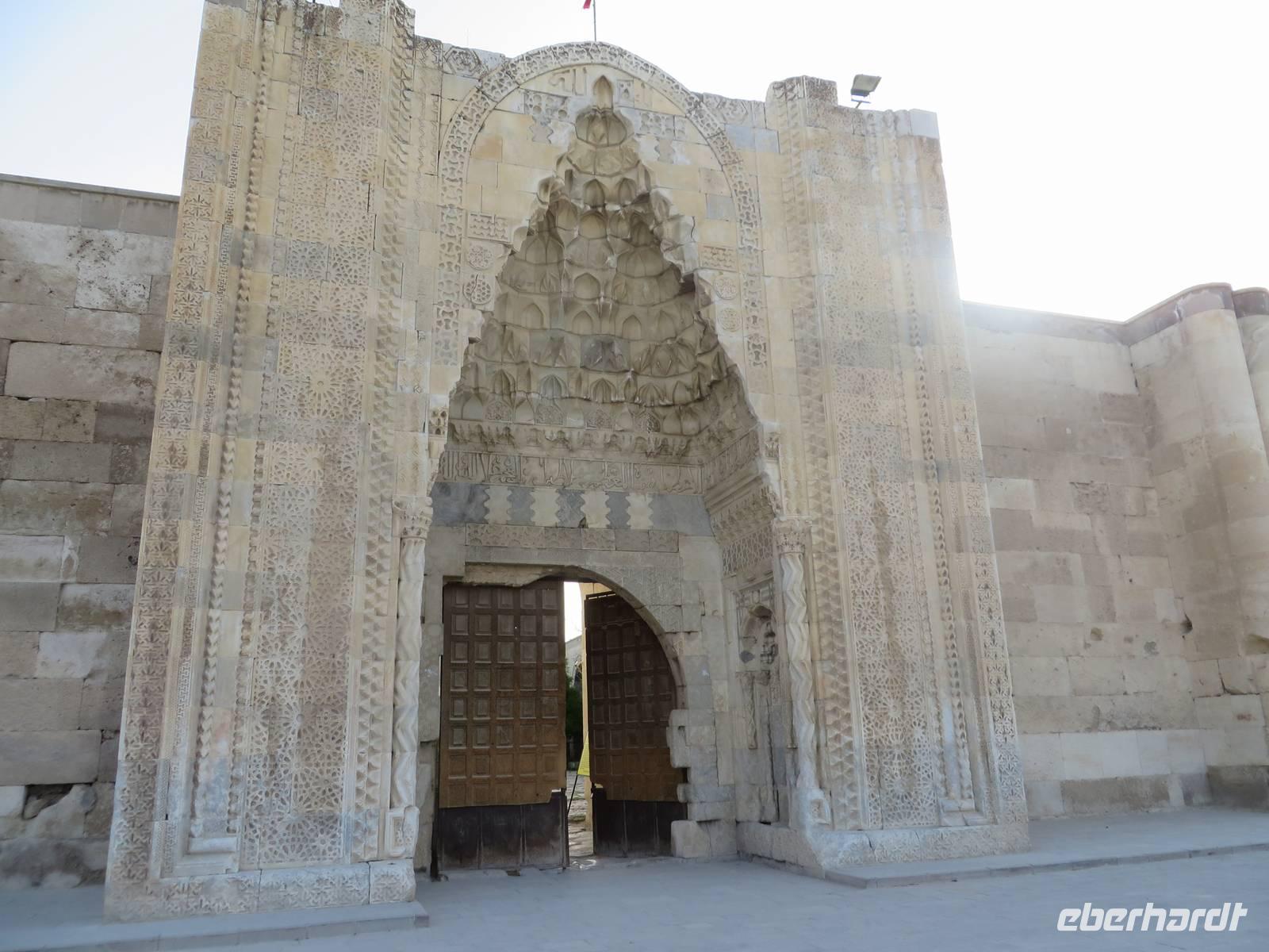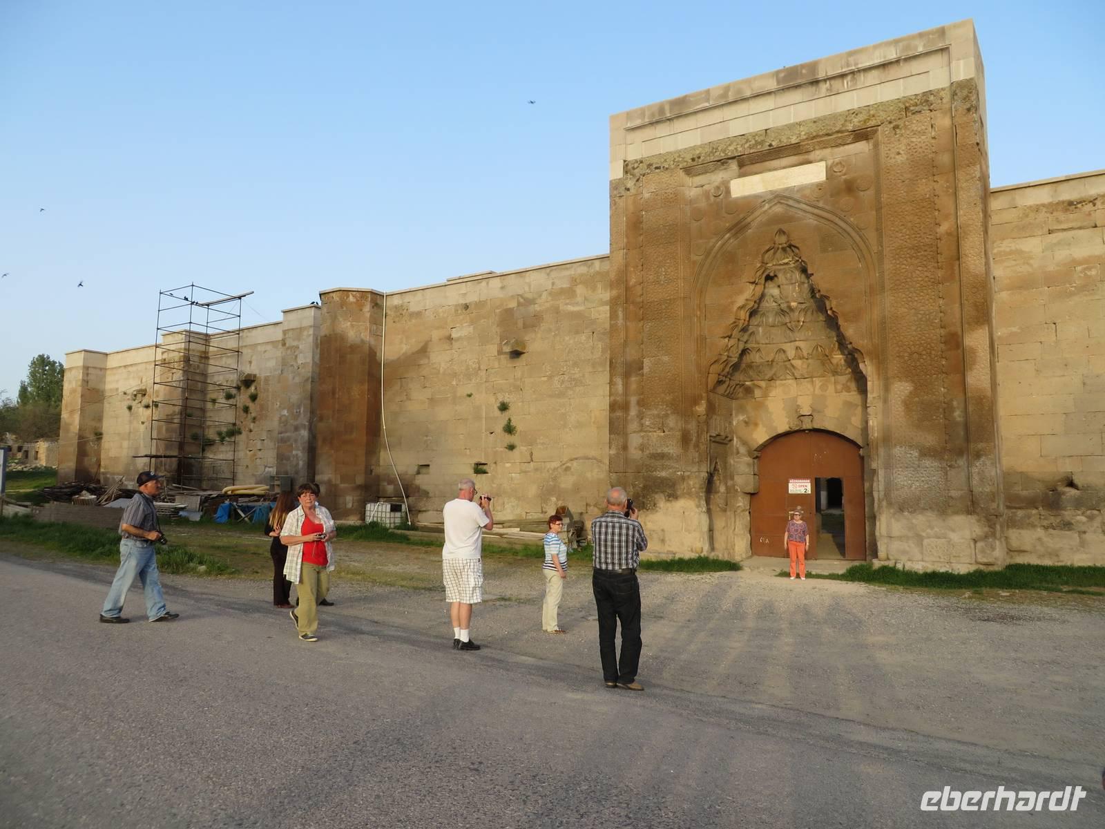 Eine lange Fahrt liegt heute vor uns. Serdar berichtet unterwegs, an welchen Orten wir vorbei fahren, die es zu besichtigen lohnt, die jedoch nicht auf unserem Programm stehen. Nach ca. 16 Kilometern streifen wir Perge. Die Besonderheit dieser Stadt liegt darin, dass sich hier in der Antike eine Hafenstadt befand und ein reger Seehandel statt fand, mitten im Land - nicht etwa an der Küste. Nach einer weiteren halben Stunde liegt Aspendos auf unserem Weg. Aspendos war einst die östlichste Stadt des Königreichs Pergamon. Zu seinen Hauptattraktionen gehört eines der am besten erhaltenen römischen Theater der Antike, bekannt auch durch „Wetten das" - die TV-Show wurde dort 2005 open Air aufgezeichnte. Leider haben wir keine Zeit, es zu besuchen. Wir legen einen Fotostopp an der Aspendosbrücke ein. So können wir wenigstens einen Hauch Geschichte atmen, denn diese einst neunbögige Brücke wurde wahrscheinlich im 4. Jahrhundert n. Chr. erbaut. In Manavgat haben wir die Möglichkeit unsere Euros in Türkische Lira zu tauschen. Den berühmten Wasserfall, von dem Serdar berichtet, bekommen wir nicht zu sehen, unser Weg ist weit, keine Zeit alle Sehenswürdigkeiten unterwegs zu besuchen. Weiter führt uns die Fahrt ins Taurus Gebirge. Gegen Mittag überqueren wir die höchste Stelle mit 1825 Metern Höhe. Im Taurus Gebirge dürfen Jäger Steinböcke und Wildschweine erlegen, die Jagd von Bären, Rehen und Hirschen dagegen ist verboten. Am Nachmittag besuchen wir das Mevlana Museum in der Nähe von Konya. Das Museum ist nach dem Sufi-Mystiker Celaleddin Rumi, der auch Mevlana genannt wurde, benannt. Dieser gründete im 13. Jahrhundert den Mevlevi-Orden, der bekannt wurde als Orden der tanzenden Derwische. Das Gelände ist gut besucht und wir haben Mühe, uns nicht zu verlieren. Über den marmorgepflasterten Hof, in dessen Mitte sich der Reinigungsbrunnen befindet, gelangen wir zunächst zum Mausoleum. Hier sind mehrere Sarkophage auf Podesten aufgestellt. Diese sind mit prachtvoll bestickten Tüchern bedeckt und gewaltige Turbane thronen auf ihnen. Weiter gibt es zwei Gebetsräume, einen für Männer und einen für Frauen. Außerdem sind Manuskripte aus verschiedenen Zeiten in Glasvitrinen ausgestellt. Das älteste ist eine Koranhandschrift auf Gazellenhaut. Im Anschluss besuchen wir die Küche. Hier mussten junge Männer, die Mönch werden wollten, eine 100tägige Probezeit absolvieren. Heute sind dort Nachbildungen des damaligen Alltags anzuschauen. Während wir die Küche besuchen, ist gerade eine Gruppe Männer anwesend, die alle ein weißes Gewand tragen und eine Art Gebetsritual vollziehen. Auf dem Innenhof ist eine weitere Männergruppe unterwegs, die alle die gleiche Kopfbedeckung tragen. Serdar spricht auf Nachfrage davon, dass es sich um sektenartige Gruppen handelt, die sich (angeblich) für etwas Besonderes halten. Um 17 Uhr erreichen wir die Karawanserei Sultanhani. Im 13. Jahrhundertbauten die Seldschuken über 100 Karawansereien, Herbergen für Kaufleute, die auf den Karawanenrouten entlang der römisch-byzantinischen Straßen unterwegs waren. Die Sultanhani wurde 1226 - 29 für Sultan Alaeddin Keykubad erbaut und gehört zu den besterhaltenen seldschukischen Karawansereien. Durch das zentrale Tor, dem einzigen Eingang in jede Karawanserei betreten wir den zentralen Hof. Dieser ist von Arkaden umgeben, wo die Kaufleute Schutz vor der Sonne fanden. An den Seiten sind Räume zu besichtigen, die einst als Unterkünfte dienten. Auch ein Hamam durfte natürlich nicht fehlen, in dem die erschöpften Reisenden Erholung fanden. Große Lagerhallen boten viel Platz für die Lagerung der mitgebrachten Waren, zu denen Seide und Gewürze gehörten und auch Sklaven, die als wichtige Handelsware galten. Serdar besichtigt mit uns im Anschluss noch eine weitere Karawanserei, die aber bei weitem nicht so gut erhalten ist wie Sultanhani. Am späten Abend erreichen wir unser Hotel Dilek Kaya in Ortahisar, das uns für die nächsten vier Tage als Quartier dient.