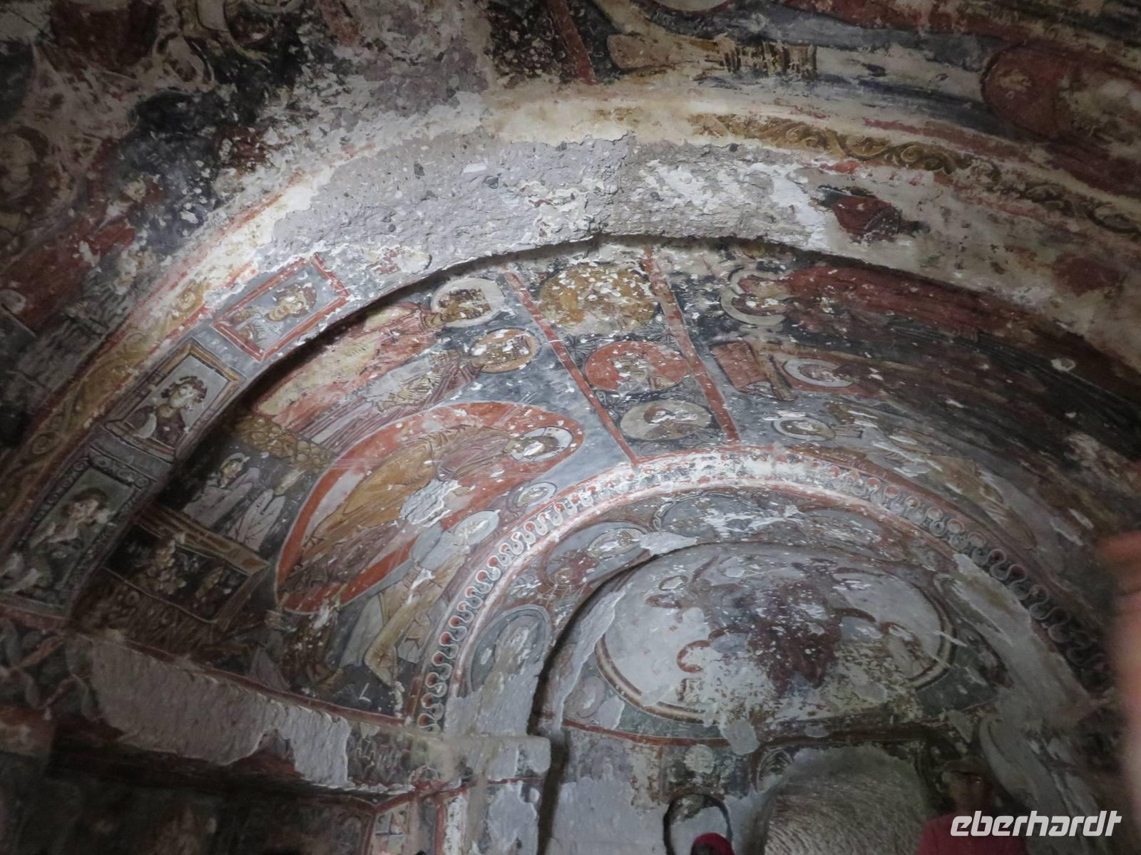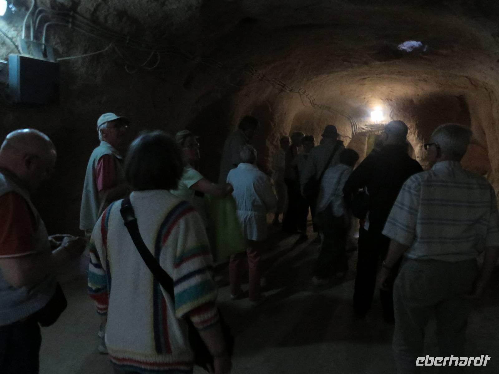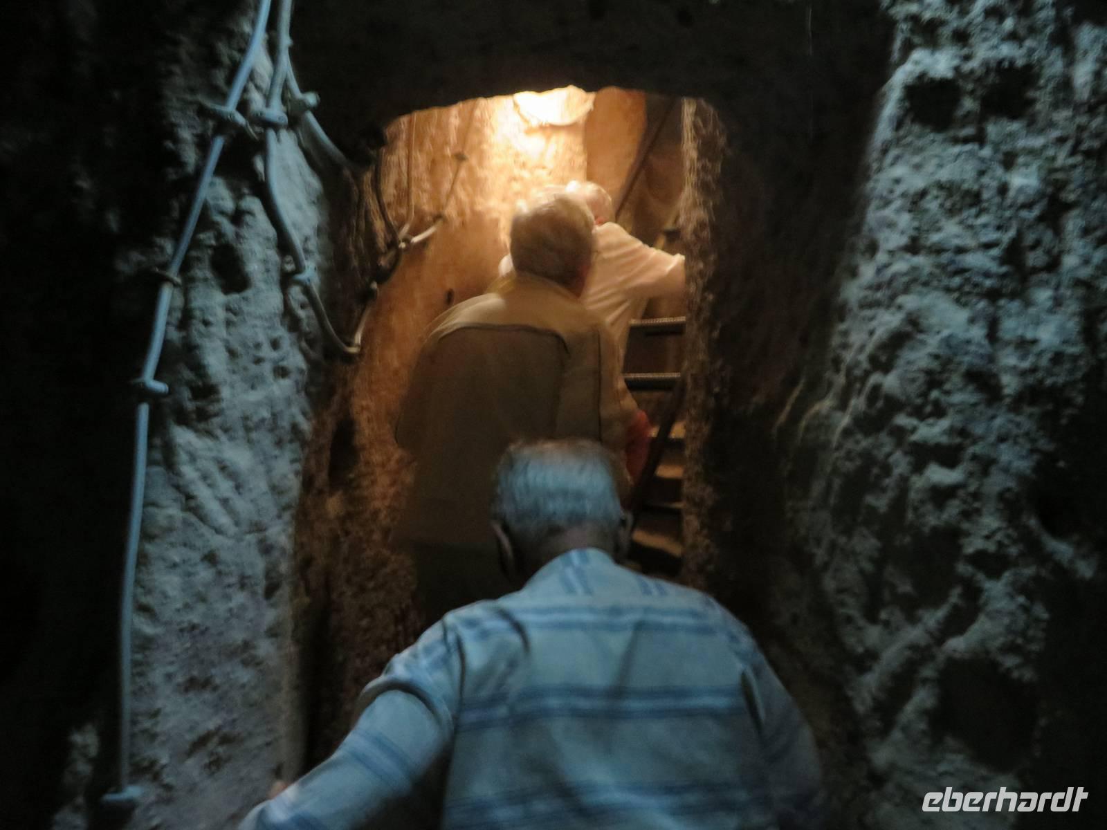 Für einige Gäste beginnt der Tag heute sehr früh. Bereits um 4 Uhr stehen wir vor dem Hotel und warten auf unseren Fahrer, der uns zur Startstation unseres Ballons bringen soll. Bald trifft dieser auch ein. Unterwegs steigen noch ein paar Asiaten in unseren Bus. Bevor wir an unserem Startplatz ankommen, sehen wir unterwegs viele andere Plätze, an dem Heißluftballons vorbereitet werden. Endlich dürfen wir aussteigen. Vor uns liegt ein gelbbunter Ballon auf der Erde und auch der Korb liegt noch auf der Seite. Doch zum Ritual gehört, dass wir zunächst mit Keksen und Tee bewirtet werden. Begleitet wir dieses Minifrühstück vom lauten Zischen der Gasflamme, die die Luft im Ballon erwärmt. Langsam richtet der sich auf. Mehrere Männer halten Seile fest, damit der Ballon nicht unverhofft alleine aufsteigt. Und schon geht es los. Wir müssen den Korb erklimmen. Gar nicht so einfach. Herrmann wird einfach von zwei Männern an Armen und Beinen gepackt und in den Korb gehievt, er hat keine Chance, sich dagegen zu wehren. In vier „Abteilen" haben jeweils sechs Ballonfahrer Platz. Der Pilot befindet sich in der Mitte. Immer wieder ertönt das laute Zischen der Gasflamme. Nachdem wir unsere Sicherheitsübung absolviert haben (Hinhocken und Festhalten bei der Landung), steigt unser Ballon langsam auf. Es ist einfach traumhaft. Mit Worten kaum zu beschreiben. Alles, was wir gestern zu Fuß besichtigt haben, überfliegen wir heute mit dem Ballon. Unter uns breiten sich die faszinierenden Felsformationen aus. Überall um uns herum schweben bunte Ballons durch die Luft - gefühlt müssen es hunderte sein (in Wahrheit sind es höchstens einhundert, denn die Anzahl der erlaubten Flüge ist begrenzt). Unser Pilot weiß, wie er seine Passagiere glücklich machen kann. Geschickt lässt er den Ballon so fliegen, dass sich der Korb immer mal wieder dreht, so dass jeder in alle Richtungen schauen kann. Manchmal fliegt er direkt über den Felsen, so dass man fast aussteigen könnte oder befürchtet, er würde gegen die Felsen stoßen. Aber das passiert nicht, unser Pilot ist sehr geschickt, wie sehr, das werden wir später noch merken. Nun geht es aber erst einmal hoch hinaus. Bei 400 Metern wird die Höhe angesagt und noch einmal bei 600 Metern. Trotzdem schleicht sich kein Schwindelgefühl oder Höhenangst ein. Die Stimmung ist toll. Alle sind fröhlich und äußern dies auch mit lautstarken Bewunderungsrufen. Nach etwa einer Stunde sehen wir, dass die ersten Ballons zur Landung ansetzen. Unser Pilot kommuniziert aufgeregt mit seinen Helfern, um den Landeplatz auszumachen. Wir schweben über eine Landstraße in Richtung einer Wiese. Hier haben die Männer einen kleinen LKW abgestellt, mit dem später der Korb und der Ballon wieder abtransportiert werden sollen. Wir nähern uns dem Landeplatz und wollen gerade unsere vorher geübte Landeposition einnehmen, als unser Pilot sagt, das wäre nicht nötig, uns erwarte eine softe Landung. Was genau er damit meint, erfahren wir in der nächsten Minute. Millimeter genau landet er direkt auf dem LKW. Unglaublich! Keine Erschütterung, kein Wackler, nichts. Einfach so. Zack, rauf auf den Anhänger. Wir sind wirklich beeindruckt. Nun krabbeln wir wieder mehr oder weniger geschickt aus dem Korb und schauen zu, wie der Ballon langsam zu Boden sinkt. Doch noch ist das Erlebnis nicht zu Ende. Ruck zuck haben unsere Gastgeber einen Tisch mit Getränken aufgebaut. Die Sektflasche wir mit großem Brimborium geköpft, wir stoßen an auf das tolle Erlebnis und erhalten noch jeder eine Urkunde zur Erinnerung. Dann heißt es wieder einsteigen in den Bus und zum Frühstück sind wir wieder im Hotel. Nun sind wieder alle dabei. Nach dem Frühstück geht es zum Dorf Mustafapasa, ehemals Sinasos. 1923 mussten hier die ursprünglich griechischen Bewohner bei einem Bevölkerungsaustausch zwischen der Türkei und Griechenland ihr Dorf verlassen. Einer Sage nach, haben sie ihr ganzes Erspartes zusammen gelegt, davon einen Fotoapparat gekauft, ihr Dorf Stück für Stück abfotografiert und dann in Griechenland wieder aufgebaut. Serdar erzählt uns die Geschichte und noch andere in einem kleinen türkischen Kaffeehaus, wo er uns zu schwarzem oder Apfeltee einlädt. Anschließend bleibt noch ausreichend Zeit, das kleine Dorf, das leider von Verfall geprägt ist, auf eigene Faust zu erkunden. Unsere Fahrt führt uns nun nach Soganli. Das Tal ist umgeben von hohen Felswänden, die irgendwie an den Grand Canyon erinnern. Wir besuchen eine kleine Kirche (6 von ehemals 100 gibt es noch) mit wunderschön erhaltenen Fresken. Zum Mittagessen kehren wir in ein kleines Gartenrestaurant ein, dessen Besitzer sich rührend um uns kümmert und uns seine köstlichen Spezialitäten serviert. Auf schnurgerader Straße fahren wir weiter zu unserem nächsten Ziel - das Ihlara Tal. Hier haben wir eine Stunde Zeit, um am wildromantischen Fluss Melindiz spazieren zu gehen. Zum Abschluss kann, wer will, noch einen Tee genießen. Schon wartet die nächste Attraktion auf uns - die unterirdische Stadt. Für uns ist es der zweite Versuch, beim ersten waren wir zu spät, um 19.30 Uhr machte hier keiner mehr auf. Heute aber können wir die unterirdische Stadt besichtigen. Wieder einmal heißt es, nur zu staunen. Wir erfahren, dass die Bewohner der Region ganze Städte unterirdisch angelegt hatten, zehn bis zwanzig Etagen hat man gefunden. Wohnräume, Schlafräume, Küchen, Lagerhallen, Weinkellereien, sogar Räume für Verstorbene wurden angelegt. Verschlossen wurden die Eingänge mit großen Mühlsteinen. Schmale Gänge sollen die Städte untereinander verbunden haben. Noch lange ist nicht alles erforscht und ausgegraben. Wir schlängeln uns durch die schmalen Gänge und über steile Pfade durch die zur Besichtigung frei gegebenen Räume. Respekt vor den damaligen Erbauern! Der krönende Abschluss erwartet uns jedoch vor den Toren der Stadt. Hier hat es sich eine Gruppe von Frauen zur Aufgabe gemacht, mit lautem
