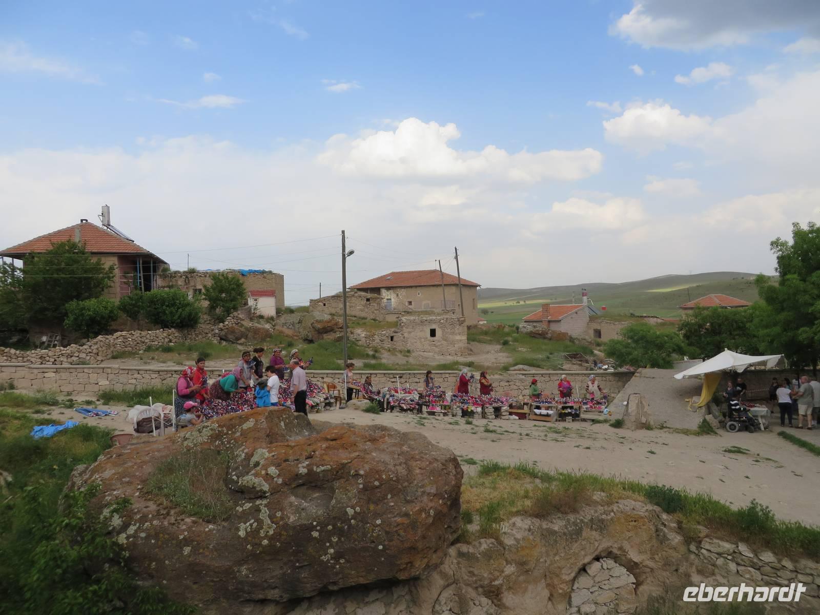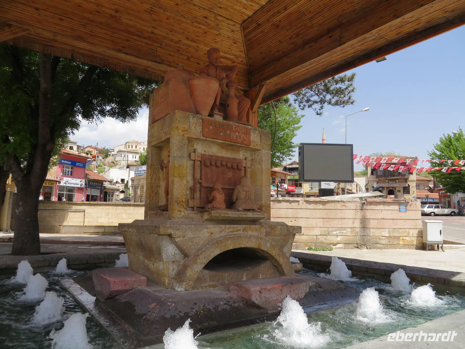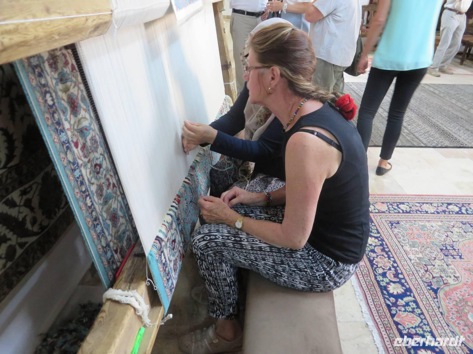 Den Vormittag verbringen wir heute damit, türkisches Handwerk kennen zu lernen. Wir beginnen mit dem Besuch einer Teppichmanufaktur. Hier werden in Handarbeit kostbare Teppiche geknüpft. Wir erfahren, dass der Staat die Manufakturen finanziell fördert, um einerseits zu verhindern, dass diese Tradition ausstirbt, denn moderne türkische Mädchen wollen nicht mehr mit der Hand Teppiche knüpfen und andererseits die Landflucht zu stoppen, also Menschen, die in den Dörfern wohnen, eine sinnvolle Arbeit zu verschaffen, auf die sie stolz sein können und mit der sie ihr Geld verdienen. Zunächst zeigt uns eine junge Frau, wie aus den Puppen der Seidenraupe die feinen Fäden gewonnen werden. Im nächsten Raum sitzen die Knüpferinnen. Wer möchte, kann es selbst einmal ausprobieren - es ist nicht so einfach. Eine Ausbildung dauert zwei Jahre, zur Meisterin wird man in vier Jahren. Nun werden wir im Kreis platziert, Tee oder Kaffee, auf Wunsch auch mit Raki, wird serviert. Jetzt werden vor uns die schönsten Teppiche ausgebreitet. Es ist nicht zu leugnen, dass es sich um Kunstwerke handelt - schön sind sie ja. Nach der Präsentation besteht die Möglichkeit, sich individuell beraten zu lassen. Eine ganze Stunde harren wir höflich aus und lassen die Händler gewähren. Trotzdem sind wir irgendwie froh, als die Prozedur vorbei ist. Auf dem Weg nach Cavusin legen wir einen Stopp in Avanos ein. Heute können wir die Hängebrücke trocken überqueren, das Atatürkdenkmal und die Moschee fotografieren. In Cavusin besuchen wir eine Töpferei. Eine kleine Schale oder Vase oder was auch immer, kann man sich schon eher leisten als ein mehrere tausend Euro kostenden Teppich. In der Keramikwerkstatt erfahren wir zunächst etwas über die Herstellung der Waren und warum die hier hergestellten Produkte viel wertvoller sind, als ähnliche auf dem Markt. Wir schauen dabei zu, wie ein Arbeiter aus einem Klumpen Lehm eine Dose zaubert. Auch hier besteht die Möglichkeit, dass es jemand ausprobiert. Na so was, warum will denn keiner? So bleibt mir nichts weiter übrig, als mich in mein Schicksal zu ergeben. Ich muss eine überdimensionale Arbeitshose anziehen und werden an der Drehscheibe platziert. Hände nass machen und immer schön den Tonklumpen formen. Die Lacher sind nicht zu überhören. Was in der Phantasie meiner Gäste vor sich geht, erwähne ich an dieser Stelle lieber nicht. Aber irgendwann bin ich entlassen und freue mich, dass sich meine Gäste so prächtig amüsiert haben. Im Shop haben wir ausreichend Zeit, ein paar Kleinigkeiten einzukaufen. Mittags sind wir zurück im Hotel. Nach einer kurzen Pause geht es bereits weiter. Wir fahren nach Kayseri. Aus Kayseri kommt die beste sucuk (Salami) der Türkei und pastirma (Räucherwurst) ist eine regionale Spezialität. So ist es auch nicht verwunderlich, dass wir unsere Mittagspause im Schinkenpark einlegen und dort die Spezialitäten kosten können. In Kayseri besuchen wir die Moschee und den überdachten Basar. Serdar und ich kaufen in einem Feinkostgeschäft für Süßigkeiten türkischen Honig, den unsere Gäste auf dem Rückweg verkosten dürfen. Nach ausgiebiger Freizeit fahren wir zurück.