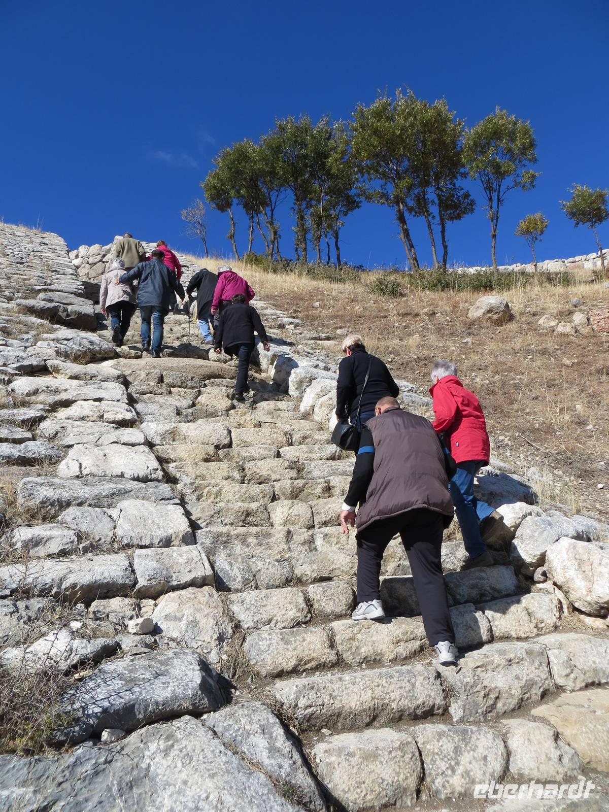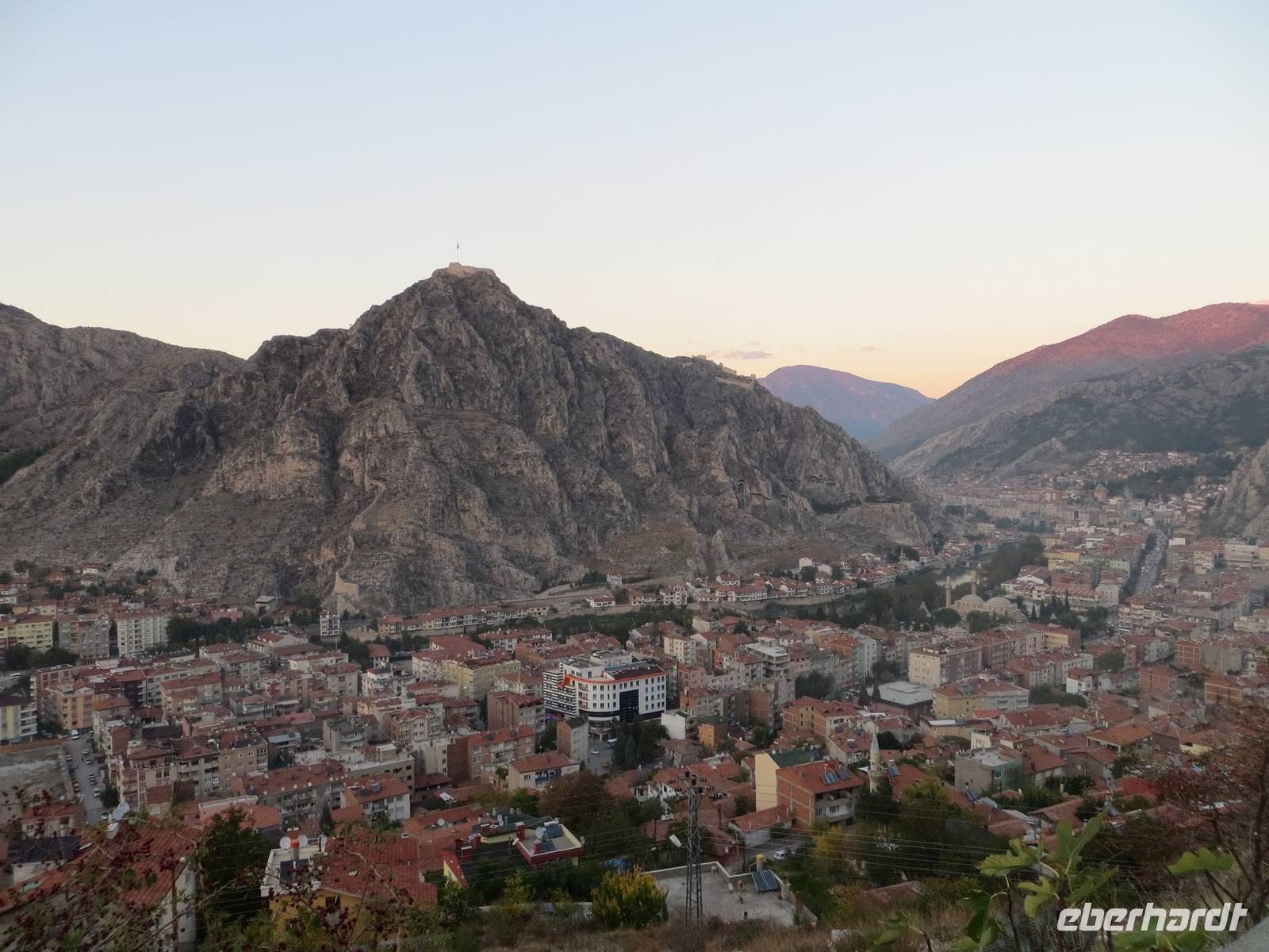 Die Reise führte nach Hattuscha zur ehemaligen Hauptstadt der Hethiter. Hier befand sich vor 3500 Jahren die Residenz einer der bedeutendsten Hochkulturen Kleinasiens. Die großflächige Ausdehnung der Dorf-, Palast- und Tempelanlagen, teilweise eingefasst durch einen riesigen Wall mit beindruckenden Toren (Löwen-, Soldaten- und Königstor) faszinierte alle; dazu ein toller Blick in die hügelige Herbstlandschaft. Nach dem typisch türkischen Mittagessen entdeckten wir das hethitische Felsheiligtum Yazilikaya mit seinen in den Felsen gemeißelten Reliefs von Göttern und Göttinnen. Am Nachmittag ging es weiter nach Amasya, einer Stadt mit malerischen Gebäuden am Yesilirmak Fluss. Über den Gebäuden erhebt sich steil eine Felswand mit Felsengräbern pontischer Herrscher. Da die Dämmerung bald in Dunkelheit überging, führen wir zunächst zu einer Aussicht gegenüner den Gräbern und dann nochmals an das Flussufer zu einem kurzen Bummel. Bei einer steilen Auffahrt mit dem Bus zum Hotel hatten wir dann nochmals schöne Blicke auf das nun beleuchtete Amasya wie auch später beim abendlichen Blick vom Hotelrestaurant.