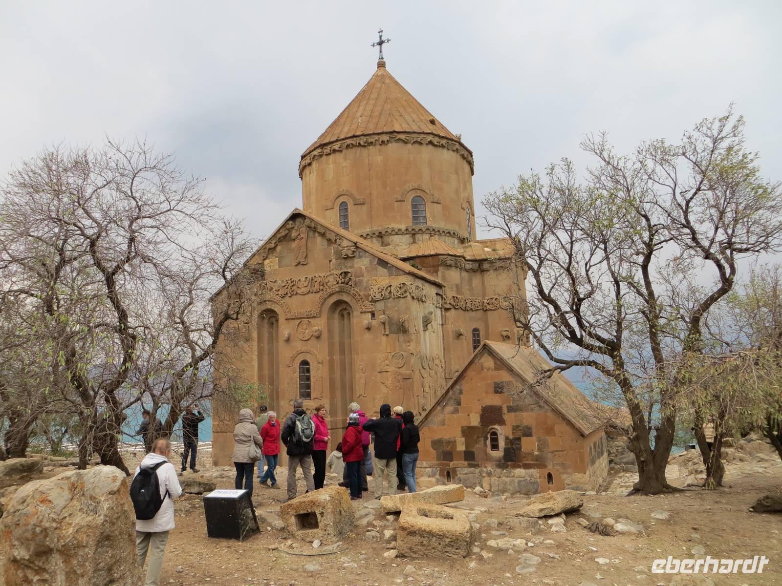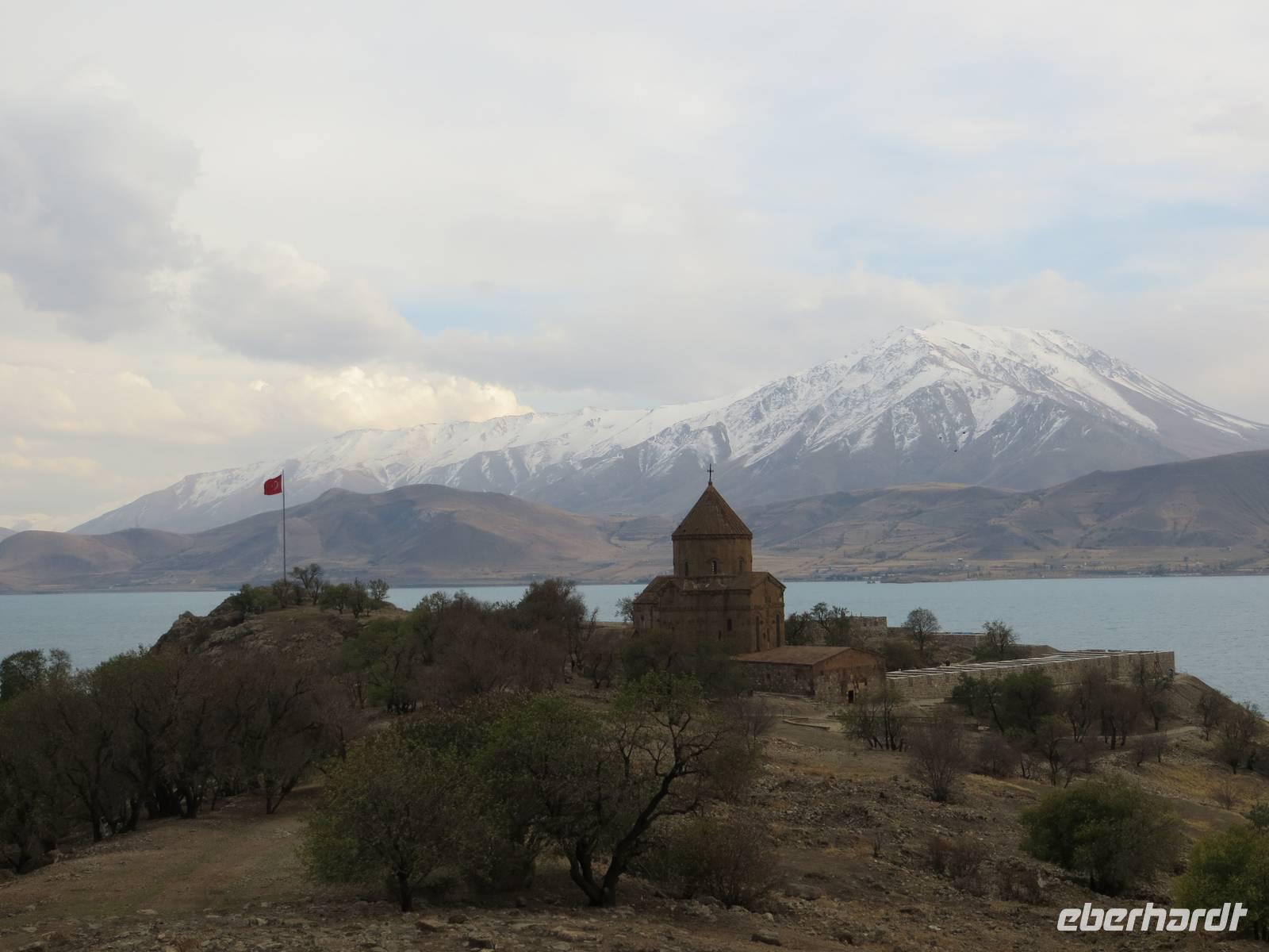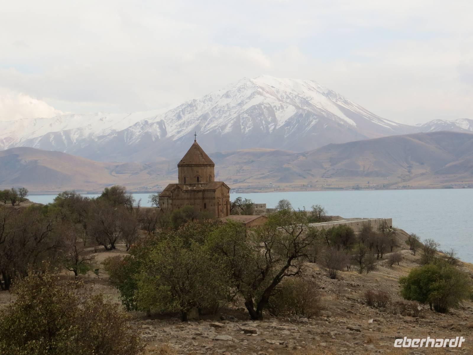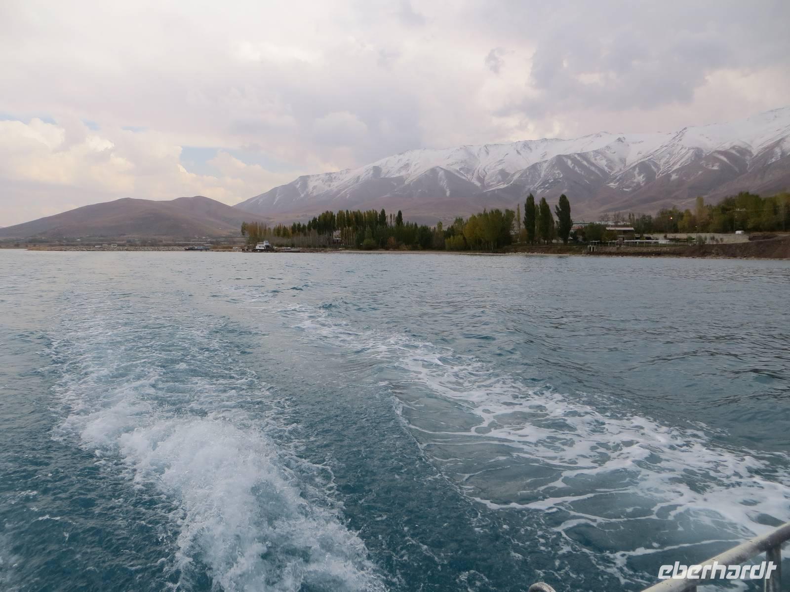 In einer regionalen Kelim-Kooperative erfuhren wir am Vormittag mehr über die Besonderheiten der orientalischen Kelims und der traditionellen Teppichknüpferei. Eindrucksvoll waren insbesondere die Darstellungen der multiethnischen Vielfalt der Motive und Farbauswahl für die Teppiche. In einer fruchtbaren Ebene vor schon schneebedeckten Bergen im iranischen und irakischen Grenzgebiet erhebt sich der Felsrücken von Cavustepe. Hier besichtigten wir nach schmalgratiger Busauffahrt die Überreste einer urartäischen Festung und genossen einen beeindruckenden Blick in die Steppe. Mit Hilfe eines der wenigen Sprachkundigen der urartäischen Schriftsprache ließen wir uns die Keilschrift erklären. Nach der Mittagspause am Van-See starteten wir zu einer Bootsfahrt zur Klosterinsel Akdamar. Es hatte sich empfindlich abgekühlt, ein fast eisiger Wind war aufgekommen und wir waren wohl die fast letzten Gäste für dieses Jahr. Die beeindruckenden Reliefs auf den Fassaden der altarmenischen Kirche beschreiben neben religiösen Themen auch irdische Themen wie das Palastleben, Jagdszenen, Mensch- oder Tierfiguren. Im Inneren der seit 2005 sich in Renovierung befindlichen Anlage sind die Wände voller christlicher Motive. Nach der Rückfahrt über den See dann die Weiterfahrt mit dem Bus nach Tatvan.