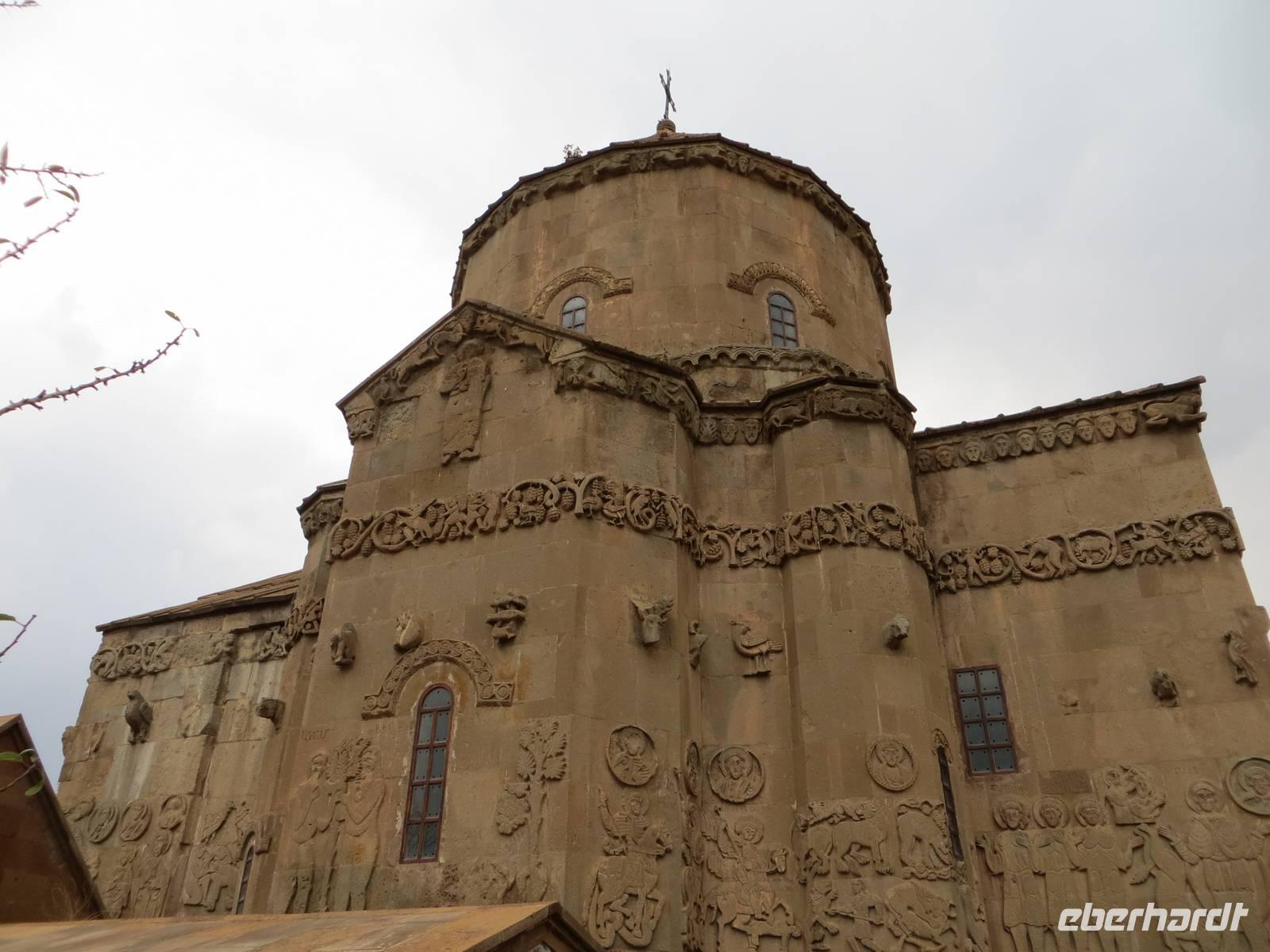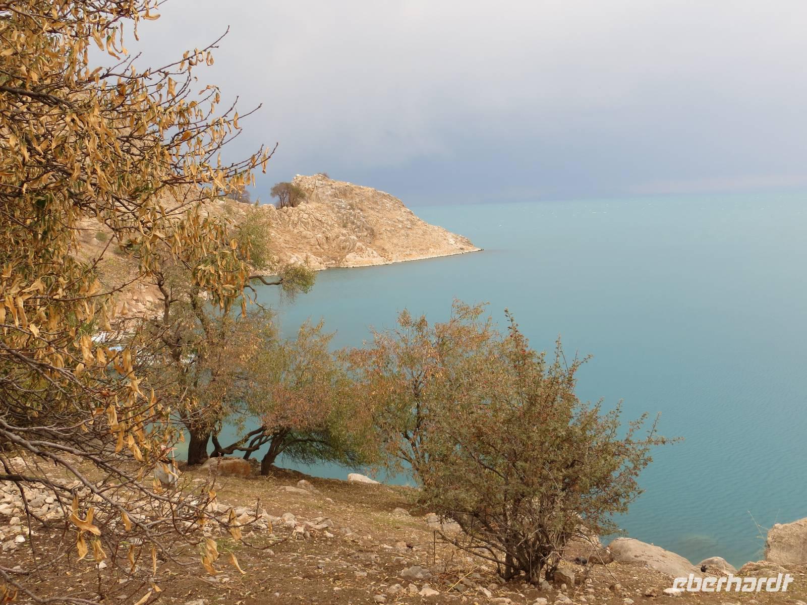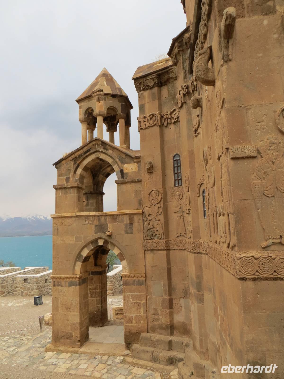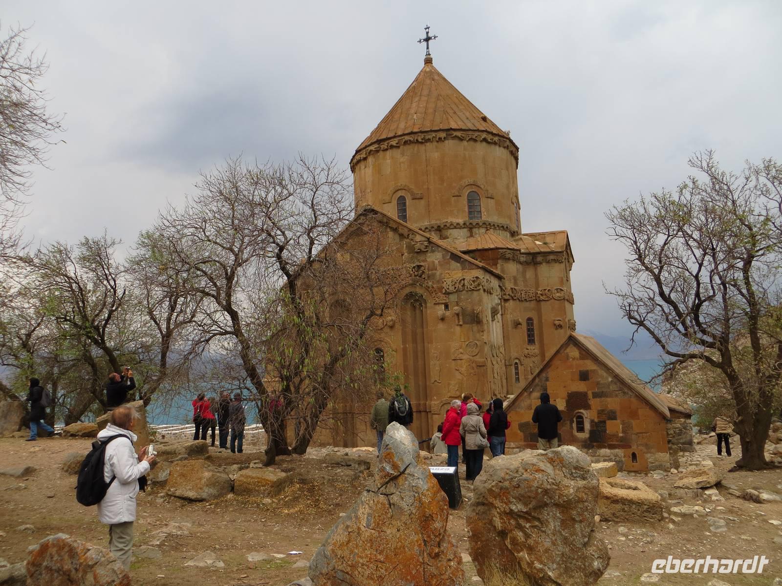 In einer regionalen Kelim-Kooperative erfuhren wir am Vormittag mehr über die Besonderheiten der orientalischen Kelims und der traditionellen Teppichknüpferei. Eindrucksvoll waren insbesondere die Darstellungen der multiethnischen Vielfalt der Motive und Farbauswahl für die Teppiche. In einer fruchtbaren Ebene vor schon schneebedeckten Bergen im iranischen und irakischen Grenzgebiet erhebt sich der Felsrücken von Cavustepe. Hier besichtigten wir nach schmalgratiger Busauffahrt die Überreste einer urartäischen Festung und genossen einen beeindruckenden Blick in die Steppe. Mit Hilfe eines der wenigen Sprachkundigen der urartäischen Schriftsprache ließen wir uns die Keilschrift erklären. Nach der Mittagspause am Van-See starteten wir zu einer Bootsfahrt zur Klosterinsel Akdamar. Es hatte sich empfindlich abgekühlt, ein fast eisiger Wind war aufgekommen und wir waren wohl die fast letzten Gäste für dieses Jahr. Die beeindruckenden Reliefs auf den Fassaden der altarmenischen Kirche beschreiben neben religiösen Themen auch irdische Themen wie das Palastleben, Jagdszenen, Mensch- oder Tierfiguren. Im Inneren der seit 2005 sich in Renovierung befindlichen Anlage sind die Wände voller christlicher Motive. Nach der Rückfahrt über den See dann die Weiterfahrt mit dem Bus nach Tatvan.