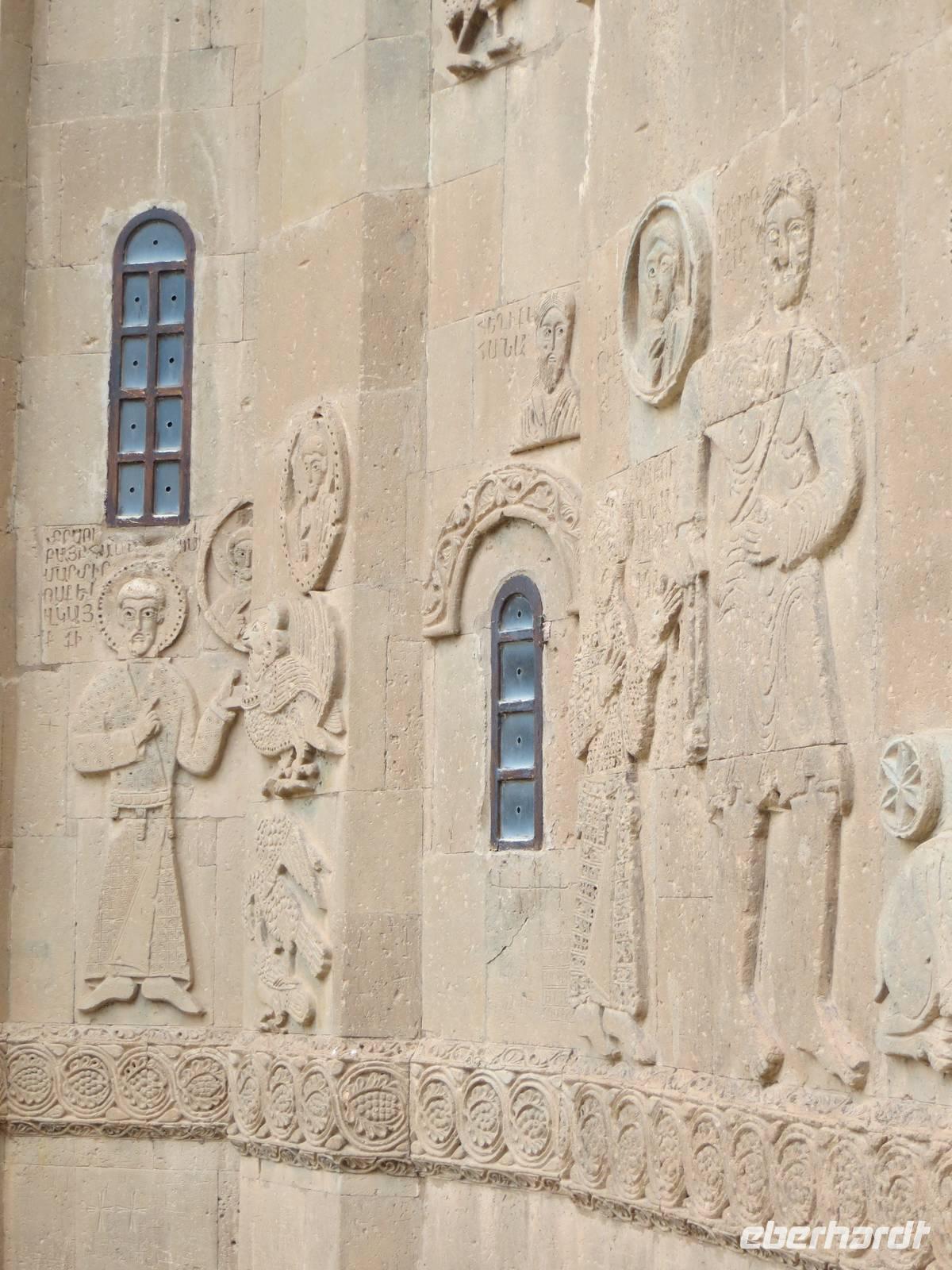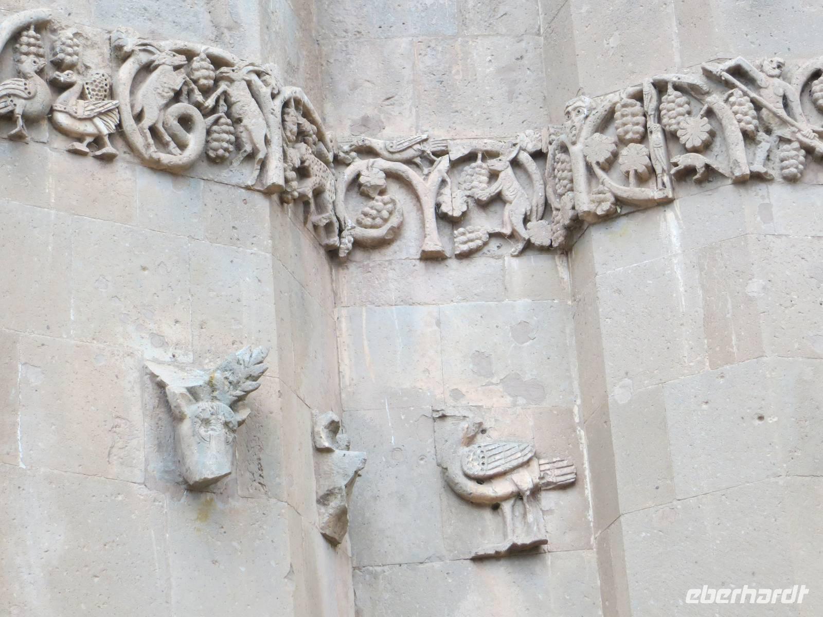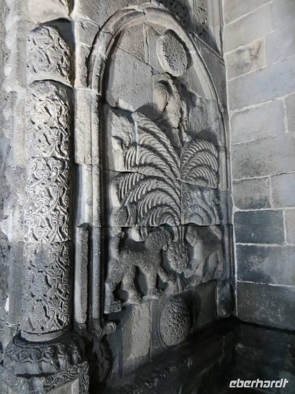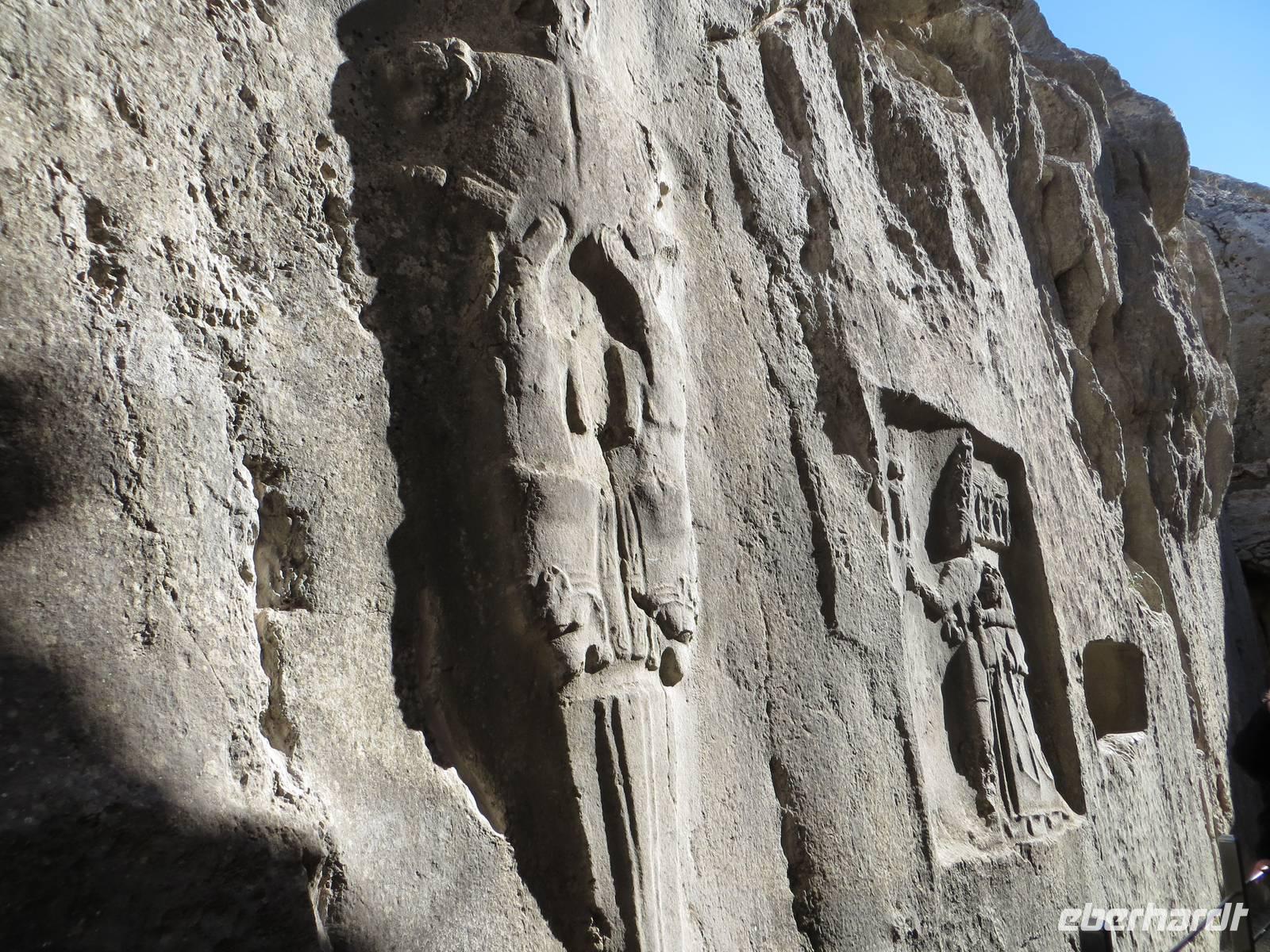 In einer regionalen Kelim-Kooperative erfuhren wir am Vormittag mehr über die Besonderheiten der orientalischen Kelims und der traditionellen Teppichknüpferei. Eindrucksvoll waren insbesondere die Darstellungen der multiethnischen Vielfalt der Motive und Farbauswahl für die Teppiche. In einer fruchtbaren Ebene vor schon schneebedeckten Bergen im iranischen und irakischen Grenzgebiet erhebt sich der Felsrücken von Cavustepe. Hier besichtigten wir nach schmalgratiger Busauffahrt die Überreste einer urartäischen Festung und genossen einen beeindruckenden Blick in die Steppe. Mit Hilfe eines der wenigen Sprachkundigen der urartäischen Schriftsprache ließen wir uns die Keilschrift erklären. Nach der Mittagspause am Van-See starteten wir zu einer Bootsfahrt zur Klosterinsel Akdamar. Es hatte sich empfindlich abgekühlt, ein fast eisiger Wind war aufgekommen und wir waren wohl die fast letzten Gäste für dieses Jahr. Die beeindruckenden Reliefs auf den Fassaden der altarmenischen Kirche beschreiben neben religiösen Themen auch irdische Themen wie das Palastleben, Jagdszenen, Mensch- oder Tierfiguren. Im Inneren der seit 2005 sich in Renovierung befindlichen Anlage sind die Wände voller christlicher Motive. Nach der Rückfahrt über den See dann die Weiterfahrt mit dem Bus nach Tatvan.