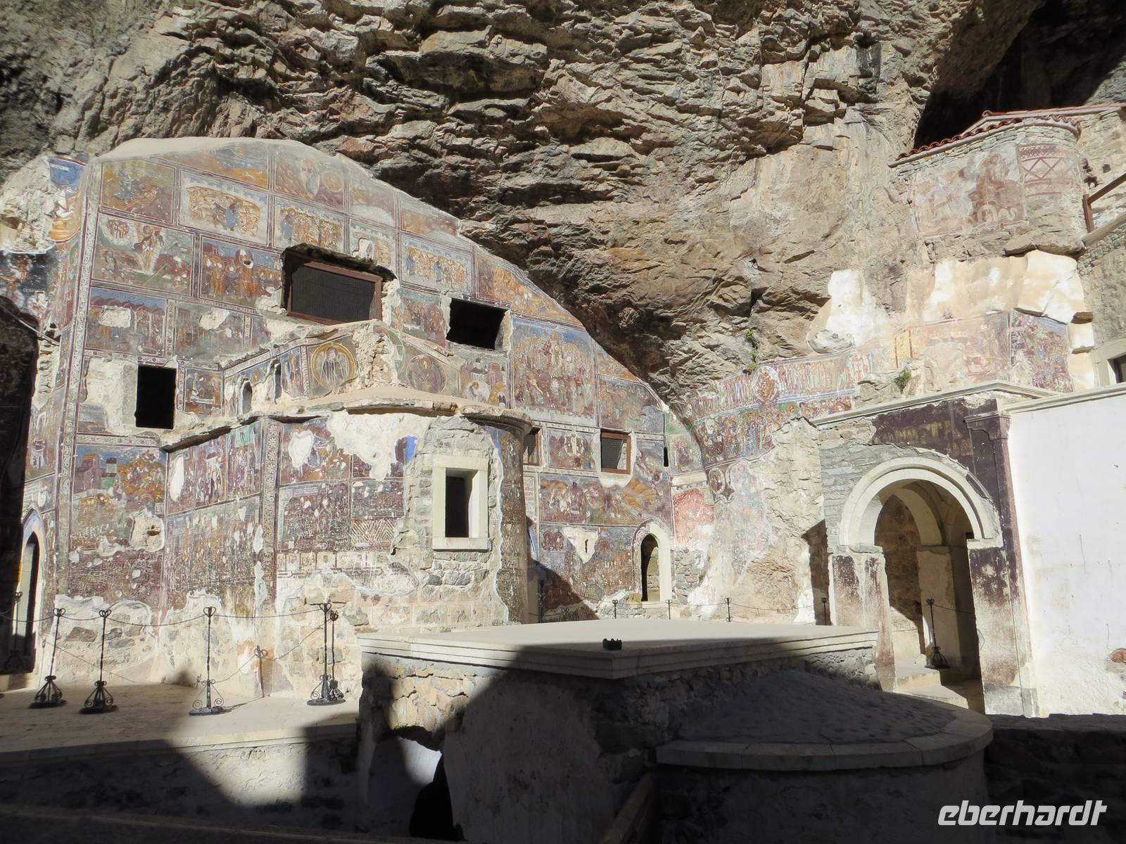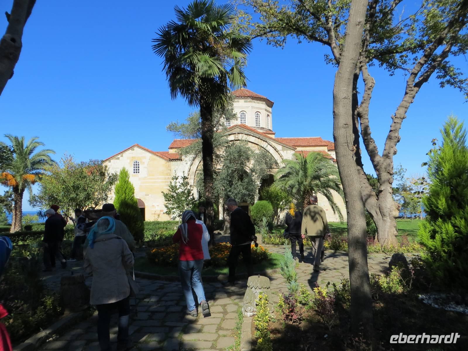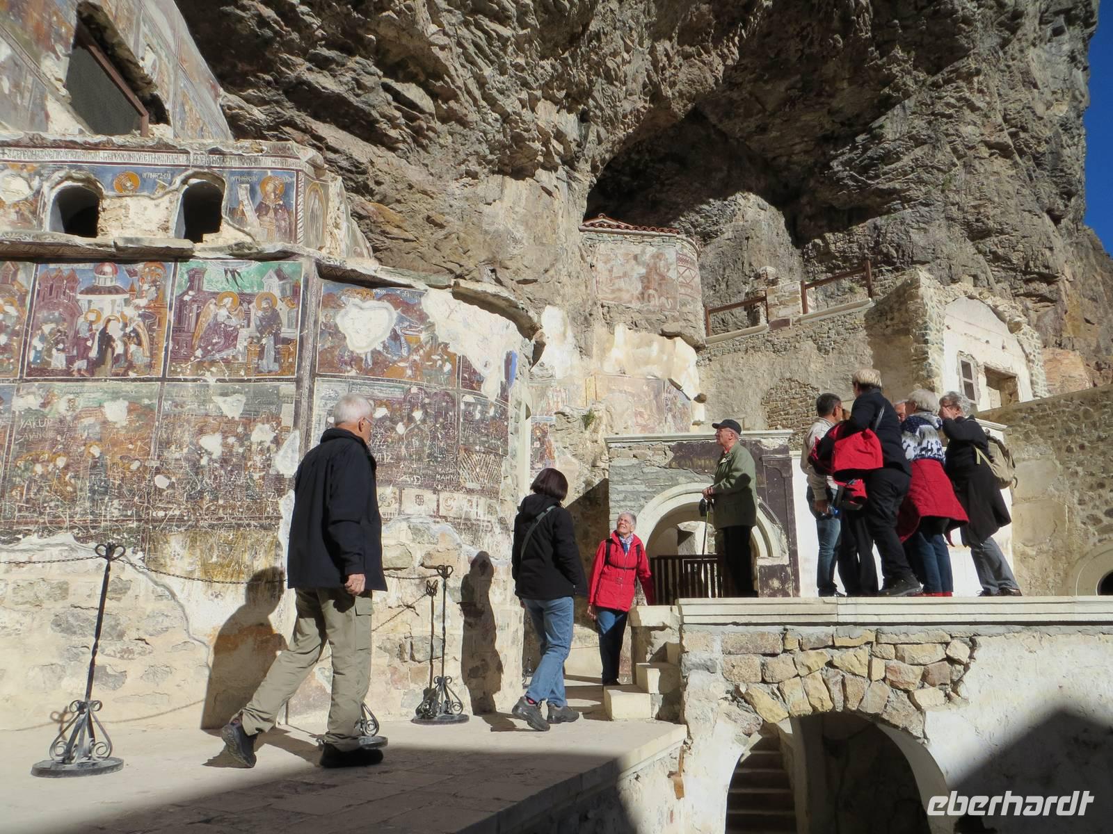 Das Klima an der Schwarzmeerküste ist oft feucht und trüb: wir hatten Glück, es wurde ein Sonnentag. Bereits bei unserer frühzeitigen Ankunft im Talkessel unterhalb des Sumela-Klosters konnten wir das Klostergebäude hoch oben in der Wand in den Sonnenstrahlen erkennen. Nach einigen Minuten waren auch die Kleinbusse zur Weiterfahrt bereit. Das Sumala-Kloster ist einer der bedeutendsten Orte der orthodoxen Kirche in Anatolien und einer der ältesten Sakralbauten der Schwarzmeerregion. Besonders beindruckend war die Grottenkapelle mit reichverzierten Fresken. Die Lage am Endpunkt einer Handelsstraße verschaffte Trabzon, der drittgrößten Stadt der Schwarzmeerküste in der Antike große Bedeutung. In Trabzon besichtigten wir, die Hagia-Sophia-Kirche, eine byzantinische Kirche mit bunten Fresken in drei Längsschiffen und einem Querschiff, die von einer Kuppel gekrönt werden. Im Kampf der Religionen siegte vor zwei Monaten erneut der Islam, so dass aus der Museumskirche wieder eine Moschee wurde. Der Kuppelbau mit jahrhundertealter christlicher Malerei nun verhangen durch Tuch - nicht viel anders als Bilderstreit und „Malerei geschützt durch eine Kalkschicht". Ich weiß jetzt, warum die jungen Menschen der Türkei im Frühsommer des Jahres auf die Straße gegangen sind