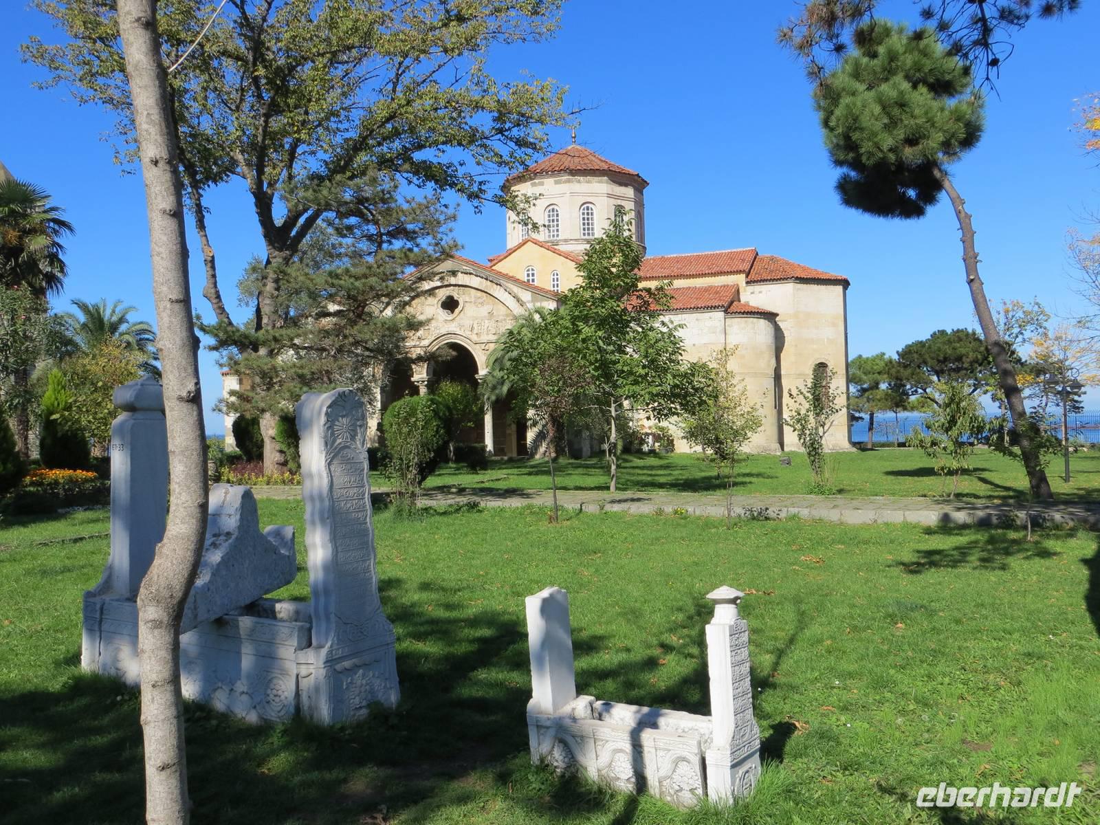 Die Fahrstrecke führte uns durch das Pontische Gebirge hinab nach Samsun am Schwarzen Meer. Hier machten wir einen Stopp an jener Stelle, an der 1919 Atatürk an Land ging, um für einen türkischen Nationalstaat zu kämpfen. Weiter ging es entlang des grünen, aber steinigen Küstenstreifens des Schwarzen Meeres nach Ordu, wo wir von einem Berg hoch über der Bucht auf das Schwarze Meer, die Stadt Ordu, das Pontische Gebirge und zahlreiche schon verschneite Gipfel schauten. Mit Einbruch der Dunkelheit trafen wir in Trabzon, dem antiken Trapezunt, ein. So verschoben wir die Hagia Sophie und einen kleinen Altstadtbummel auf den kommenden Tag und fuhren nach Mazka zu unserem recht neuen und großzügigen Hotel Pekyolu. Wir waren wohl fast allein im Hotel mit einem überreichlichen und köstlichen Büffet.