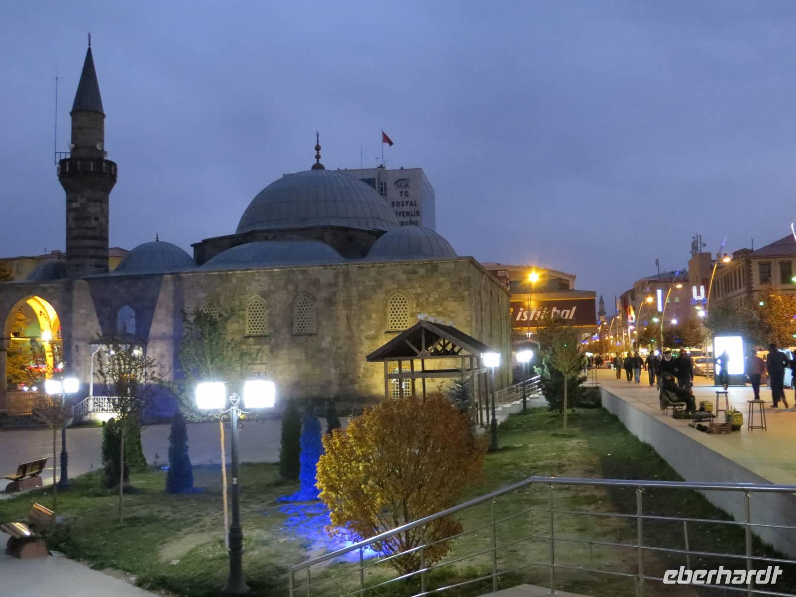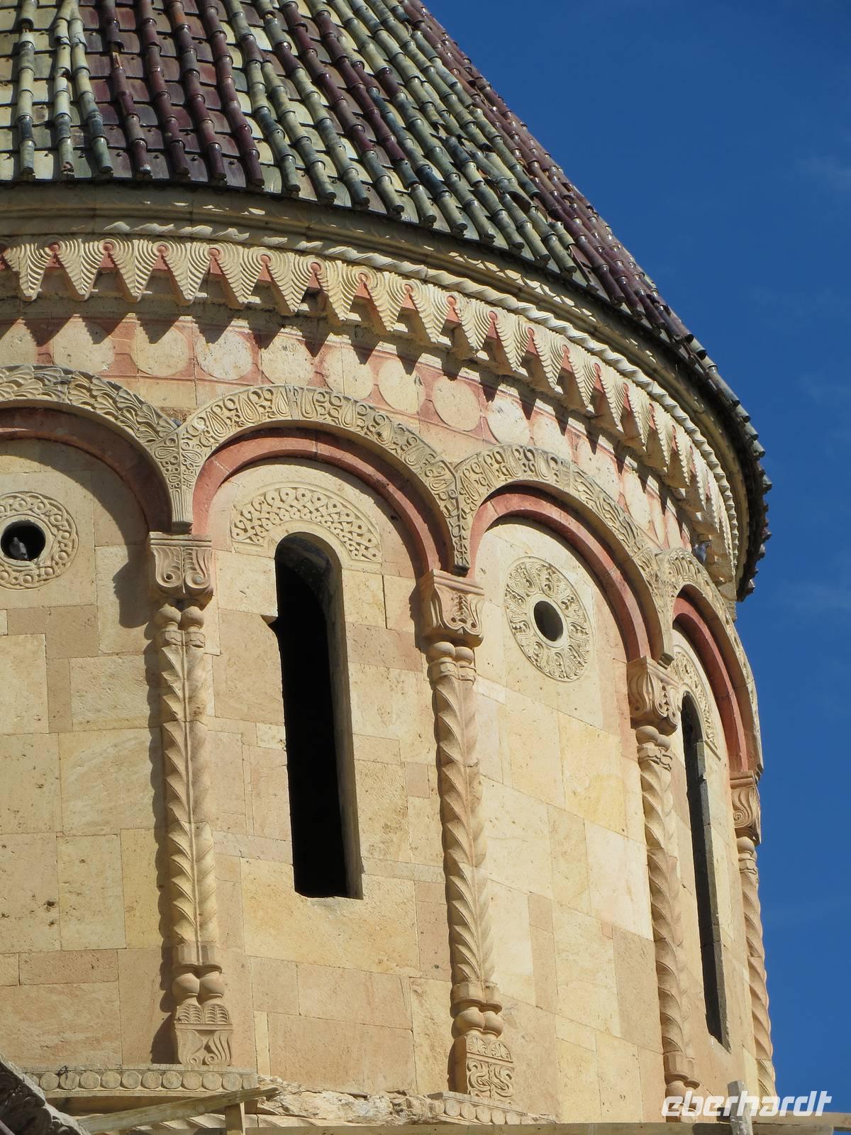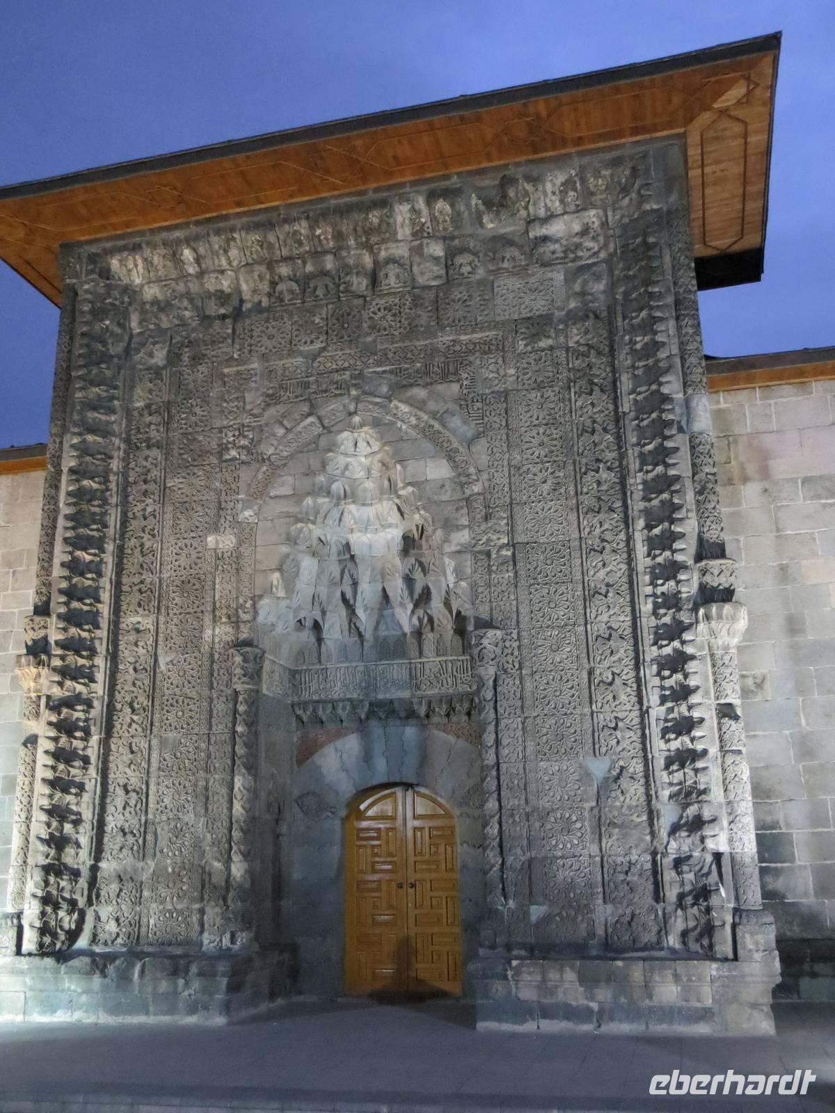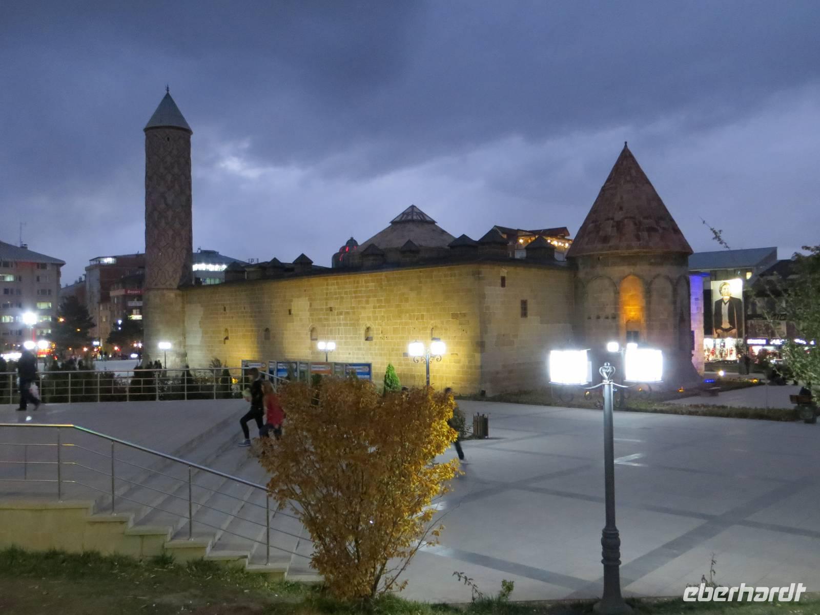 Zunächst frühmorgendliche Auffahrt vom Schwarzen Meer in die Berge an Artvin vorbei. Eine atemberaubende Fahrt führte uns durch das Coruh Tal gen Süden. Noch 2011 fuhren wir unmittelbar neben dem Fluss; das Tal sollte seinerzeit noch durch einen Staudamm abgeriegelt werden. Nun war dies mittlerweile geschehen, eine 250 Meter hohe Staumauer blockierte den Strom. Irgendwann soll der Staudamm auch Energie und Wasser für Ostanatolien liefern. Mit unserem kleinen Bus unternahmen wir einen Abstecher zur, in den Bergen, auf 1100 Meter Höhe, gelegenen georgischen Kirche Ishan. Einerseits freuten wir uns, dass dieses Kleinod rekonstruiert wird, andererseits waren wir natürlich traurig, dass wir nicht in die Kirche konnten. Ein traditionelles Picknick mit Köfte, Ziegenkäsecreme und verschiedenen Gemüsen sowie georgischem Rotwein krönte den Ausflug in die Gebirgswelt. Leider war uns auch die Zufahrt zur georgischen Kirche von Ösk verwehrt, weil Straßenbauarbeiten erfolgten. Nach langer Fahrt aus dem Gebirge heraus in die Ebene erhoben sich dann die schneebedeckten Berge hinter Erzurum. Erzurum ist seldschukisch geprägt mit Medresen und alten Moscheen. Die Cifte - Moschee war auch hier in einer Erneuerungsphase, aber ein kleiner Stadtbummel blieb uns am zeitigen Abend.