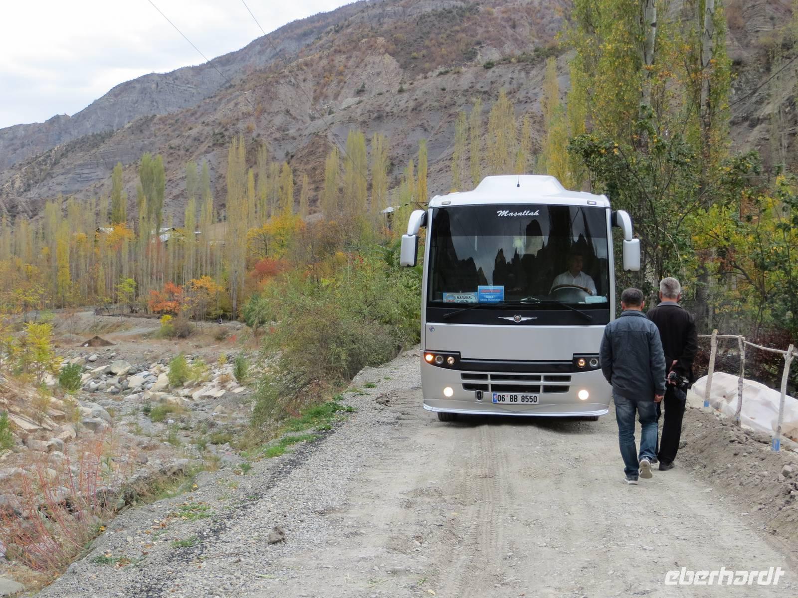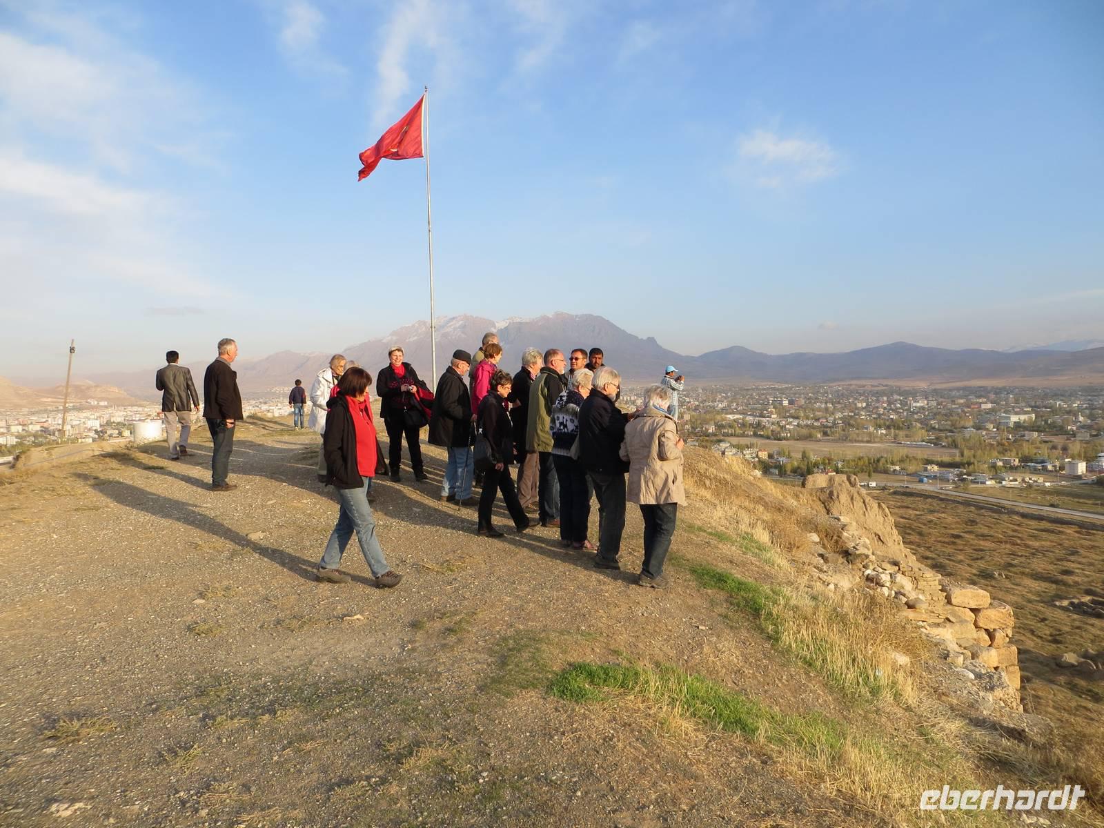 Frühes Aufstehen sicherte einen ersten Blick auf den schneebedeckten Ararat. Vor der Museumsmannschaft standen wir bereits am Eingangstor des Ishak Pascha Palastes und hatten schon tolle Fotomotive gefunden. Die burgähnliche Palastanlage geht auf eine urartäische Befestigungsanlage zurück, vereint armenische, georgische, persische, seldschukische und osmanische Architekturstile und wurde Ende des 17. errichtet. Beeindruckend erhebt sich der Palastbau im warmen Gelbton über der Landschaft. Bei blauem Himmel boten sich immer wieder auch Blicke und Fotomotive zum Ararat an. Auf der landschaftlich reizvollen Fahrstrecke, vorbei am erkalteten Lavastrom eines Vulkans ging es von Dogubeyazit nach Van. An den Bendimahi-Wasserfällen bei Muradiye stoppten wir für eine Pause mit gebratener Forelle bei herrlichstem Spätherbstwetter gegenüber der Wasserfälle. Zur rechten Zeit für einen Aufstieg auf die alte Festung Tuschpa gelangten wir nach Van. Als antikes Tuschpa war Van seit dem 9. Jahrhundert v. Chr. die Hauptstadt des Königreiches von Urartu. Nach der Besichtigung alter Keilschriften erklommen wir die Felswände der Zitadelle. Der Sonnentag ging langsam zu Ende mit Sicht auf Van und seinen See bei untergehender Sonne. Auf der Fahrt zum Hotel gab es dann noch einige Verzögerungen durch Umfahrungen und verkehrtes Einbahnstraßenfahren, da Vorbereitungen für den kommenden Besuch des Ministerpräsidenten Erdogan getroffen wurden.