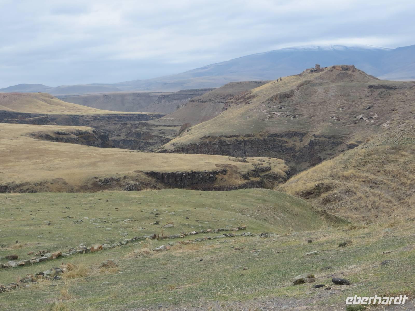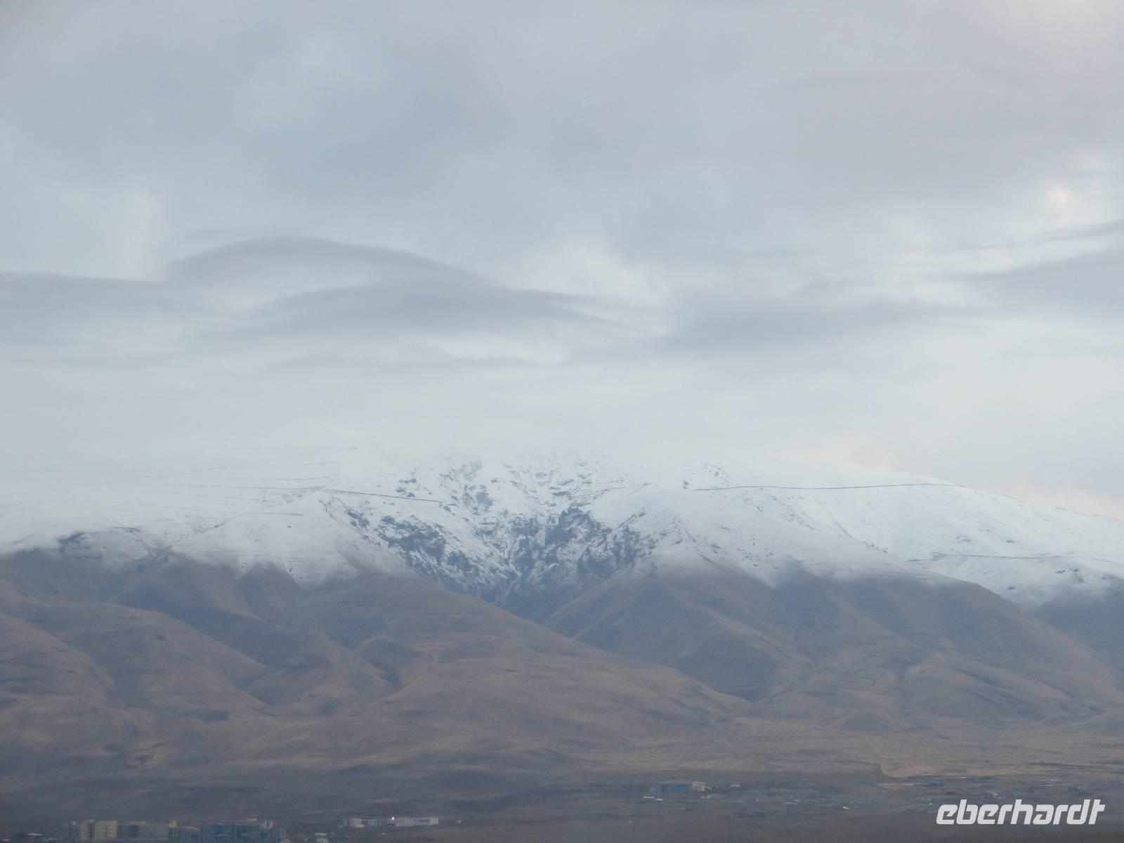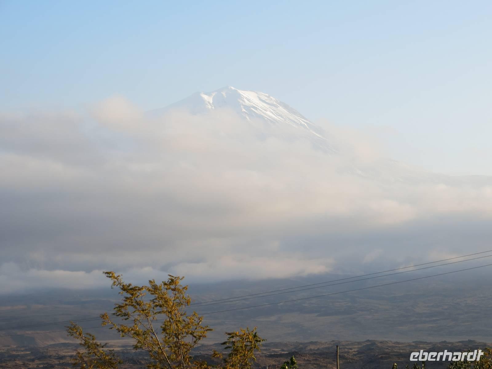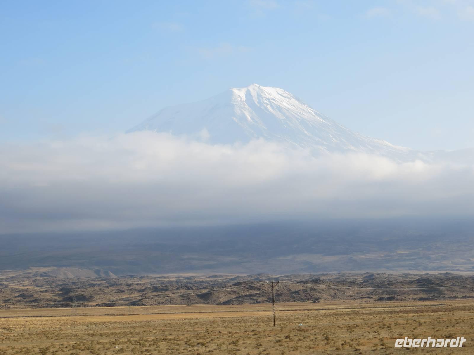 Die Provinzstadt Kars im türkisch-armenischen Grenzgebiet ist russisch geprägt und hatte historische Bedeutung als russische Garnisionsstadt nach Beendigung der türkisch-russischen Kriege. Zunächst fuhren wir jedoch an der Stadt vorbei bis unmittelbar an die türkisch-armenische Grenze nach Ani, der ehemaligen armenischen Hauptstadt am Fluss Harpasus. Im 11. Jahrhundert wurde die an der nördlichen Seidenstraße gelegene Stadt weithin als "Stadt der 1001 Kirchen" bezeichnet. Auf weiter Fläche sind noch heute zahlreiche Kirchen und Fragmente anderer Bauwerke zu bewundern, während direkt unter uns der Grenzzaun glitzerte und Wachtürme vom gegenüberliegenden Ufer grüßen. Auf dem Rückweg nutzten wir Kars zur Mittagspause und schauten nach einigen typisch russischen Provinzbauten des 19. Jahrhunderts. Durch welliges Land mit mannigfaltigen Gesteinsfärbungen in ca. 1600 Meter Höhe ging es dann nach Dogubeyazit. Der Große Ararat erhob sich mit seiner weißen, aber wolkenverhangenen Kuppe vor uns. Zum Abendessen im recht kühlen Hotel Sim Er träumten wir von guter Sicht am kommenden Morgen und trafen uns zum kleinen Schwatz bei Raki und Rotwein am Kamin.