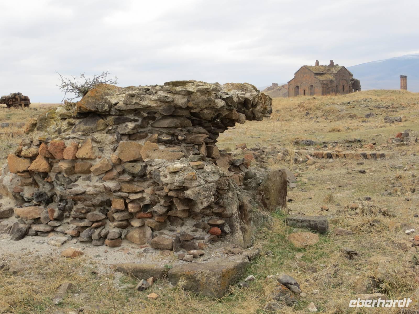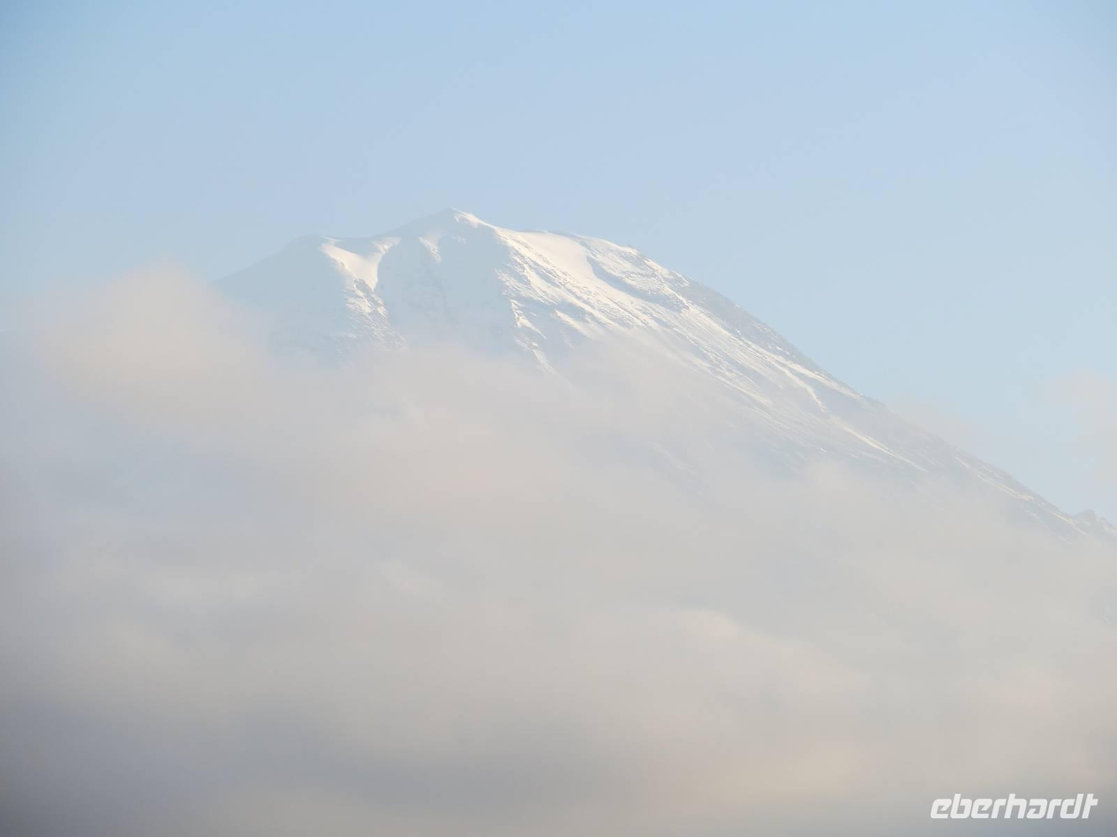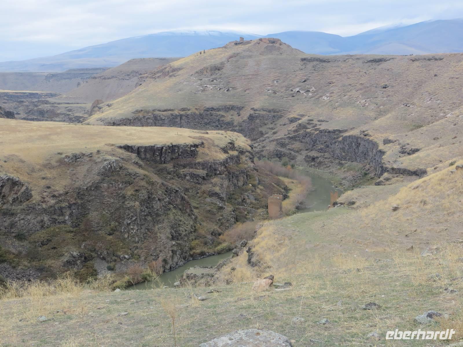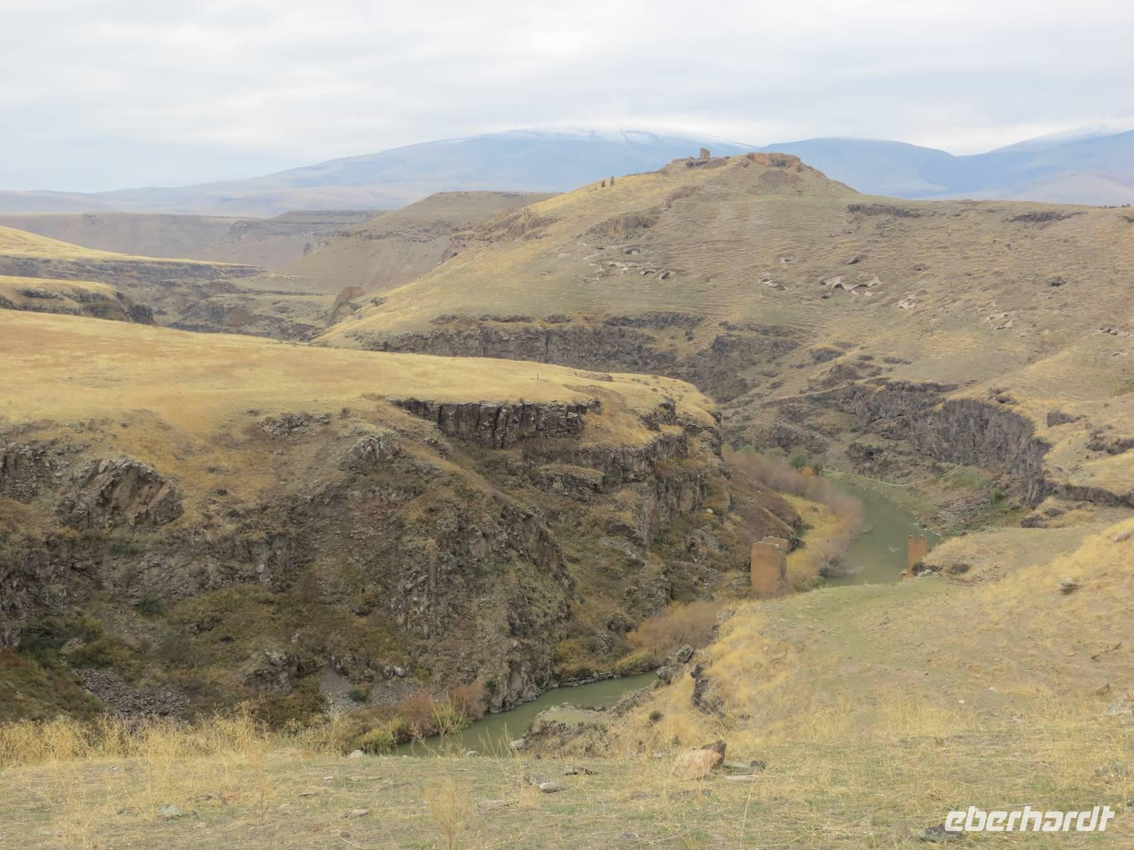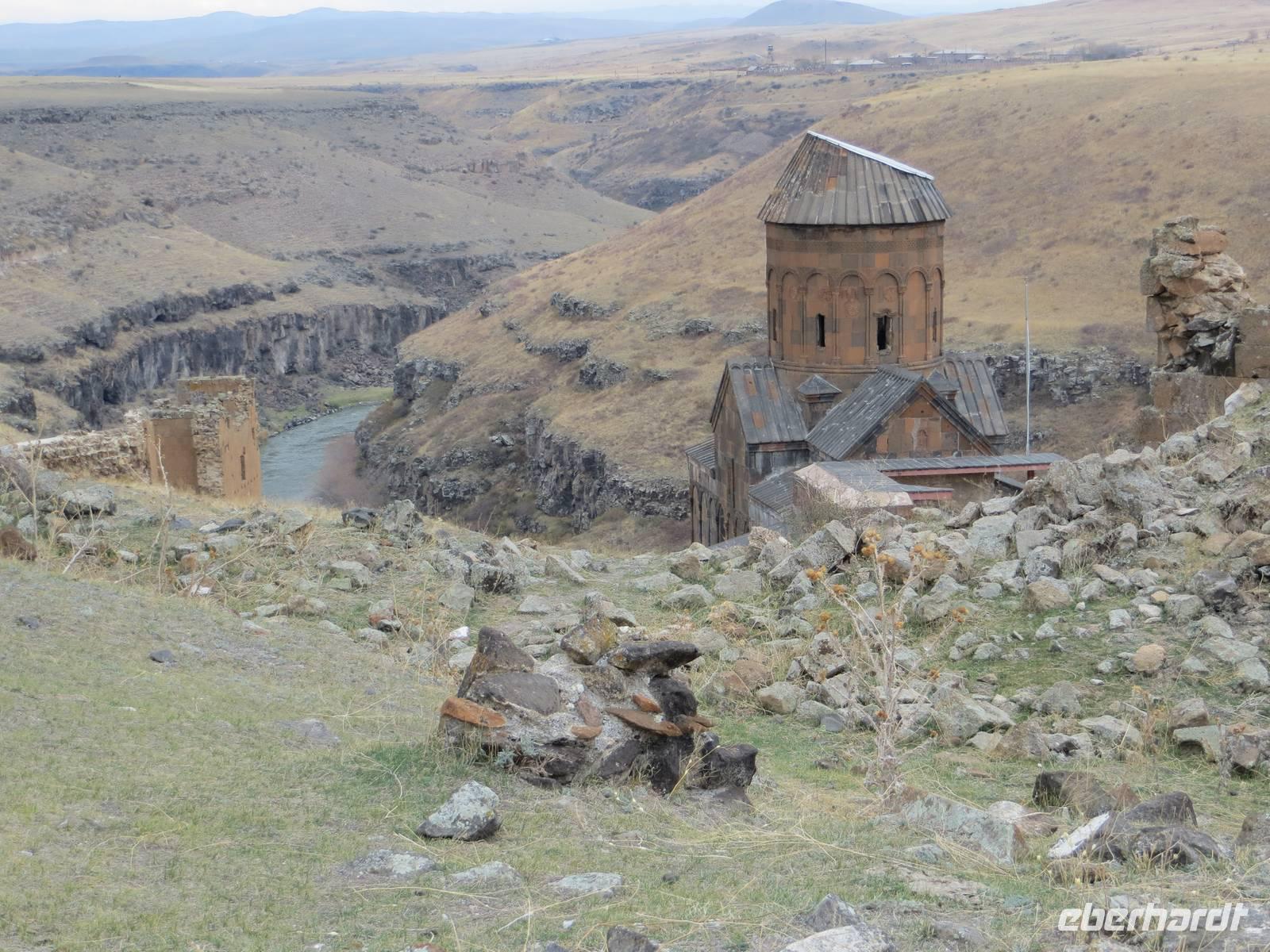 Die Provinzstadt Kars im türkisch-armenischen Grenzgebiet ist russisch geprägt und hatte historische Bedeutung als russische Garnisionsstadt nach Beendigung der türkisch-russischen Kriege. Zunächst fuhren wir jedoch an der Stadt vorbei bis unmittelbar an die türkisch-armenische Grenze nach Ani, der ehemaligen armenischen Hauptstadt am Fluss Harpasus. Im 11. Jahrhundert wurde die an der nördlichen Seidenstraße gelegene Stadt weithin als "Stadt der 1001 Kirchen" bezeichnet. Auf weiter Fläche sind noch heute zahlreiche Kirchen und Fragmente anderer Bauwerke zu bewundern, während direkt unter uns der Grenzzaun glitzerte und Wachtürme vom gegenüberliegenden Ufer grüßen. Auf dem Rückweg nutzten wir Kars zur Mittagspause und schauten nach einigen typisch russischen Provinzbauten des 19. Jahrhunderts. Durch welliges Land mit mannigfaltigen Gesteinsfärbungen in ca. 1600 Meter Höhe ging es dann nach Dogubeyazit. Der Große Ararat erhob sich mit seiner weißen, aber wolkenverhangenen Kuppe vor uns. Zum Abendessen im recht kühlen Hotel Sim Er träumten wir von guter Sicht am kommenden Morgen und trafen uns zum kleinen Schwatz bei Raki und Rotwein am Kamin.