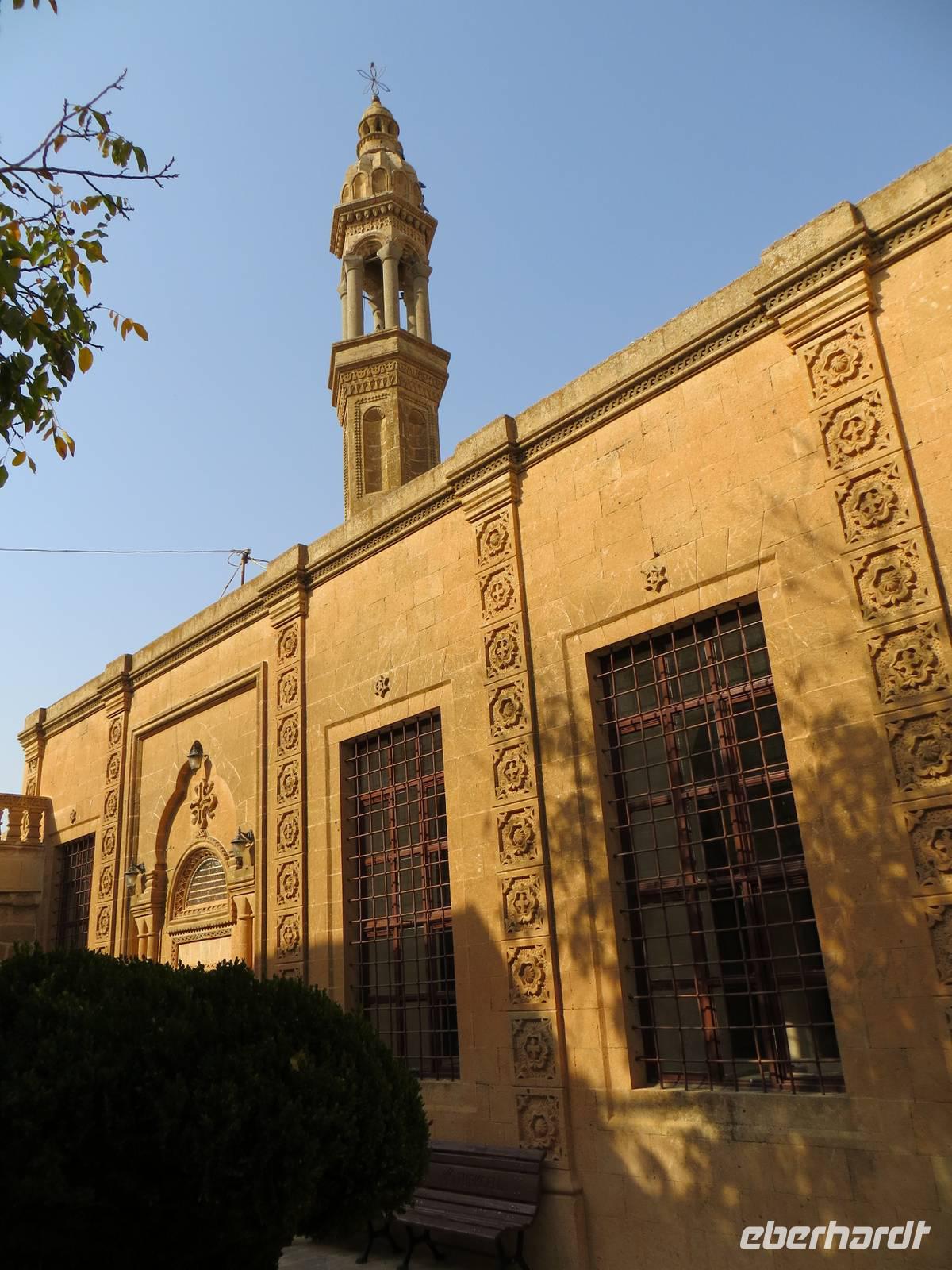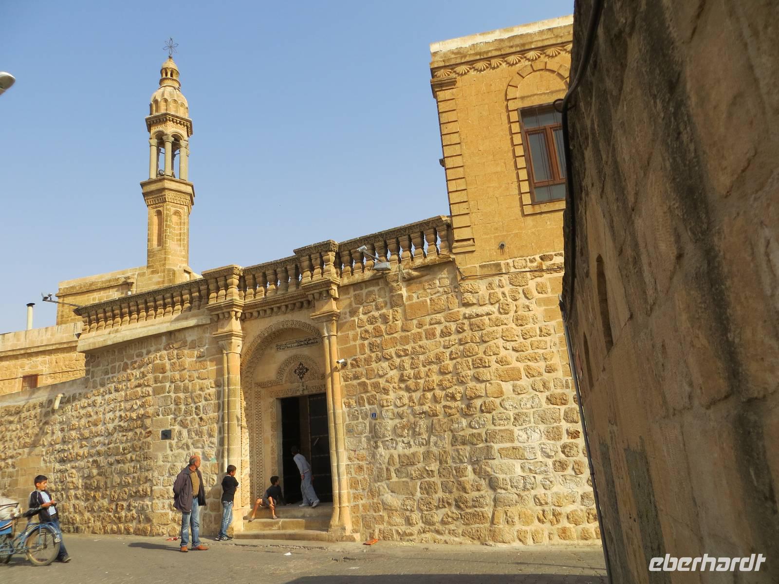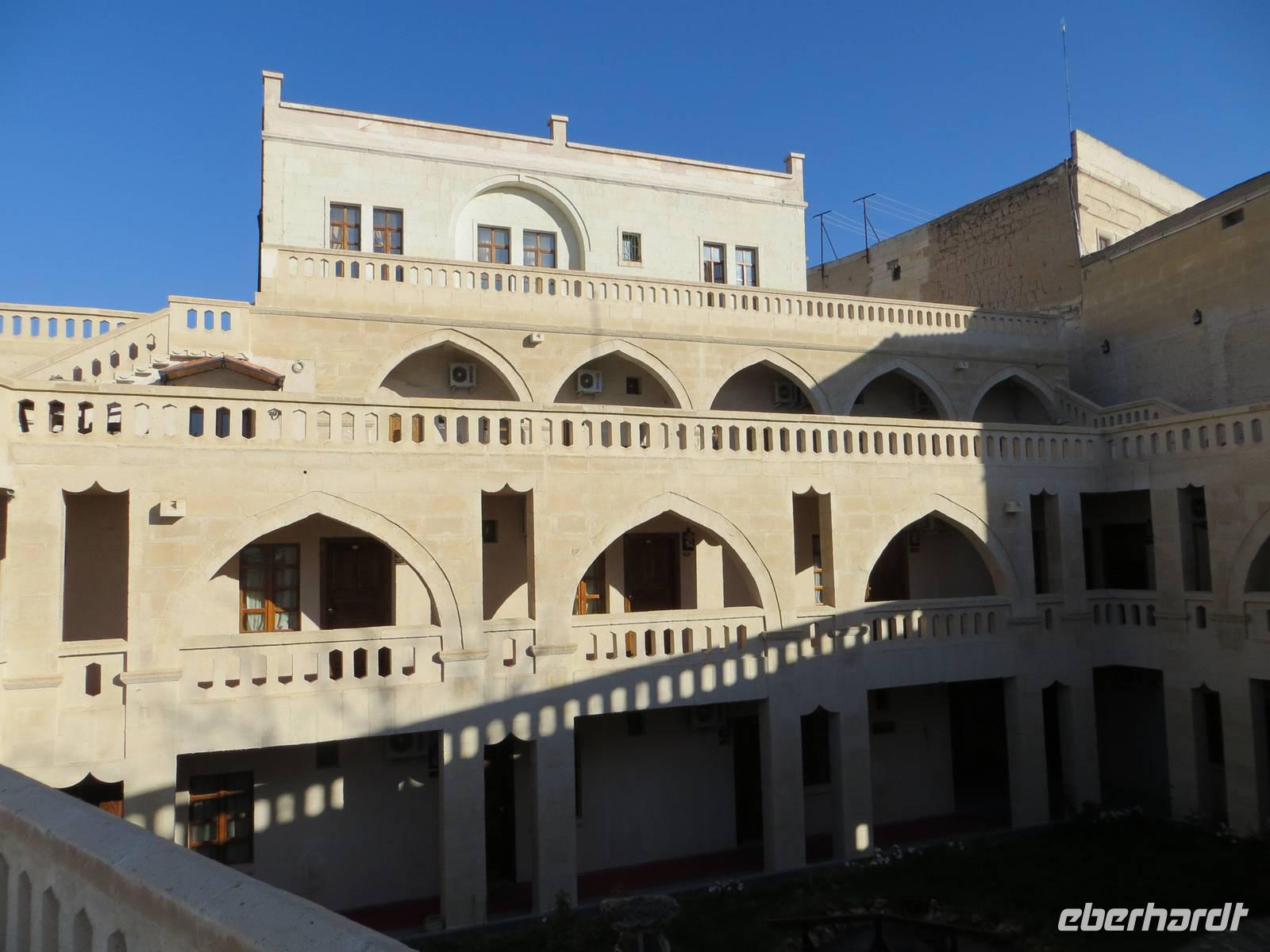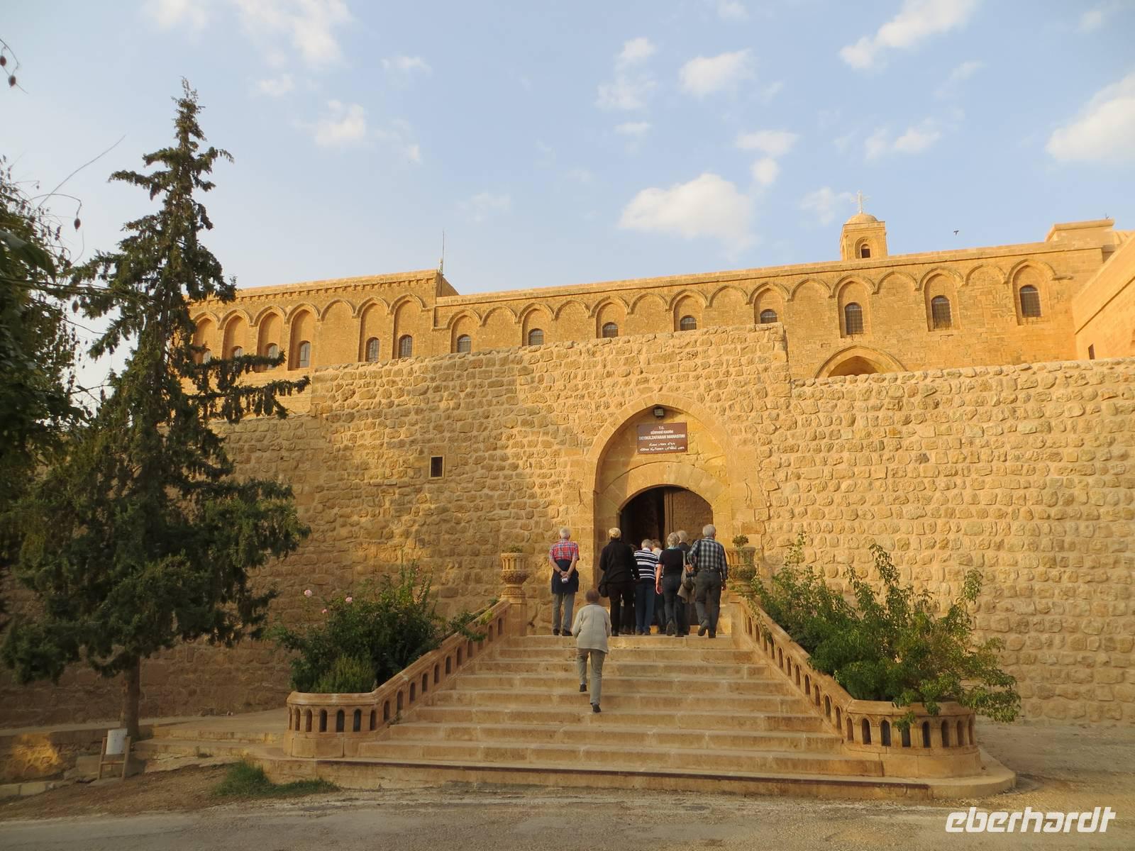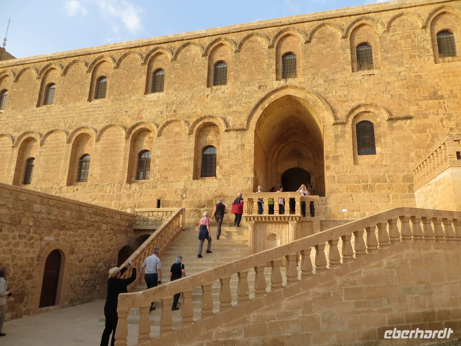Vielleicht waren wir hier gar die erste Eberhardt-Reisegruppe, die abseits der Hauptstraße eine aramäische - also syrisch-orthodoxe -Kirche - entdeckte und gar eine Bibel in aramäischer Schriftsprache gezeigt bekam. Architektonisch ist Midyat zweigeteilt: in den westlichen, islamischen Stadtteil und den östlichen, christlichen Teil mit rekonstruierten Kirchen und feinverzierten Stadthäusern. Nach dem mittäglichen Kebab oder Linsensüppchen führte uns die Fahrt weiter zum Deyrulzafaran Kloster, einem Kloster der syrischen Orthodoxie mit wohl noch fünfzig Mönchen, Über der syrischen Ebene unter uns lag graue Schwere, so dass wir die Nähe des Nachbarstaates im Bürgerkrieg kaum erahnen konnten, Mit dem letzten warmen Tageslicht kamen wir in Mardin an. Ein Bummel in den beginnenden Abend hinein führte uns durch die sehr arabisch geprägte Altstadt mit kleinen Gässchen und Moscheen. Das gewaltige Hotel Yay Grand am Rande von Mardin erinnerte den einen oder anderen an Hotels an der türkischen Mittelmeerküste... und es hatte wohl das beste Bufett unserer Reise zum Abendessen aber keinen Tropfen Alkohol.