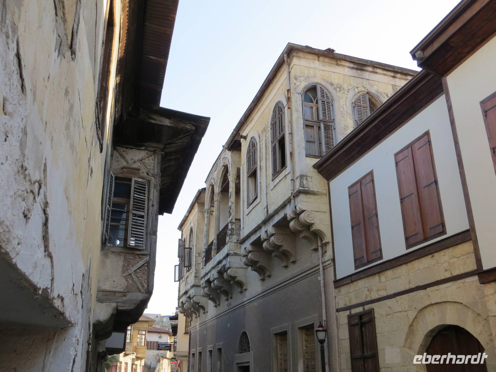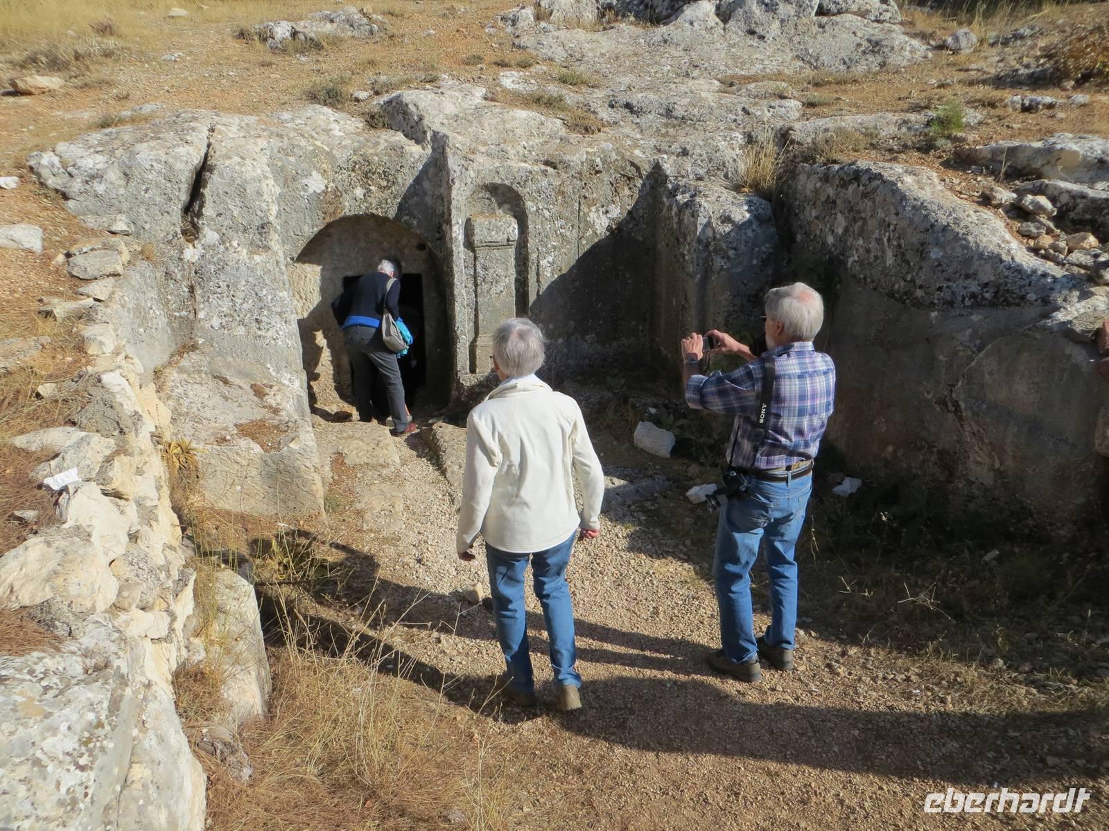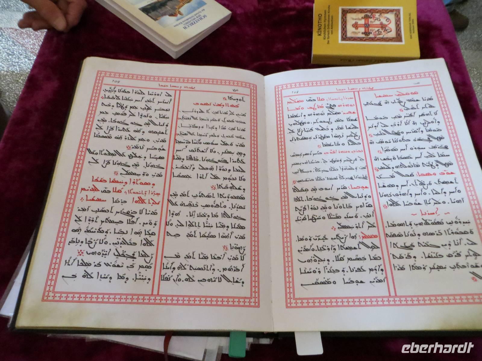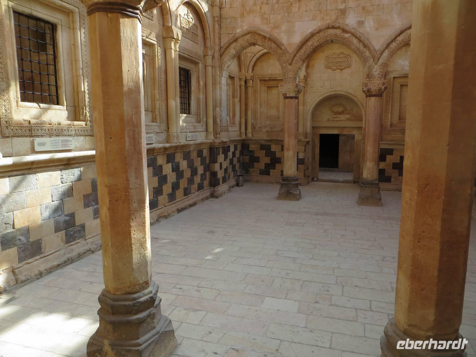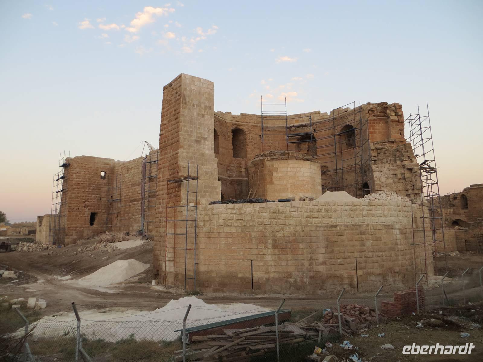 Vielleicht waren wir hier gar die erste Eberhardt-Reisegruppe, die abseits der Hauptstraße eine aramäische - also syrisch-orthodoxe -Kirche - entdeckte und gar eine Bibel in aramäischer Schriftsprache gezeigt bekam. Architektonisch ist Midyat zweigeteilt: in den westlichen, islamischen Stadtteil und den östlichen, christlichen Teil mit rekonstruierten Kirchen und feinverzierten Stadthäusern. Nach dem mittäglichen Kebab oder Linsensüppchen führte uns die Fahrt weiter zum Deyrulzafaran Kloster, einem Kloster der syrischen Orthodoxie mit wohl noch fünfzig Mönchen, Über der syrischen Ebene unter uns lag graue Schwere, so dass wir die Nähe des Nachbarstaates im Bürgerkrieg kaum erahnen konnten, Mit dem letzten warmen Tageslicht kamen wir in Mardin an. Ein Bummel in den beginnenden Abend hinein führte uns durch die sehr arabisch geprägte Altstadt mit kleinen Gässchen und Moscheen. Das gewaltige Hotel Yay Grand am Rande von Mardin erinnerte den einen oder anderen an Hotels an der türkischen Mittelmeerküste... und es hatte wohl das beste Bufett unserer Reise zum Abendessen aber keinen Tropfen Alkohol.
