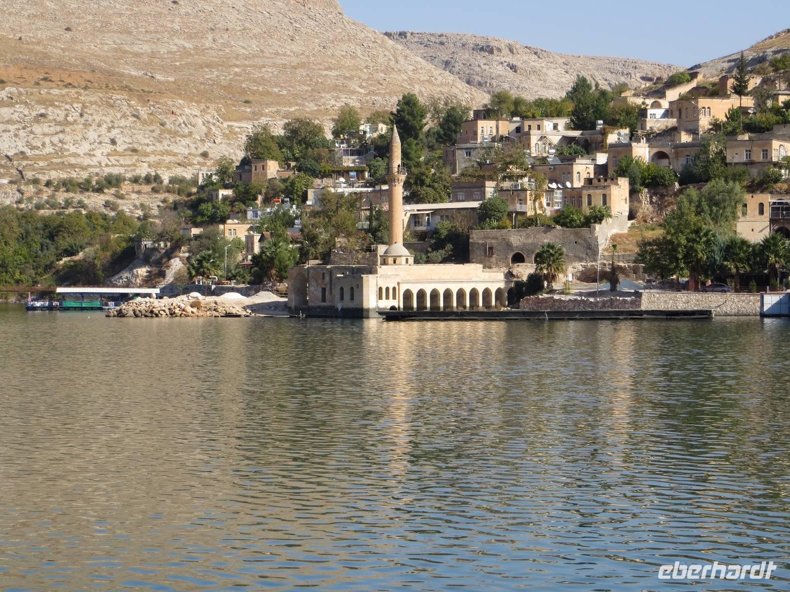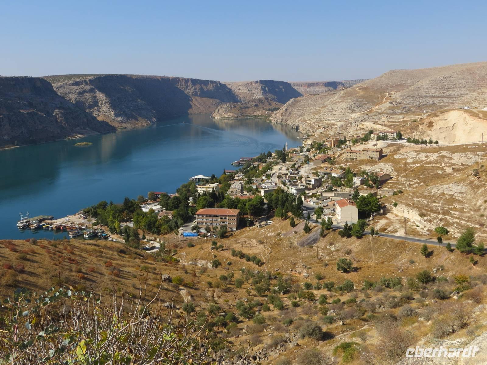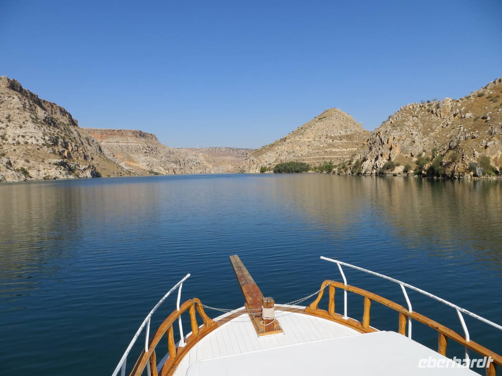 Nach dem Frühstück ging es nach Halfeti, am Euphrat-Ufer. Aufgrund des Baus der südostanatolischen Staudammprojekte verschwanden 2/3 des alten Dorfes unter den Fluten. Heute zieht die Kulisse der verlassenen Stadt im Sommer viele Besucher an; am späten Oktobertag waren wir fast die einzigen. Wir nutzten die Möglichkeit mit einem kleinen Motorschiff auf dem angestauten Euphrat zu fahren, um die Landschaft vom Wasser aus kennen zu lernen und eine mehr als 2500 Jahre alte Burganlage aus assyrischer Zeit zu bestaunen. Nach einer Mittagspause in der trubligen Stadt Gaziantep besuchten wir das neue Zeugma-Museum, wo wir 45 der geretteten Fresken und Mosaike aus dem 2. und 3. Jahrhundert bestaunen konnten. Die großflächigen Mosaike finden in dem Museumsbau eine großzügige Präsentation. Am Vorabend nutzte noch mancher die Gelegenheit durch Gaziantep zu bummeln.