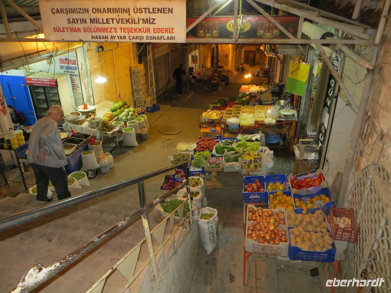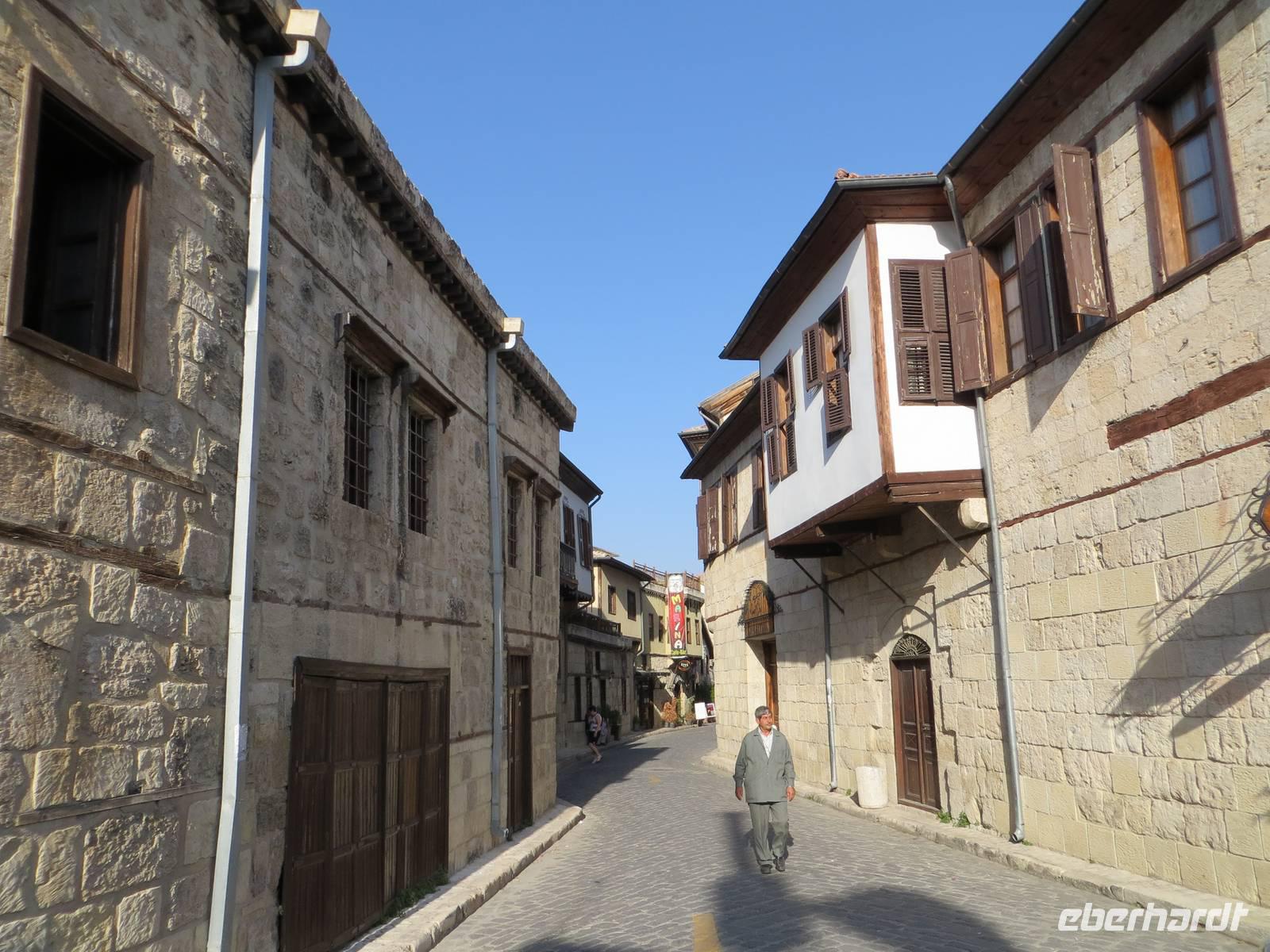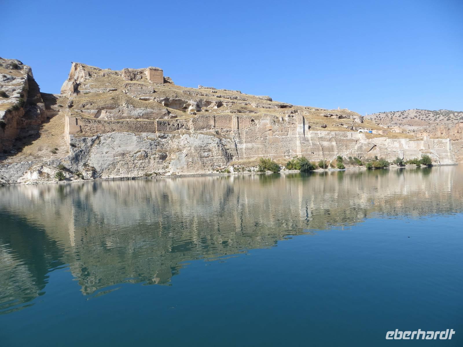 Nach dem Frühstück ging es nach Halfeti, am Euphrat-Ufer. Aufgrund des Baus der südostanatolischen Staudammprojekte verschwanden 2/3 des alten Dorfes unter den Fluten. Heute zieht die Kulisse der verlassenen Stadt im Sommer viele Besucher an; am späten Oktobertag waren wir fast die einzigen. Wir nutzten die Möglichkeit mit einem kleinen Motorschiff auf dem angestauten Euphrat zu fahren, um die Landschaft vom Wasser aus kennen zu lernen und eine mehr als 2500 Jahre alte Burganlage aus assyrischer Zeit zu bestaunen. Nach einer Mittagspause in der trubligen Stadt Gaziantep besuchten wir das neue Zeugma-Museum, wo wir 45 der geretteten Fresken und Mosaike aus dem 2. und 3. Jahrhundert bestaunen konnten. Die großflächigen Mosaike finden in dem Museumsbau eine großzügige Präsentation. Am Vorabend nutzte noch mancher die Gelegenheit durch Gaziantep zu bummeln.