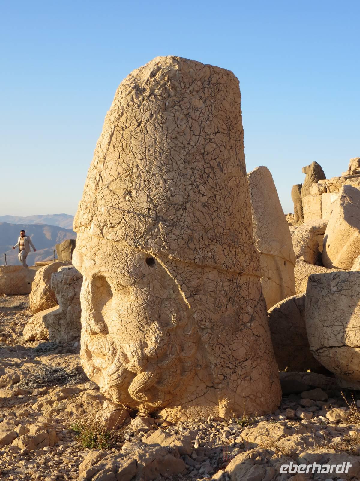 Um unser bedeutendes Tagesziel, den Nemrud Dag, bei Fotolicht zu erreichen, hatten wir den Start bereits für 6:30 Uhr geplant. So waren wir acht Uhr in der Kurdenhochburg Diyarbakir Bald sprach uns auch ein Polizist an, wir sollten auf unsere persönlichen Gegenstände achten. so beließen wir es bei einer Besichtigung der bedeutenden Stadtmauer. Der Bus brachte uns nach ein wenig Wegsuche dann in rasanter Fahrt nach Kahta an den Euphrat, auf dem der Rückstau des Atatürk-Staudammes bereits zu spüren war. Unvergesslich wird allen sicher das recht wirre Befahren der Fähre durch Busse, Transportfahrzeuge und PKW sein. Träge flossen die Wasser des Euphrat dann unter der Fähre hindurch. In der Nähe des Ortes Kahta stiegen wir auf Kleinbusse um und besichtigten zunächst den 30 Meter hohen Grabhügel Karakus. Anschließend ging es zu einem weiteren Höhepunkt der Reise: den kolossalen Götterstatuen auf dem Nemrud Dag. Die zweitausend Jahre alten Statuen bringen die einzigartige Synthese der mazedonisch-persischen Kultur zum Ausdruck und umzingeln das Grabmal des Königs Antiochos, welches sich unter einem 50 Meter hohen Schotterhügel befindet. Bei Spätnachmittagslicht hatten wir bestes Fotowetter und dann warteten wir in zweitausend Meter Höhe auf den Sonnenuntergang.