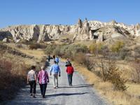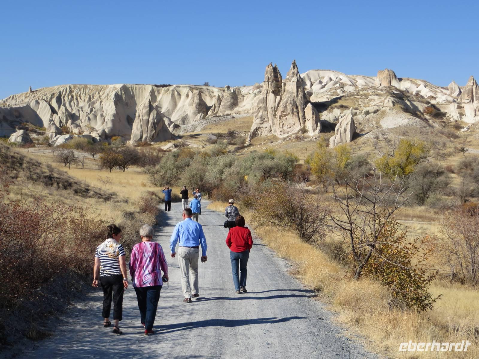 Die Erosionslandschaft der bizarr geformten Kegel, der unzähligen Felsenkirchen, die unterirdischen Städte und der Täler bieten in jeder Hinsicht den Besuchern Kappadokiens ein spektakuläres Naturschauspiel. Dies genossen alle Reiseteilnehmer am Vormittag auf einer Rundfahrt durch das zentrale Gebiet rund um Göreme mit einigen Fotostopps. Um mit ein wenig Abstand zu den Touristengruppen die Tuffsteinlandschaft intensiv zu erleben, bummelten wir im Liebestal. Gegen Mittag sahen wir im Göreme-Freilichtmuseum (UNESCO Kulturerbe) die aus dem Tuff-Felsen geschlagenen Höhlenkirchen, z.B. die Apfelkirche, mit wertvollen Wandmalereien. Davor hatten wir noch einen Abschiedsblick auf das Taubental und Göreme geworfen. Nach dieser letzten großen Besichtigung auf der Reise verließen wir Kappadokien und fuhren zurück nach Ankara. Auf den letzten hundertfünfzig Kilometern nahmen wir uns nochmals Zeit für eine deutsch-türkische Fragestunde zu alle noch bewegenden Fragen.