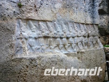 Besonders eindrucksvoll: Herrscher Tuthaliya IV. mit Rundhelm und Krummstab. Er wird, wie es Tradition war und weitere Jahrhunderte sein wird, von Göttern umarmt (hier Scharumma) und damit in den „Olymp“ aufgenommen. Nach diesem großen Erlebnis ging die Fahrt, vorbei an der legendären Stadt Amasya, nach Samsun weiter. Hier wurden wir leider mit viel Regen „empfangen“.