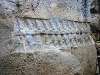 Nach einem Mittagessen in einer ländlichen Gaststätte besuchten wir das Felsheiligtum Yazilikaya. Dem Betrachter öffnen sich mehrere, in den Felsen gehauene Kammern, an deren Wänden sich reliefartig gestaltete Prozessionen von Göttern befinden (wahrscheinlich hurritisch - wie der Wettergott Teschup, die Sonnengöttin Hepat sowie Scharumma, ihr Sohn).