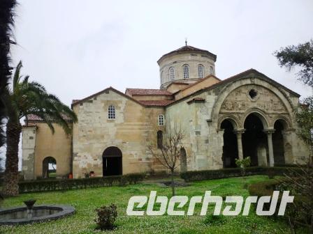 Diese Kirche, gegen 1204 von den aus Konstantinopel geflüchteten Komnenen errichtet, die hier unter Alexios Komnenos V. ein kleines Kaiserreich errichteten, liegt oberhalb des Hafens auf einem Hügel. Sie hat einen kreuzförmigen Grundriss mit drei Längs- und einem Querschiff, innen befinden sich byzantinische Fresken und am Südportal einen Fries mit der Adamsgeschichte. Auf der Strecke nach Erzurum war am nächsten Morgen das Kloster Sumela erstes Ziel unserer Besichtigung. Zunächst wurde das Wetter immer schlechter, am Zigane-Pass überraschte uns sogar der Winter mit kräftigem Schnee. Das Kloster lag im leichten Dunst und schwebte so für uns fast „mystisch“ am Felsen. Obwohl wir einige Kilometer mit einem Transportbus gefahren waren, gab es doch noch einen mühevollen Aufstieg bis zum Eingangsbereich.