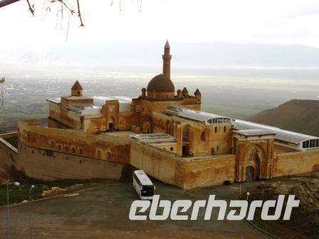 Unser Besuch galt nun dem sehenswerten Ishak-Pascha-Palast oberhalb der Stadt Dogubayazit. Auf dem Boden uralter urartäischer Festungsanlagen errichtete der Kurde und Gouverneur Ishak Pasa II um 1770-80 diesen Palast, versehen mit reichem, ornamentalen Schmuck und Architekturelementen aus verschiedenen Epochen. Beeindruckend ist der Blick auf die umliegenden Berge und die Ebene von Dogubayazit.