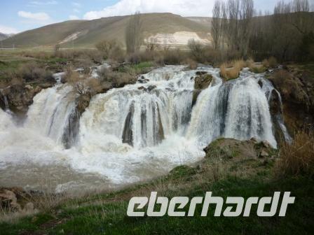 Gegen 15 Uhr, nach einer Rast an den Muradiye-Wasserfällen, erreichten wir die Urartäer-Festung Tuschpa mit Alt-Van. Das Wetter hatte sich gebessert und schon aus der Ferne erkannte man die Umrisse dieser schon fast selbst zu Stein gewordenen Festung aus Lehmziegeln, heute UNESCO-Weltkulturerbe. An den Felswänden, die zur Grabkammer von König Ardisti I. führen, erkennt man Keilschrifttexte über die Taten des dort Begrabenen. Am Südfelsen sieht man an einer nicht zu begehenden Stelle einen weiteren Keilschrift-Text, in den Sprachen Altpersisch, Elamisch und Babylonisch- er soll auf König Xerxes zurückgehen.