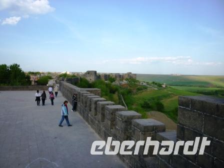 Die schwarzen (Basalt) Stadtmauern von Diyarbakir (Kara Amid) waren schon aus der Ferne zu sehen, als wir am zeitigen Nachmittag dort eintrafen. Von einem Aussichtspunkt aus hatten wir einen umfassenden Blick auf die Tigrisauen und die Stadt. Sie ist eine der malerischsten und lebhaftesten Städte der Türkei, bekannt aber auch als Hochburg kurdischer Stämme und politischer Gruppierungen sowie als Garnisonsstadt. Eine bewegte Vergangenheit prägt die Stadt, die in ihrer Frühzeit zu Nordmesopotamien gehörte, Perser, Römer, Byzantiner, Araber u. a. in ihren Mauern aufnahm und heute eine expandierende, aber immer noch exotische Provinzhauptstadt ist.