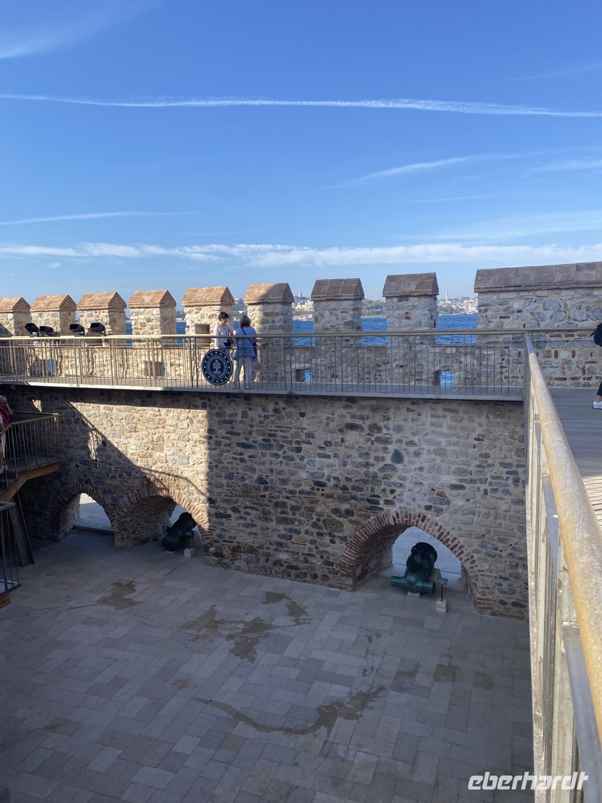 Die Fähre, die uns zum Mädchenturm bringen wird, liegt nahe der Galata Brücke und wir besteigen sie für die Überfahrt, außer einem Pärchen sind wir die einzigen Gäste, das Ziel ist schnell erreicht. Der Mädchenturm, auch als Leanderturm bekannt, ist eines der zahlreichen Wahrzeichen Istanbuls, ein sagenumworbener Leuchtturm auf einer kleinen Insel im Bosporus . Die türkische Bezeichnung ‚ Mädchenturm‘ (Kiz Kulesi ) geht auf die Legende zurück, dass einst einer Prinzessin der Tod durch Gift vorausgesagt wurde, woraufhin der Vater das Mädchen im Turm einschloss um sie zu beschützen, sie wurde dann dennoch durch den Biss einer Schlange getötet. Der europäische Name ,Leanderturm` hingegen wird auf einen antiken Stoff zurückgeführt: Leander schwamm jede Nacht zu seiner Geliebten Hero, bis eines Nachts die Fackel, die ihm den Weg wies, erlosch und Leander ertrank. Neben den Legenden bietet uns der Turm auch einen herrlichen Blick auf die Stadt.