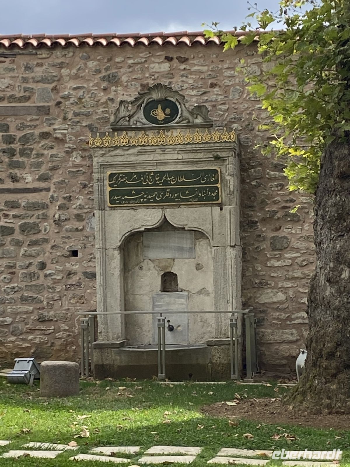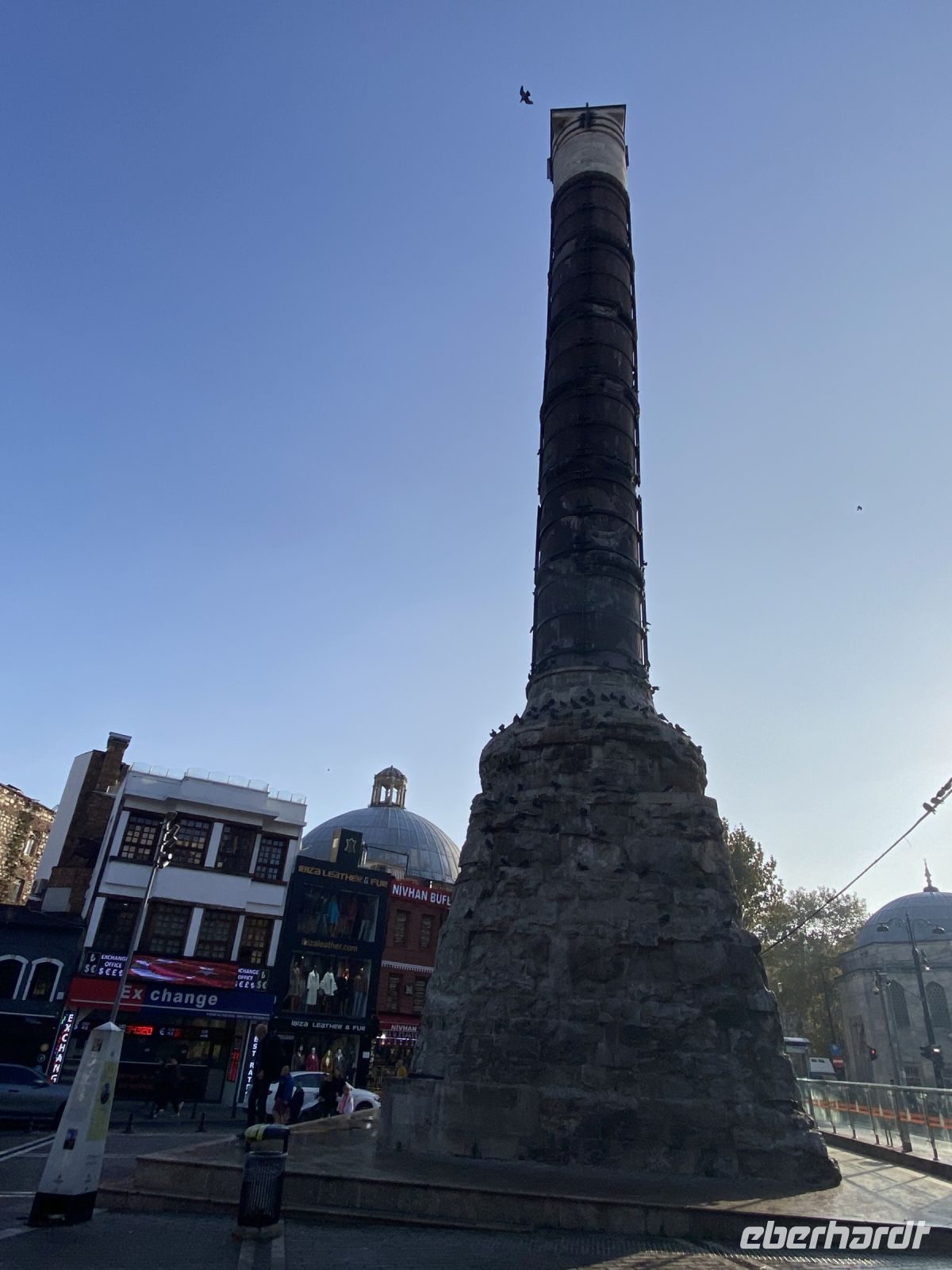 Die Mittagspause verbringen wir in kleinen Gruppen in Cafés in der näheren Umgebung, einige besuchen mit Baris die Yerebatan-Zisterne, die auch Cisterna Basilica oder Versunkener Palast genannt wird. In diese Zisterne, mit einem Fassungsvermögen von 80.000 Kubikmetern, wurde ab dem sechsten Jahrhundert Wasser aus den nahegelegenen Wäldern über Aquädukte von über 19 Kilometer Länge geleitet, um den kaiserlichen Palast zu versorgen. Die Zisterne dient heute nicht nur als Touristenattraktion sondern auch als Kulisse für Filmszenen. Mit einer Größe von 135 Meter Länge und 65 Metern Breite, wird die Decke von 336 bis zu acht Meter hohen Säulen getragen. Der Boden ist mit Wasser bedeckt, in dem sich die Säulen und zahlreiche Lichtskulpturen mystisch spiegeln.