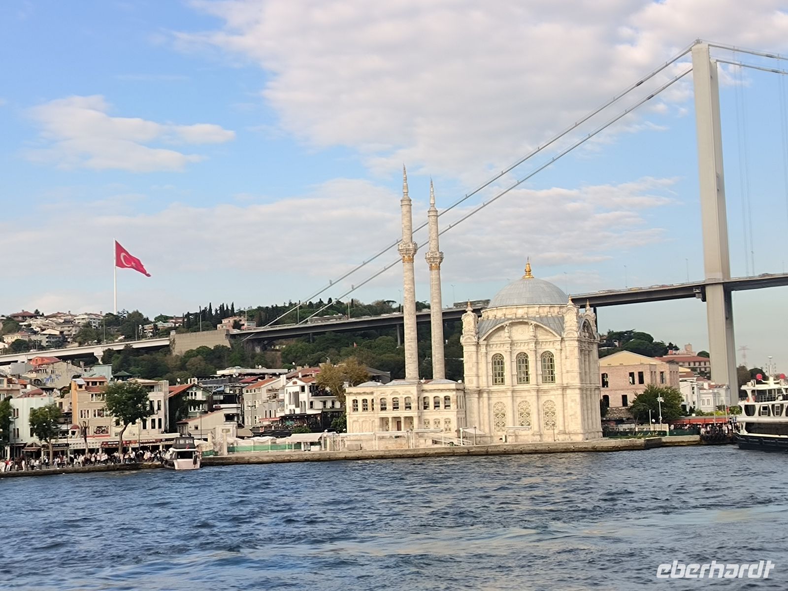 Der Weg zum Boot hat es wieder in sich, aber wir erreichen es pünktlich zur Abfahrt über den Bosporus. Nochmal erleben wir den Übergang vom Okzident zum Orient und wieder zurück. Die Abendsonne spiegelt sich im Wasser. Die Kuppeln und Minarette der Moscheen ragen überall zwischen Holzhäusern, Villen und Wolkenkratzern hervor. Die gigantische Bebauung der 5.343 km² großen Stadt in ihrer Ausdehnung wird sichtbar.