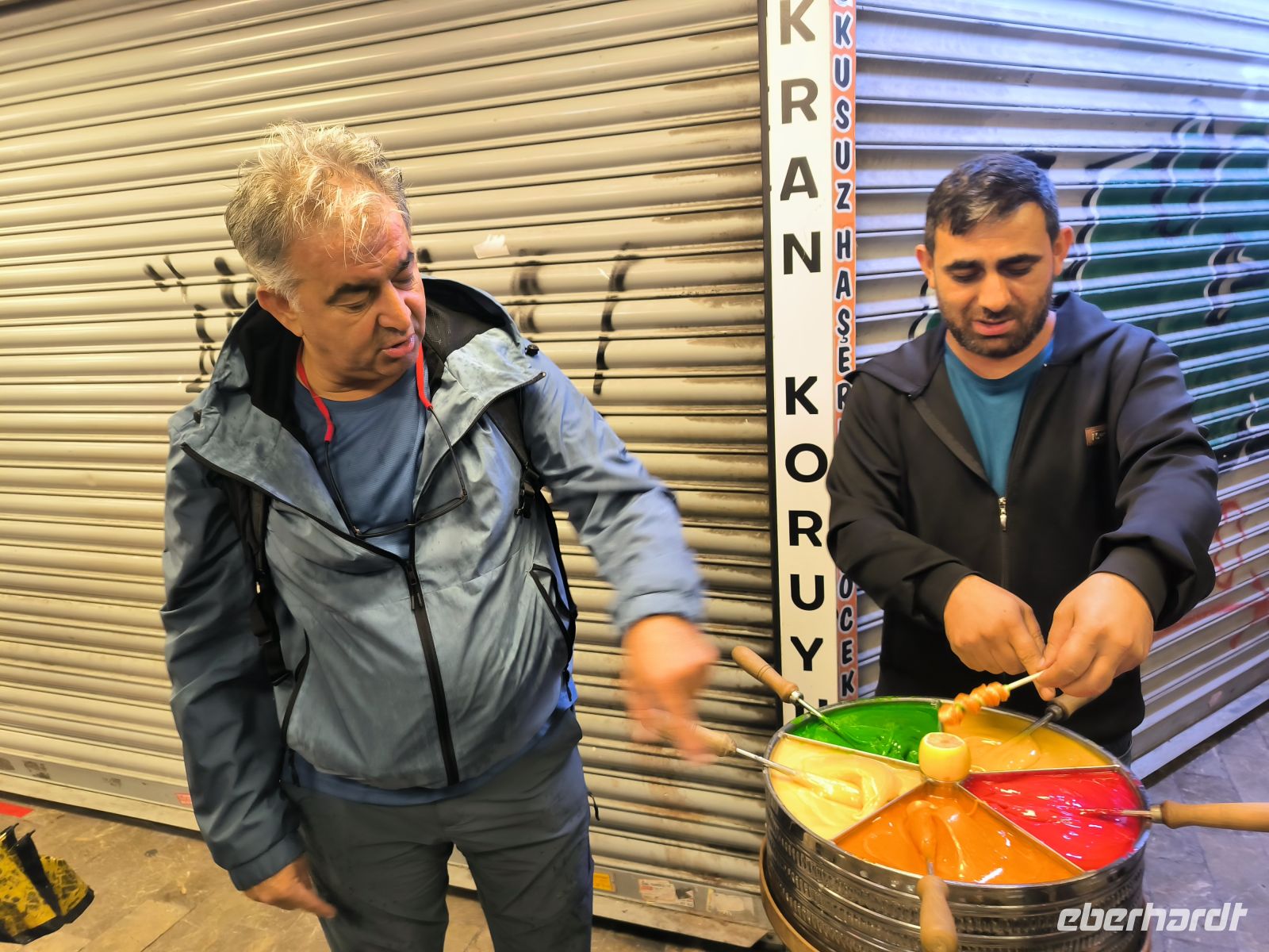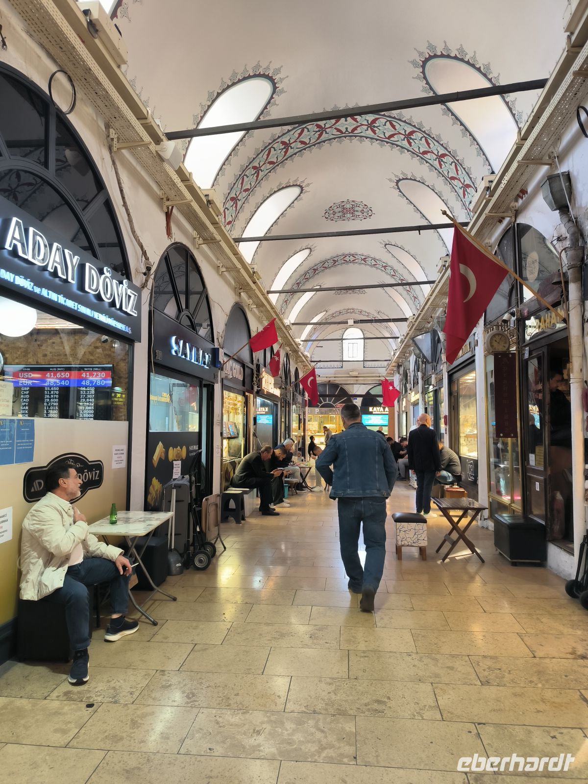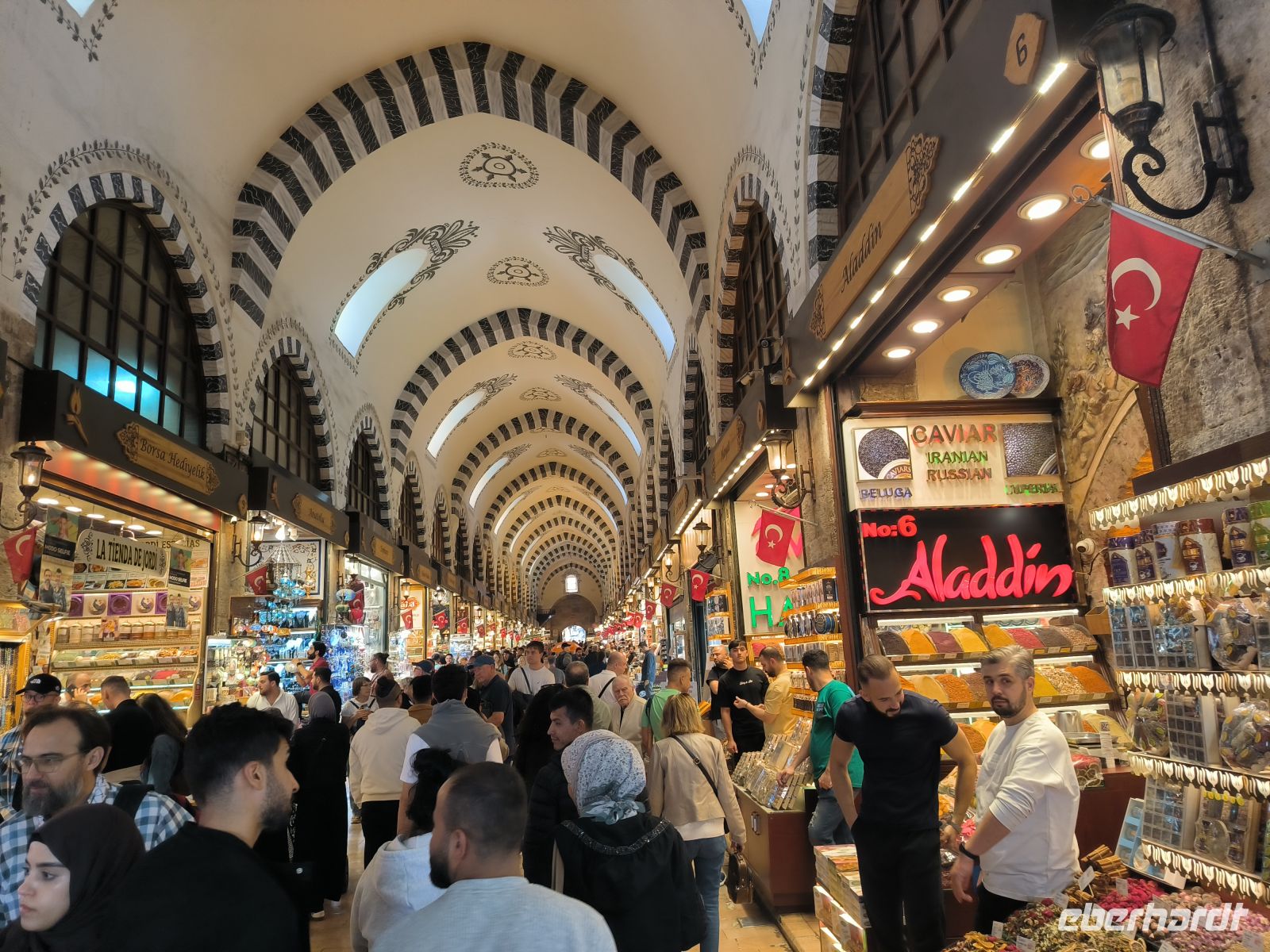 Nach einem kurzen Blick in die unterirdische Zisterne geht es weiter zum nahegelegenen Hippodrom. Auf diesem großen Platz erahnen wir die historische, prunkvolle Pferderennbahn. Da der heutige Sultan-Ahmet-Platz heute etwa zwei Meter höher als die antike Pferderennbahn liegt, ragen die historischen Überreste wie Schlangensäule und Obelisken aus Vertiefungen hervor. Der Pavillon mit der grünen Kuppel am Ende des Platzes, der “Deutsche Brunnen“ war ein Geschenk für Sultan Abdülhamid II. und wurde im Jahre 1900 im Andenken an den Besuch des deutschen Kaisers Wilhelm II. im Jahre 1898 errichtet. Inzwischen hat sich der Platz gefüllt mit Demonstranten, die angesichts der bevorstehenden Friedensgespräche für ein freies Palästina demonstrieren möchten, Die Türkei unterstützt dieses Anliegen. Weil die Stadt deshalb sehr voll ist, geraten wir in einen Stau nach dem anderen und verlassen am Wasser den Bus. Auch hier wird für die Demonstrationen alles vorbereitet. Nach einer kurzen Mittagspause schlängeln wir uns zu Fuß weiter Richtung Gewürzmarkt. Ein Fest für die Sinne! Wenn es schon Geruchsfotos gäbe, würden wir von hier alle Düfte des Orients mit nach Hause nehmen. So beschränken wir uns auf einige wenige Tee- oder Gewürzsorten.