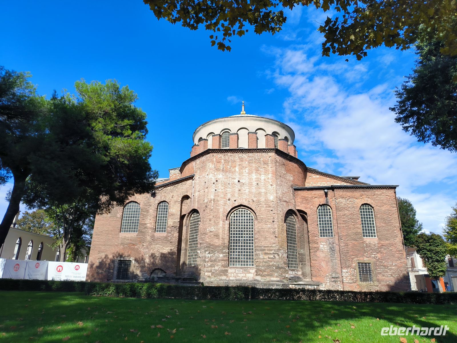 Doch als wir dann zur Moschee Hagia Sophia zurückkehren, hat sich die Schlange davor sehr verkürzt. Die Damen ziehen ihre Kopftücher über und so können wir eines der berühmtesten Bauwerke der Stadt besichtigen, leider nur noch von der oberen Galerie aus. Die Kuppelbasilika wird seit 2020 wieder als Moschee genutzt.