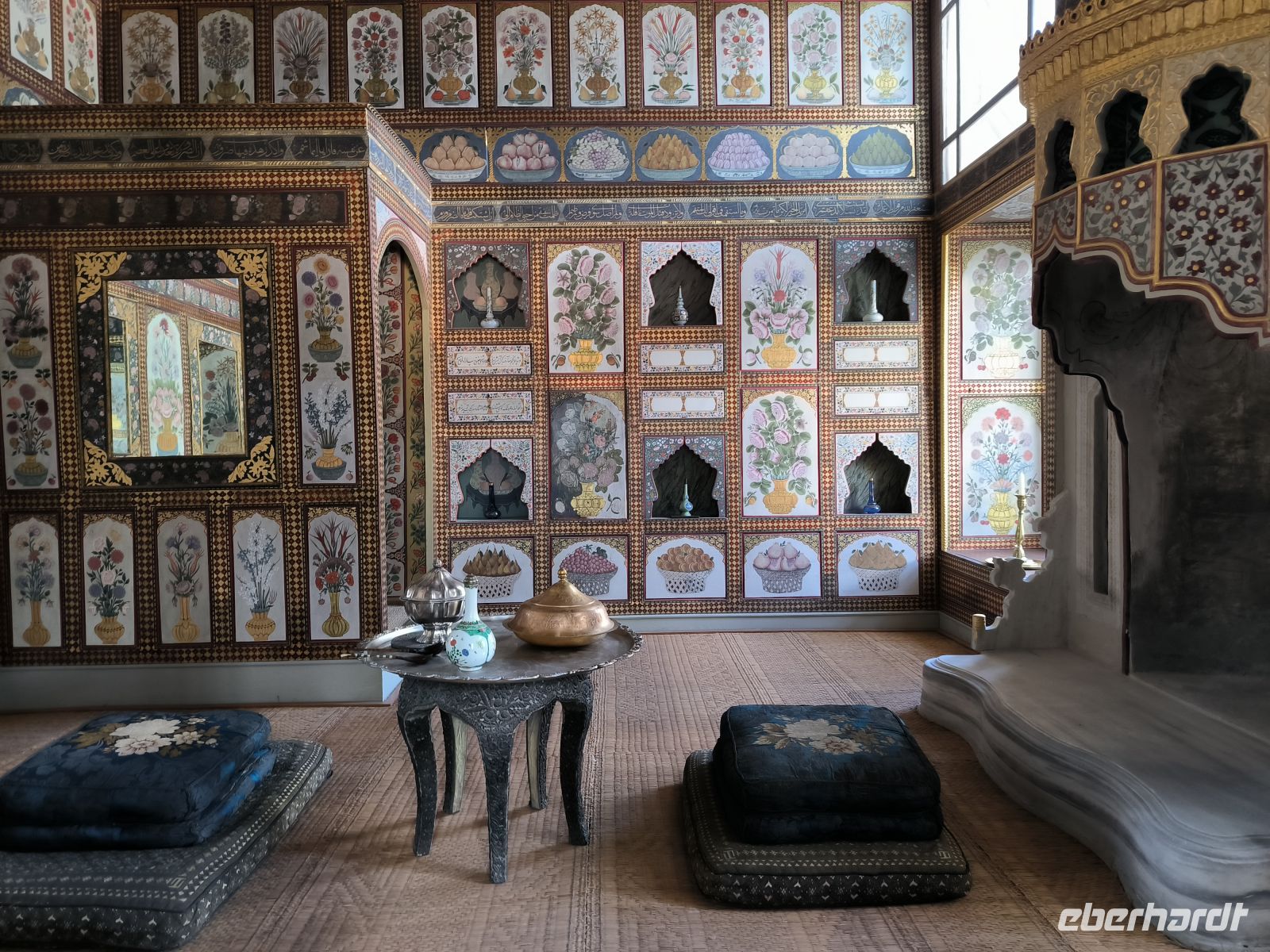 Anschließend reihen wir uns in die Schlange vor der Blauen Moschee ein, doch mit einem „Trick“ von Hüseyin gelingt es uns, etwas schneller ins Innere zu kommen. Auftraggeber Sultan Ahmet – nach ihm heißt die Moschee Sultanahmet Camii – ließ die Wände mit über 21.000 Fliesen aus den Manufakturen von İznik verkleiden. Im Sonnenlicht, das durch 260 Fenster einfällt, schimmern sie grünlich und bläulich, verziert mit Blumenmotiven, darunter Rosen, Tulpen und Nelken. Auch die Bemalung im oberen Teil des Innenraums enthält viele Blautöne. Nun wissen wir, wo der Beiname „Blaue Moschee“ herkommt.