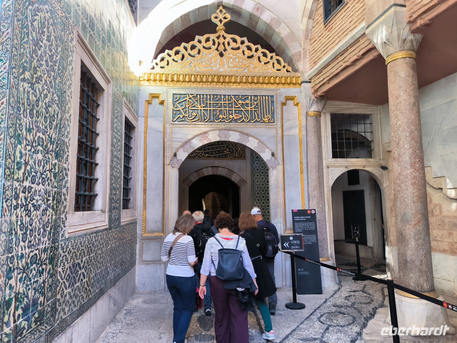 Unweit unseres Hotels befindet sich der große, gedeckte Basar, von dem wir einen ersten Eindruck bekommen, als wir die Goldstraße durchqueren. Die langen Schlangen an den berühmten Moscheen lassen wir zunächst links liegen und begeben uns in den Topkapi Palast, der seit dem 15. Jh. Wohn- und Regierungssitz der Sultane sowie das Verwaltungszentrum des Osmanischen Reiches war. Gleich zu Beginn besichtigen wir die Räumlichkeiten des Harems. Es war der „Verbotene Ort“ (aus dem Arabischen haram = verboten, tabu). Wir sehen die üppig dekorierten Privatgemächer des Sultans und seiner bis zu 2.000 Haremsdamen, die hier unter Leitung der Sultansmutter lebten. In einem abgetrennten Bereich des Harems befand sich auch das sogenannte „Prinzengefängnis“, der goldene Käfig. Hüseyin führt uns gewandt über das große Anwesen, das eher einer eigenen Stadt gleicht als nur einem Palast. Dann bleibt Zeit für eigene Erkundungen, z.B. in der Schatzkammer, oder eine Kaffeepause. Ein heftiger, aber kurzer Regenschauer ergießt sich währenddessen über uns.