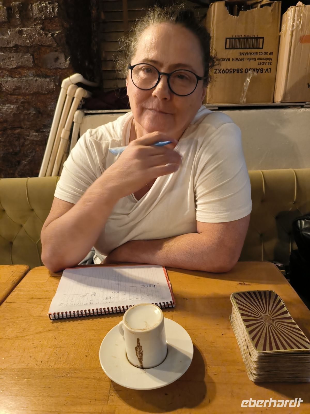 Der Bus holt uns am Morgen in der Nähe des Hotels ab und wir fahren durch die Stadt, die wie Rom auf sieben Hügeln erbaut wurde. Das Besondere hier ist die Verbindung von zwei Kontinenten durch eine gigantische Hängebrücke, die uns direkt von Europa nach Asien führt. Auf dem Camlica Hügel wurde erst in den letzten Jahren eine riesige Moschee erbaut. In einer Bauzeit von nur sechs Jahren entstand die heute größte Moschee des Landes mit sechs Minaretten, die auch ein Museum, eine Kunstgalerie, eine Bibliothek, einen Konferenzsaal und eine Tiefgarage umfasst. Es hatte zu regnen begonnen (Also doch besser aufessen!), aber als wir vom Hügel die Aussicht zum Bosporus genießen möchten, wagt sich der blaue Himmel doch noch durch. Nun fahren wir in das lebhafte Stadtviertel Üsküdar, wo wir das Markttreiben beobachten und eine kurze Teepause machen. Auch auf der anschließenden Bootsfahrt zum „Mädchenturm“, der eigentlich eine Prinzessin vor dem Tod schützen sollte, ist das Wetter gemischt. Im Bus geht es mit der Autofähre zurück auf die europäische Seite und weiter zum bekannten Taksim Platz mit dem Denkmal der Republik. Von hier aus laufen wir die wichtigste Fußgängerzone der Stadt entlang und begegnen den historischen Straßenbahnen. Die Straße İstiklâl Caddesi wird von Gebäuden aus dem 19. Jh. mit internationalen Ketten, einer Kirche, Kinos, Restaurants und Cafés gesäumt. Menschenmassen bevölkern auch das dichte Netz aus Seitenstraßen mit Bars, wo wir unser nächstes Ziel finden. Im Café Damlalar erwartet uns eine Wahrsagerin. Wir bekommen eine Tasse schwarzen, türkischen Mokka, aus deren Kaffeesatz uns nun einzeln die Zukunft vorhergesagt wird. Es ist schon erstaunlich, was die Fachfrau aus dem jeweiligen Kaffeesatz herauslesen kann und wir sind gespannt, was sich davon bewahrheitet. Ein neuer Lebenspartner oder neue berufliche Herausforderungen? Wir werden sehen…