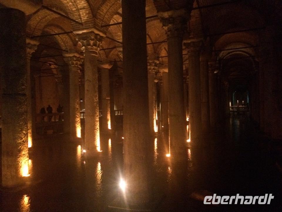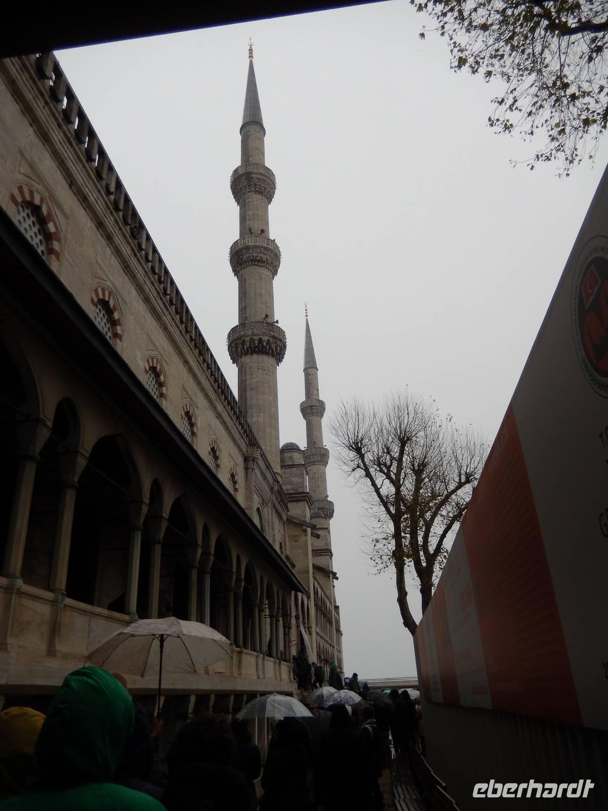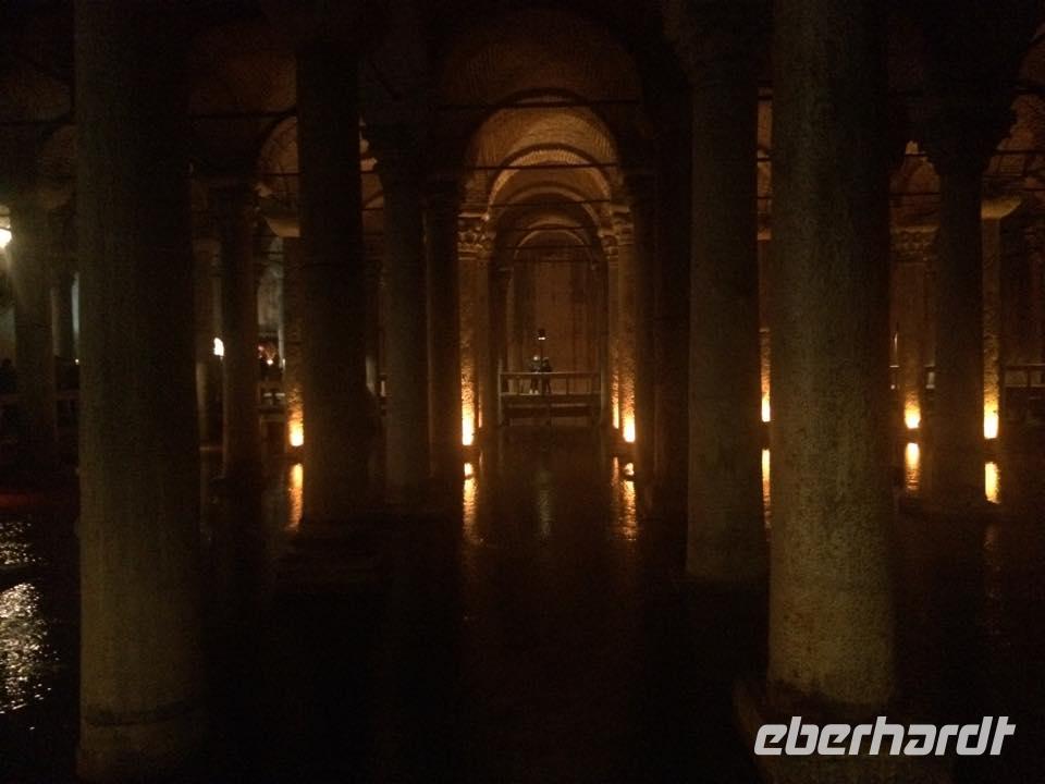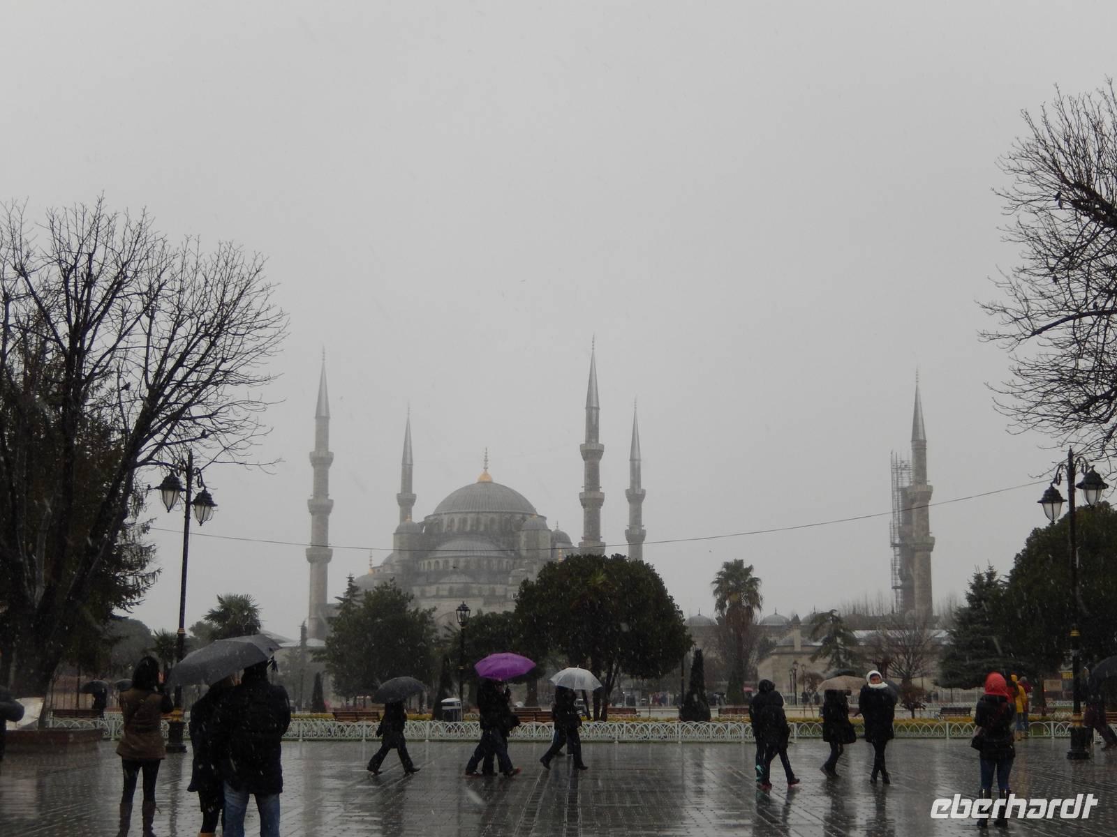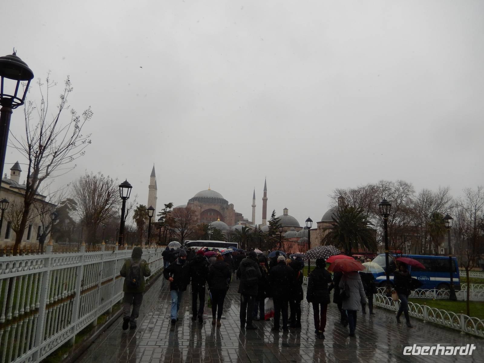 Eine lange Menschenschlange erwartet uns vor der Blauen Moschee, denn diese ist ein vielbesuchter Ort. Auch bekannt als Sultan Ahmet Moschee (wie das Stadtviertel), verfügt Sie über 6 Minaretten und ist damit einzigartig. Unzählige blau-grüne Kacheln wurden hier zu einem wunderschönen Mosaik zusammengeführt. Unter dieser Pracht erstreckt sich ein roter Teppich mit riesigen, tiefhängenden Leuchtern. Wir betreten die Moschee ohen Schuhe und die Frauen bedecken ihren Kopf. Im Kaffee an der Moschee wärmen wir uns kurz bei einer heißen Schokolade auf. Dann geht es weiter zur Ayasofya Müzesi, besser bekannt als Hagia Sophia. Die ehemalige Moschee wurde als Museum umfunktioniert und kann daher mit Schuhen und unverhüllt betreten werden. Das 1500 Jahre alte prächtige Bauwerk schimmert von Außen rötlich und verfügt über 4 Minaretten. Einst war es die größte Moschee der Menschheit, was sich aber mit Übernahme der Herrschaft durch Sultan Ahmet änderte. Wir spazieren durch die riesige Halle mit den wunderschönen Mosaiken und hören Serdars Erzählungen über vergangene Zeitalter zu. Besonders eindrucksvoll sind die 7,5 Meter größen Holzschilder mit Kalligrafien der acht heiligsten Namen des Islams. Anschließend haben wir Zeit zum individuellen Rundgang oder zum Besuch der Galerie in der oberen Etage. Dann begeben wir uns in den Untergrund Istanbuls. Hier verbirgt sich die Yerebatan Zisterne, oft bezeichnet als das "versunkene Schloss" des ehemaligen Konstantinopels. Die Zisterne diente vormals der Wasserversorgung. Geheimnisvolle, leise Musik versetzt uns hier in die passende Stimmung. Wir spazieren entlang der 336 Marmorsäulen ins Innere der Zisterne. Am hinteren Ende finden wir die in Stein gemeißelten antiken Medusenhäupter. Diese stehen verkehrtherum um tragen eine Säule.