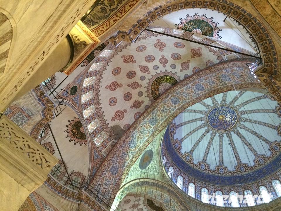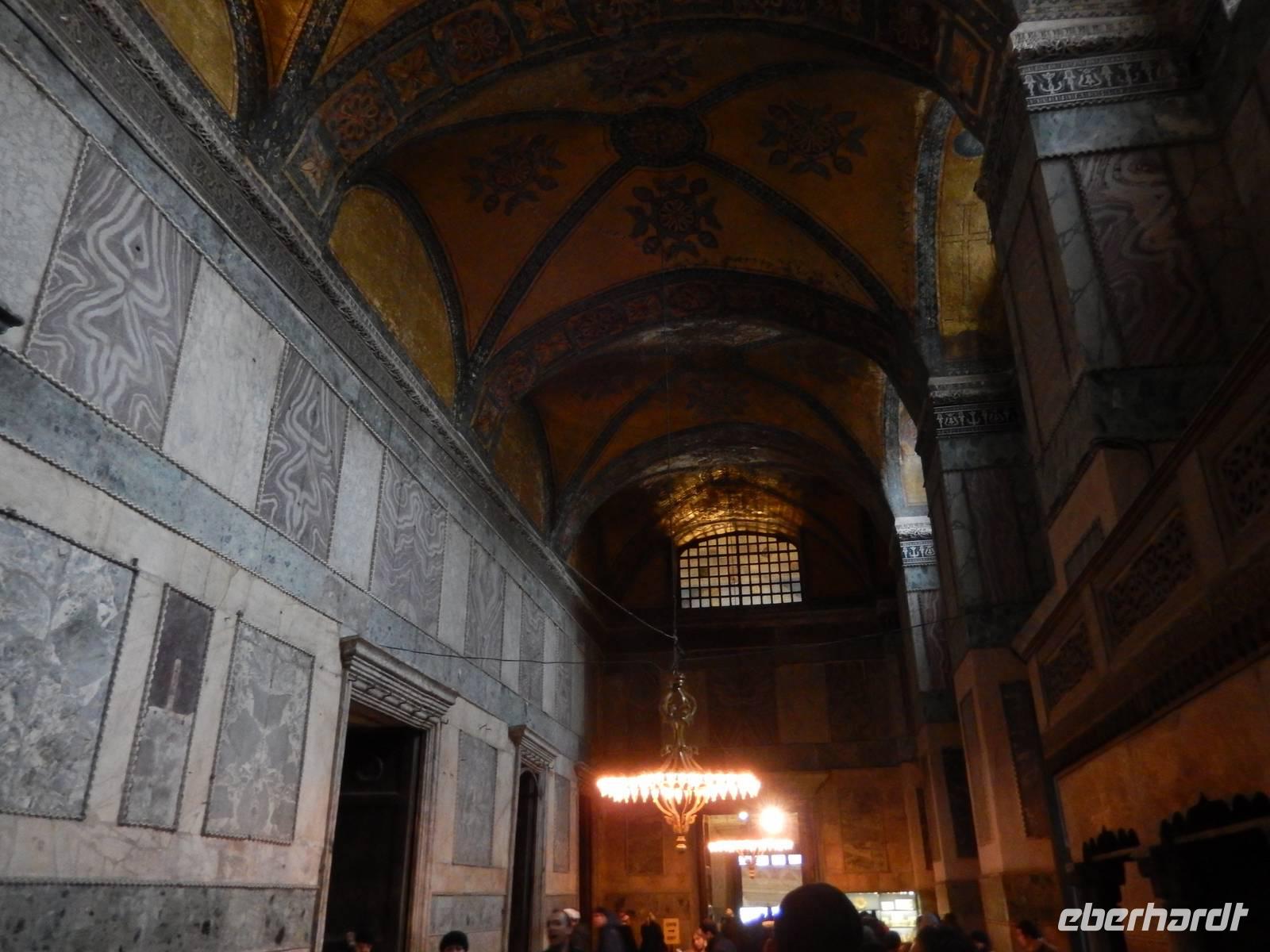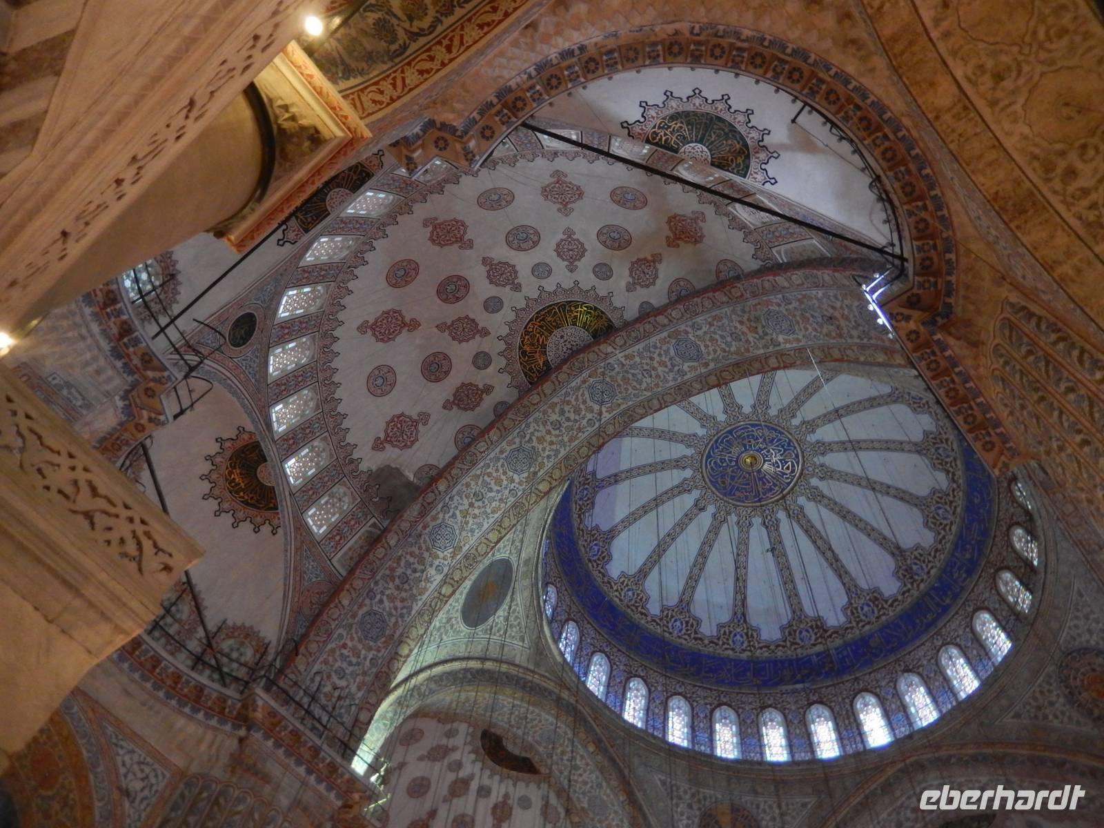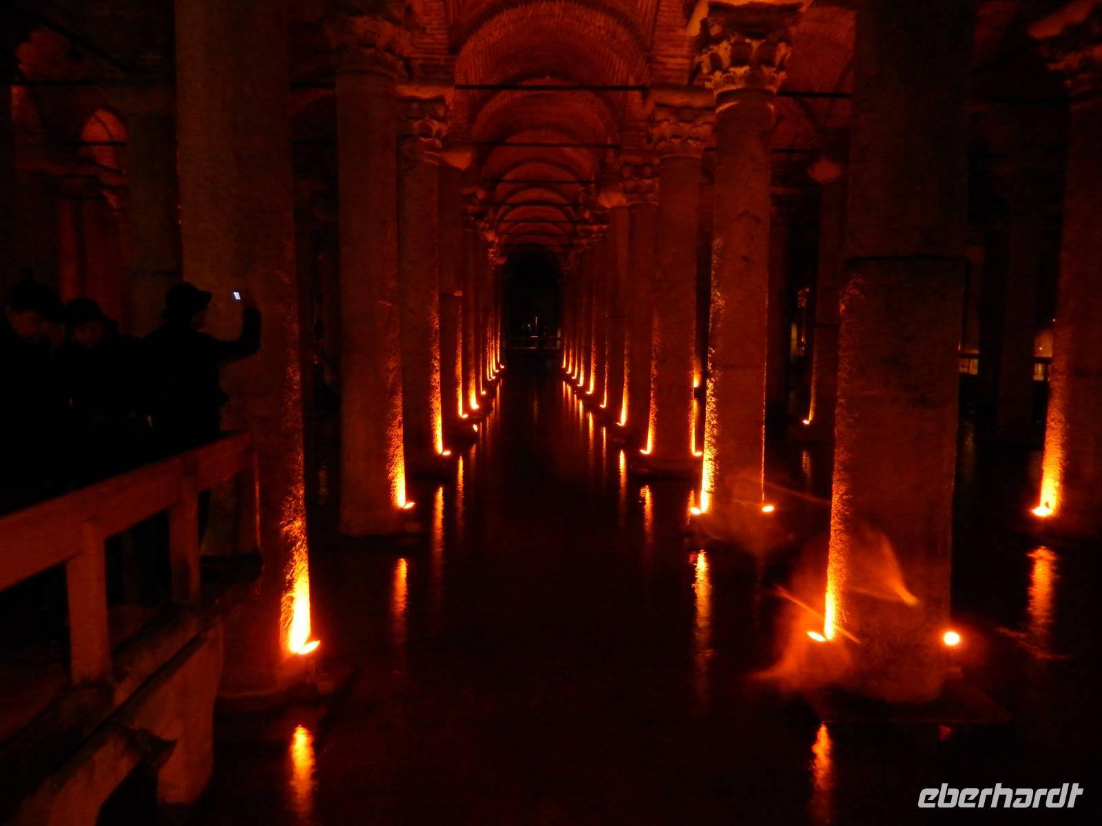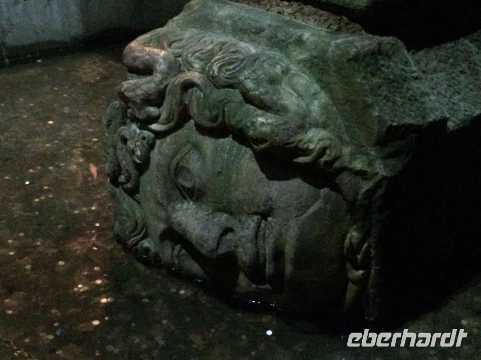 Eine lange Menschenschlange erwartet uns vor der Blauen Moschee, denn diese ist ein vielbesuchter Ort. Auch bekannt als Sultan Ahmet Moschee (wie das Stadtviertel), verfügt Sie über 6 Minaretten und ist damit einzigartig. Unzählige blau-grüne Kacheln wurden hier zu einem wunderschönen Mosaik zusammengeführt. Unter dieser Pracht erstreckt sich ein roter Teppich mit riesigen, tiefhängenden Leuchtern. Wir betreten die Moschee ohen Schuhe und die Frauen bedecken ihren Kopf. Im Kaffee an der Moschee wärmen wir uns kurz bei einer heißen Schokolade auf. Dann geht es weiter zur Ayasofya Müzesi, besser bekannt als Hagia Sophia. Die ehemalige Moschee wurde als Museum umfunktioniert und kann daher mit Schuhen und unverhüllt betreten werden. Das 1500 Jahre alte prächtige Bauwerk schimmert von Außen rötlich und verfügt über 4 Minaretten. Einst war es die größte Moschee der Menschheit, was sich aber mit Übernahme der Herrschaft durch Sultan Ahmet änderte. Wir spazieren durch die riesige Halle mit den wunderschönen Mosaiken und hören Serdars Erzählungen über vergangene Zeitalter zu. Besonders eindrucksvoll sind die 7,5 Meter größen Holzschilder mit Kalligrafien der acht heiligsten Namen des Islams. Anschließend haben wir Zeit zum individuellen Rundgang oder zum Besuch der Galerie in der oberen Etage. Dann begeben wir uns in den Untergrund Istanbuls. Hier verbirgt sich die Yerebatan Zisterne, oft bezeichnet als das "versunkene Schloss" des ehemaligen Konstantinopels. Die Zisterne diente vormals der Wasserversorgung. Geheimnisvolle, leise Musik versetzt uns hier in die passende Stimmung. Wir spazieren entlang der 336 Marmorsäulen ins Innere der Zisterne. Am hinteren Ende finden wir die in Stein gemeißelten antiken Medusenhäupter. Diese stehen verkehrtherum um tragen eine Säule.