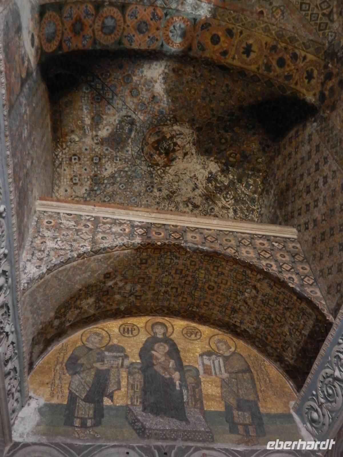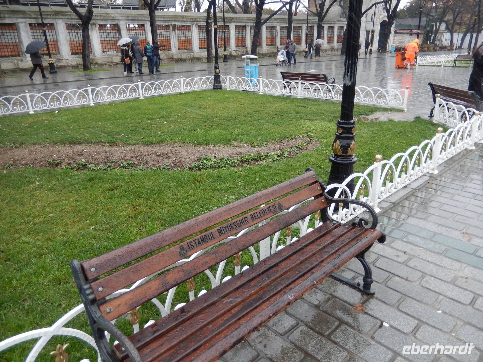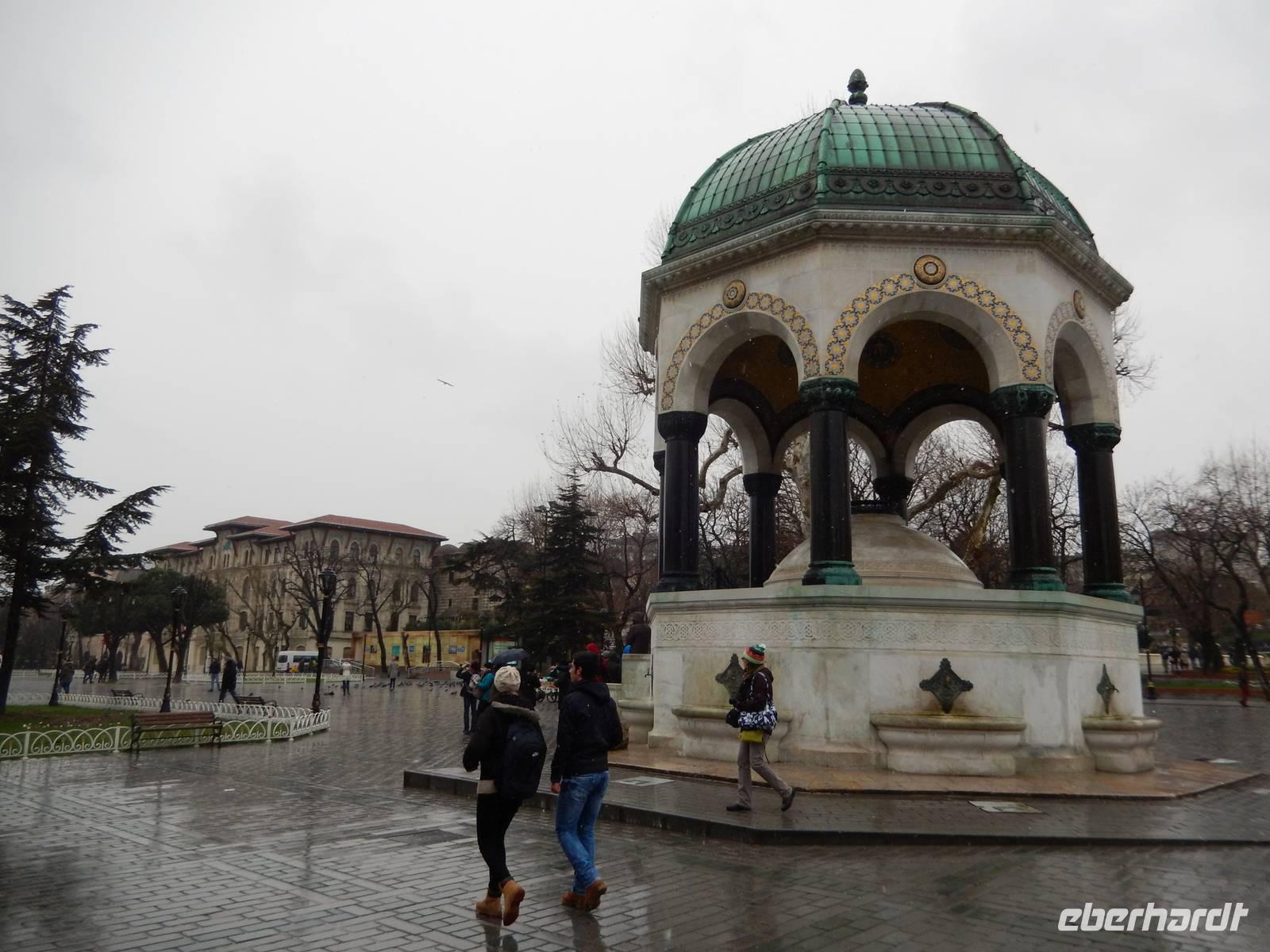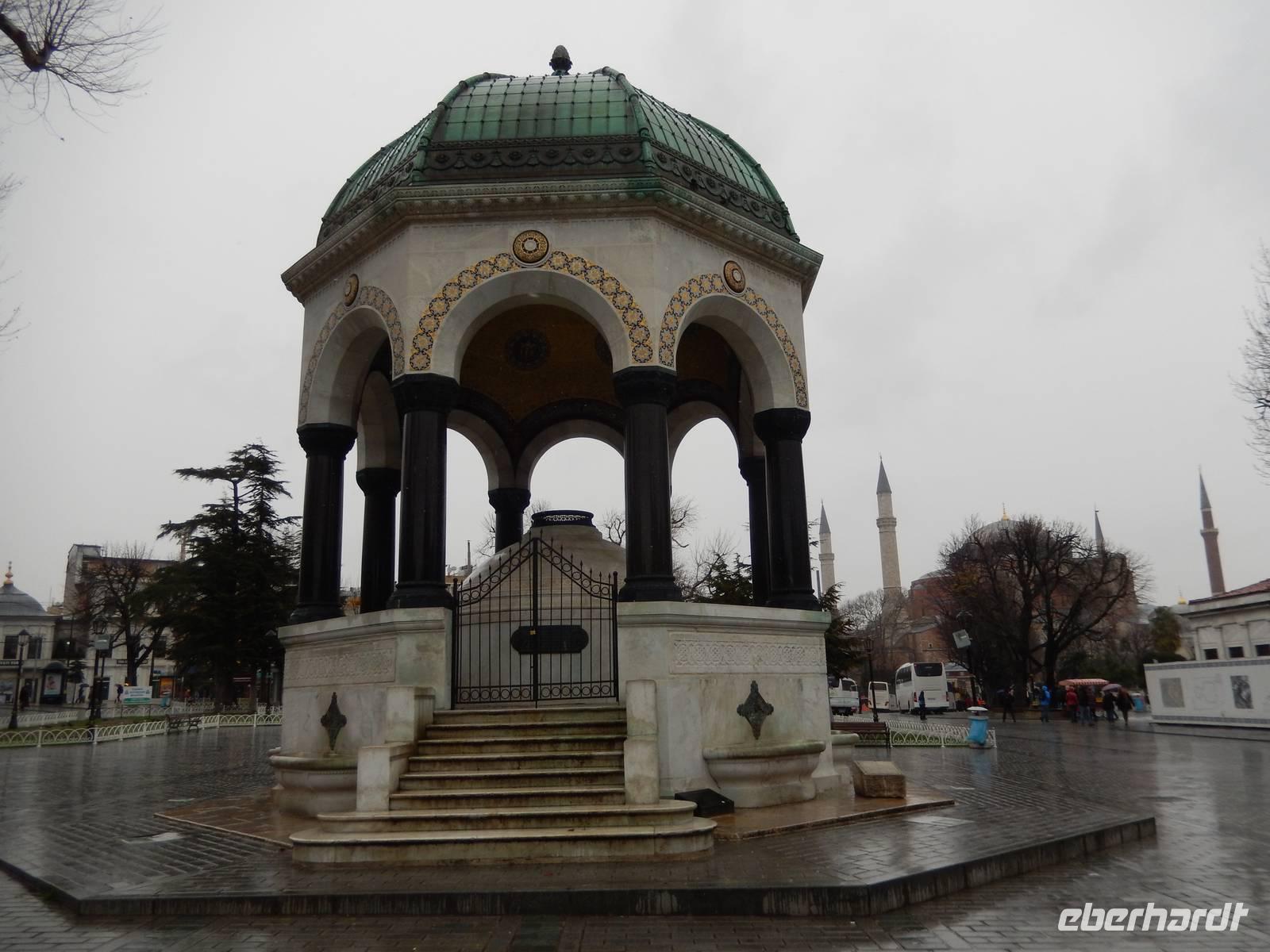 Nach einem reichhaltigen Frühstück versammeln wir uns in den schön ausgebauten Kellergewölben des Hotels. Serdar erklärt uns den geplanten Reiseablauf, denn einige Programmpunkte mussten aufgrund des Wetters und der Feiertagsfeierlichkeiten umgestellt werden. Das Wetter ist heute ziemlich ungemütlich, es ist kalt und schneit ohne Pause. Doch wer hat schon Istanbul bei Schnee erlebt? Wir fahren auf den Platz At Meykani, besser bekannt als Hippodromsplatz. Hier fanden früher die großen Wagenrennen statt. Platz genug für 100000 Zuschauer findet man hier allemal. Serdar zeigt uns die letzten Überreste des Hippodroms. Dies sind die langen Säulen die Kaiser Konstantin in der Mitte der Rennbahn aufstellen ließ. Der ägyptische Obelisk ist die am besten erhaltene Säule und mit seinen Ornamenten besonders schön anzusehen. Gleich dahinter befindet sich der Gemauerte Obelisk. Dann geht es weiter um den Platz und wir gelangen zum Deutschen Brunnen, auch Kaiser-Wilhelm-Brunnen genannt. Dies war ein Geschenk des Gleichnamigen zu dessen Stattsbesuch im Jahr 1898. Letztendlich sehen wir noch die Schlangesäule, die auf Delphi stammen soll. Insgesamt 4 Säulen rahmten den Platz, eine davon wurde von Venezianern im Vierten Kreuzzug verschleppt.
