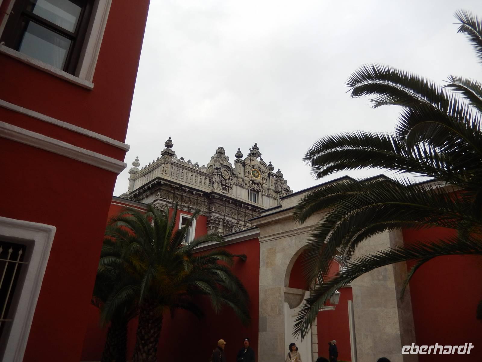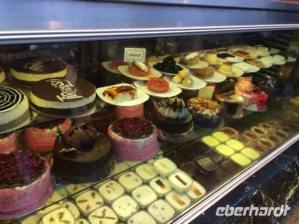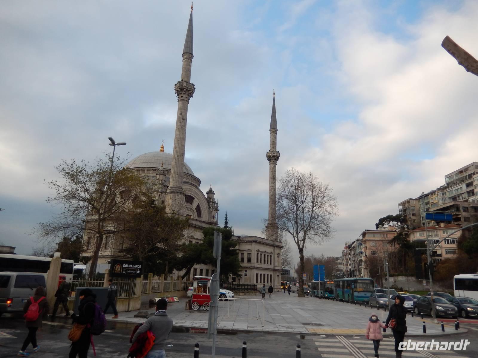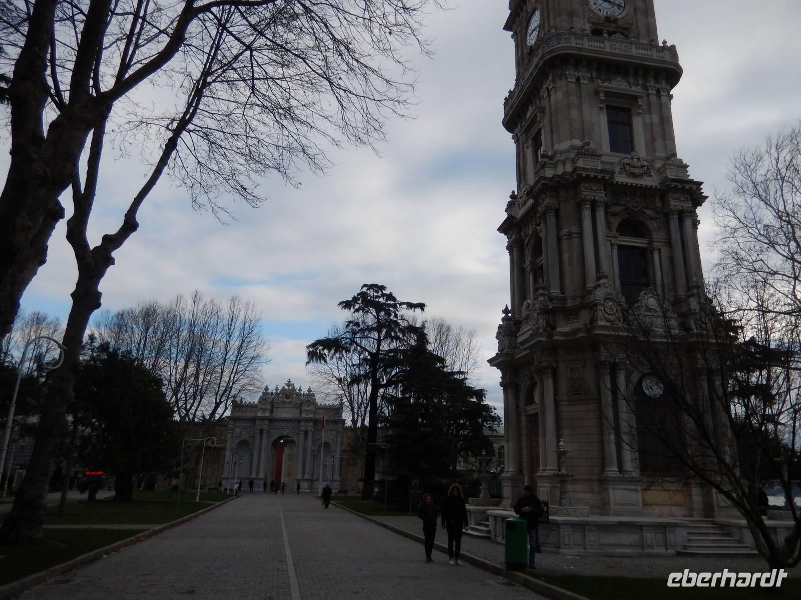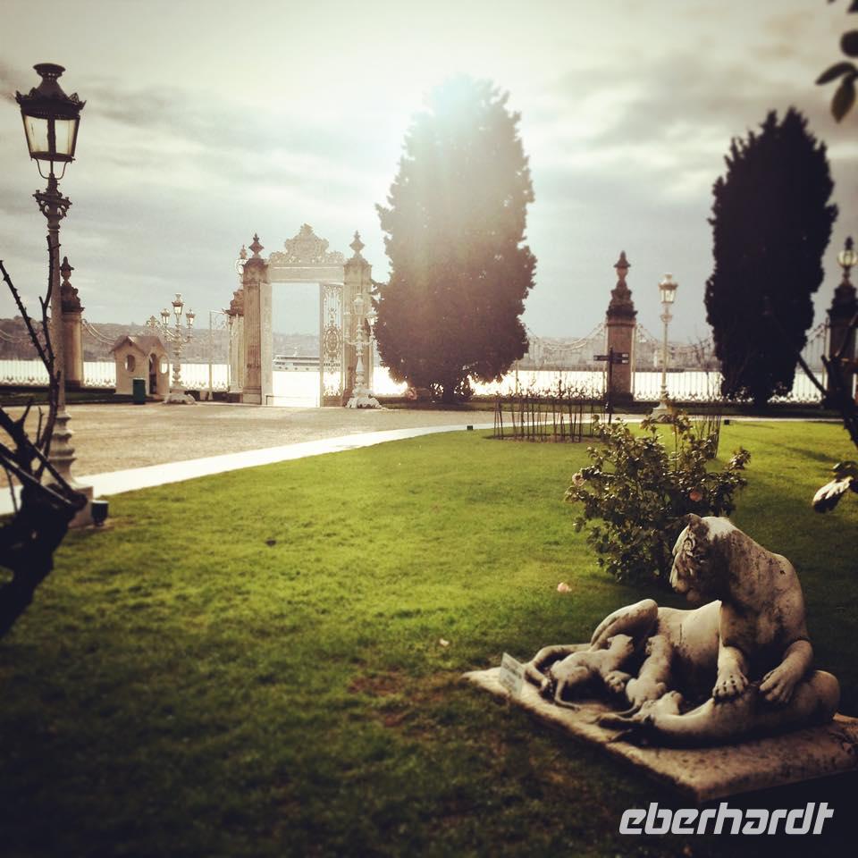 Heute kann jeder wieder seinen Tag nach eigenen Belieben gestalten. Das Wetter meint es heute gut mit uns, es kommt sogar ab und zu ein Sonnenstrahl durch die Wolkendecke. Der Großteil unserer Gruppe begibt sich am Morgen zum Dolmabahce Palast. Diese ehemalige Sultansresidenz wurde erbaut, als dem derzeitigem Herrscher der Topkapi Palast nicht mehr prunkvoll genug erschien. Der Dolmabahce Palast lässt uns wirklich in Staunen versinken. Pompöser kann ein Palast nicht sein, der Ballsaal erinnert an den Innenraum einer Kathedrale. Anschließend fährt die gruppe über die Bosporusbrücke nach Asien. Die Mittagspause findet an einem Supermarkt statt, wo man zum Beispiel guten Granatapfelsirup kaufen kann. Dann geht es weiter zum Tannenhügel, dem Büyük Camlica. Von hier oben hat man einen super Blick über Istanbul. Zum Mittagessen empfiehlt Serdar die türkischen Ofenkartoffeln Kumpir. Anschließend geht es per Boot weiter zum Mädchenturm, dem Kiz Kulesi. Dieser thront auf einer kleinen Insel im Bosporus kurz vor der asiatischen Küste. Um die Geschichte webt sich eine spannende Legende, die man natürlich gleich vor Ort erfährt. Hier wird eine kleine Kaffeepause eingelegt. Nachdem per Boot wieder Land erreicht ist geht es weiter zum Stadtteil Eyüp wo sich der Pierre-Lotti Hügel befindet. Hier bekommen die Eberhardt Gäste heute bei guten Wetter einen tollen Blick auf das Goldene Horn.