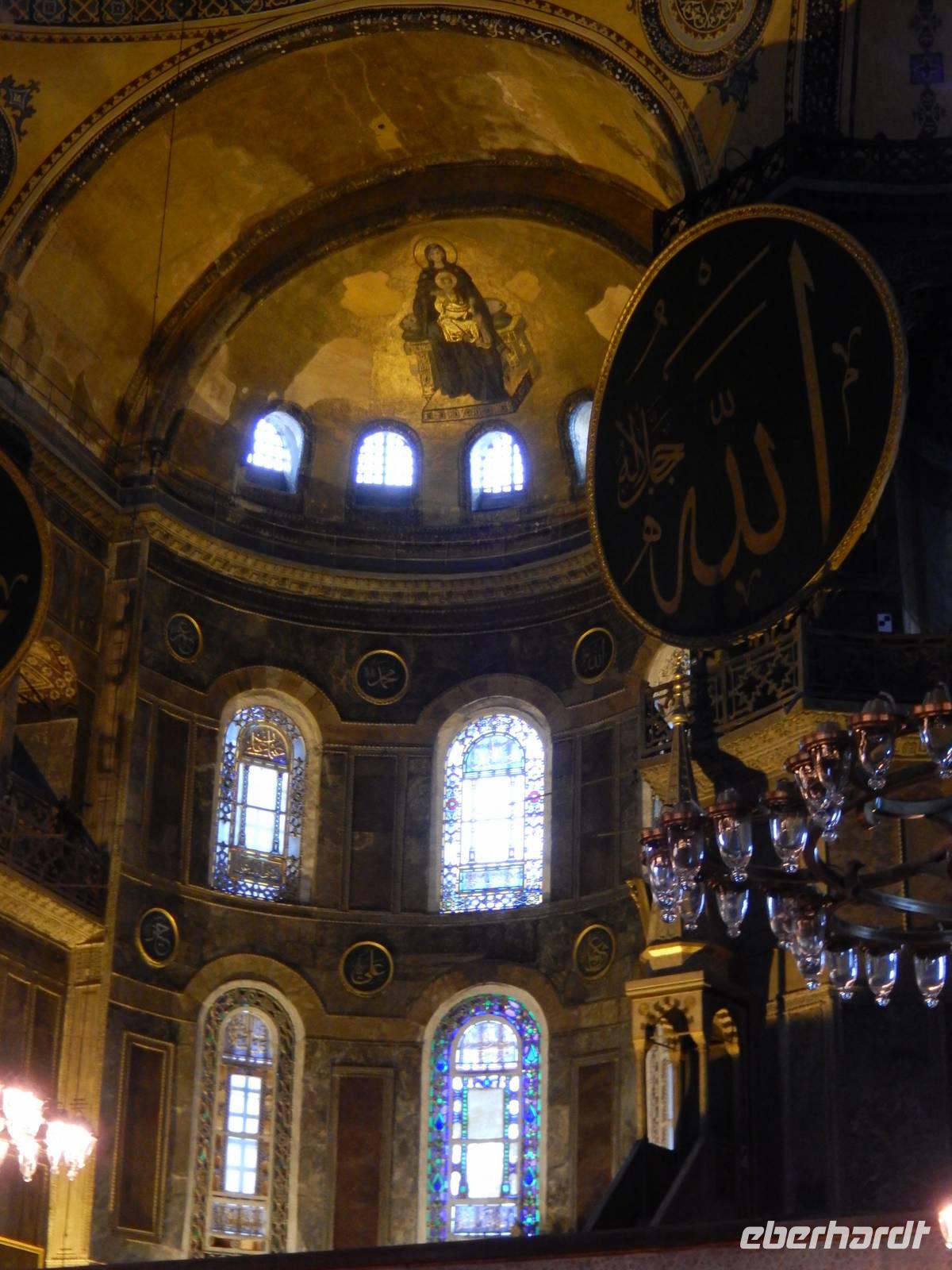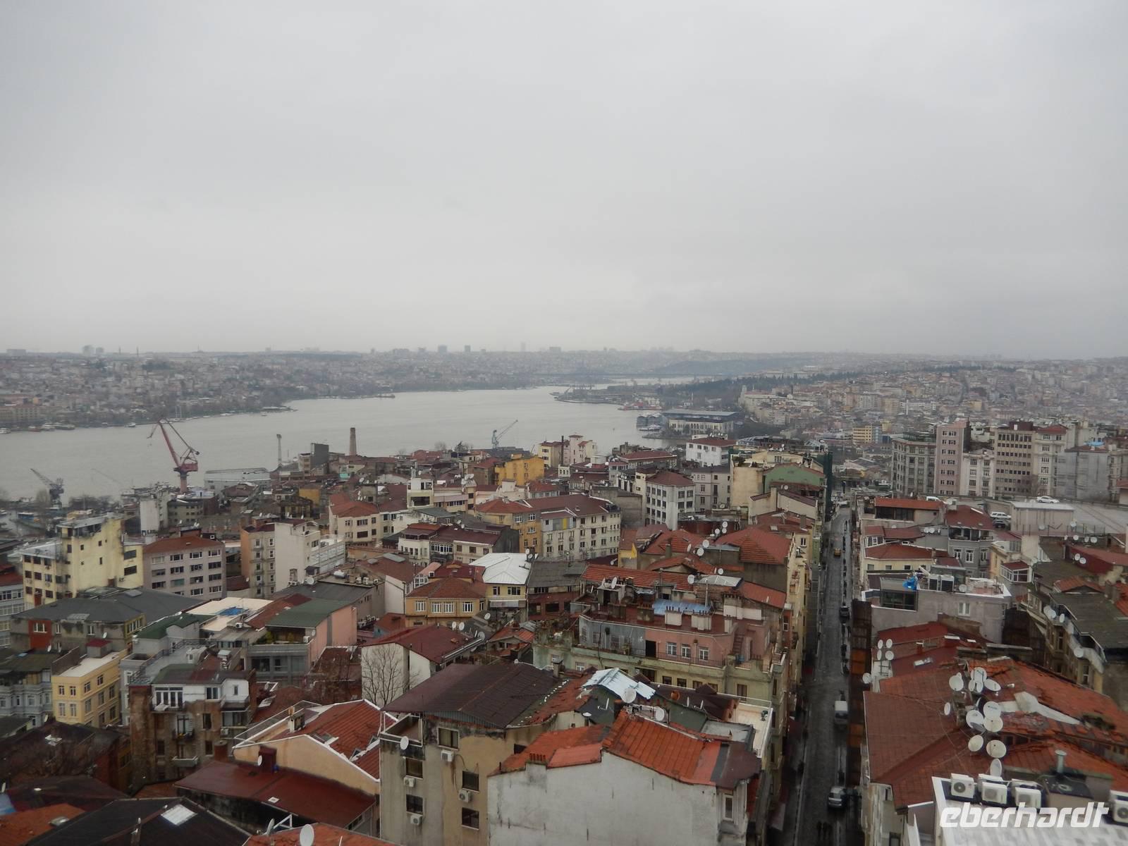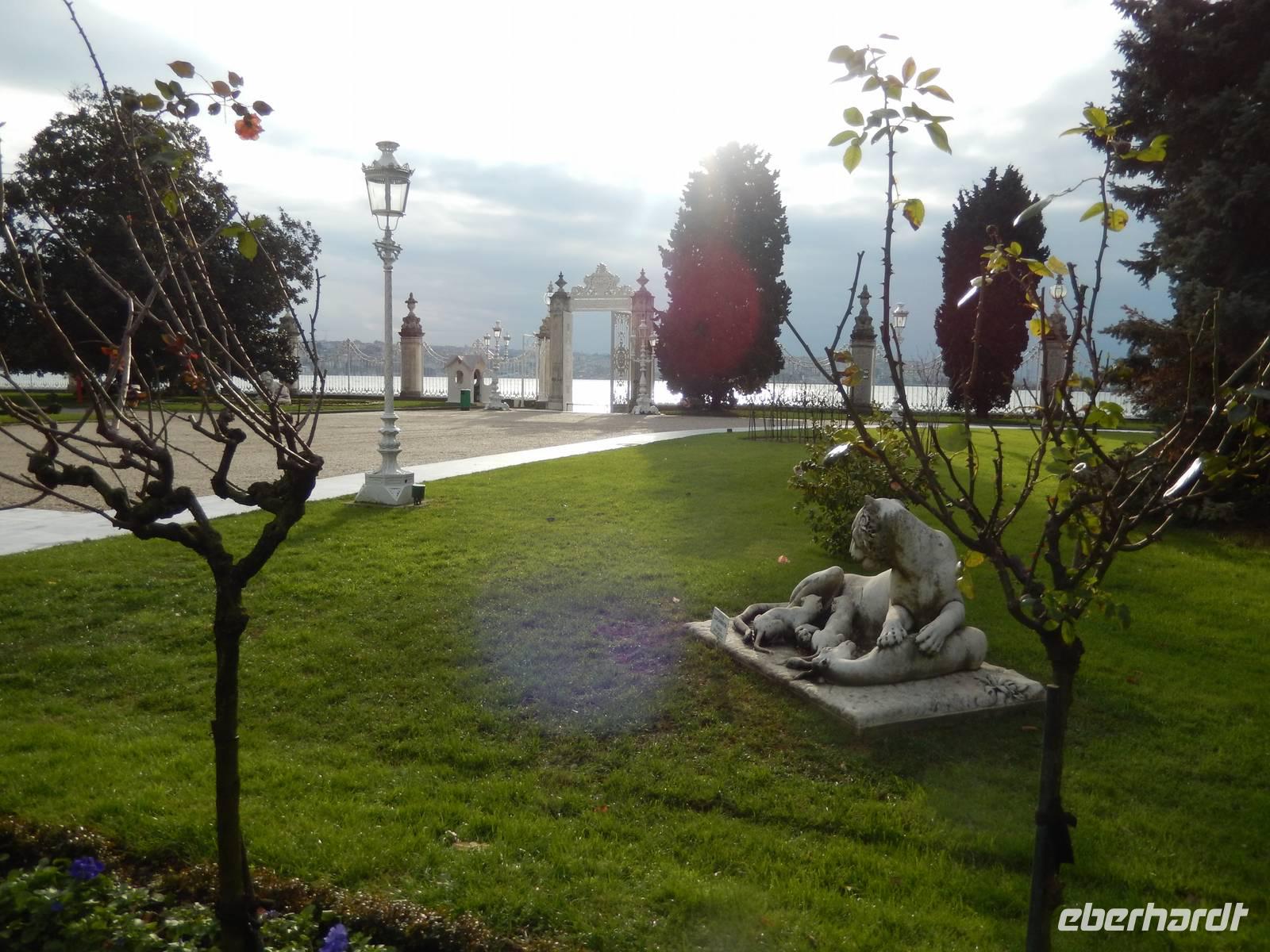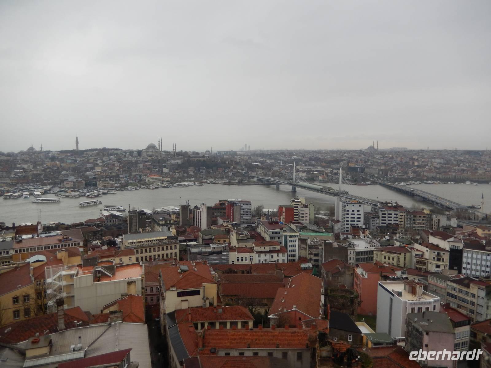 Heute kann jeder wieder seinen Tag nach eigenen Belieben gestalten. Das Wetter meint es heute gut mit uns, es kommt sogar ab und zu ein Sonnenstrahl durch die Wolkendecke. Der Großteil unserer Gruppe begibt sich am Morgen zum Dolmabahce Palast. Diese ehemalige Sultansresidenz wurde erbaut, als dem derzeitigem Herrscher der Topkapi Palast nicht mehr prunkvoll genug erschien. Der Dolmabahce Palast lässt uns wirklich in Staunen versinken. Pompöser kann ein Palast nicht sein, der Ballsaal erinnert an den Innenraum einer Kathedrale. Anschließend fährt die gruppe über die Bosporusbrücke nach Asien. Die Mittagspause findet an einem Supermarkt statt, wo man zum Beispiel guten Granatapfelsirup kaufen kann. Dann geht es weiter zum Tannenhügel, dem Büyük Camlica. Von hier oben hat man einen super Blick über Istanbul. Zum Mittagessen empfiehlt Serdar die türkischen Ofenkartoffeln Kumpir. Anschließend geht es per Boot weiter zum Mädchenturm, dem Kiz Kulesi. Dieser thront auf einer kleinen Insel im Bosporus kurz vor der asiatischen Küste. Um die Geschichte webt sich eine spannende Legende, die man natürlich gleich vor Ort erfährt. Hier wird eine kleine Kaffeepause eingelegt. Nachdem per Boot wieder Land erreicht ist geht es weiter zum Stadtteil Eyüp wo sich der Pierre-Lotti Hügel befindet. Hier bekommen die Eberhardt Gäste heute bei guten Wetter einen tollen Blick auf das Goldene Horn.