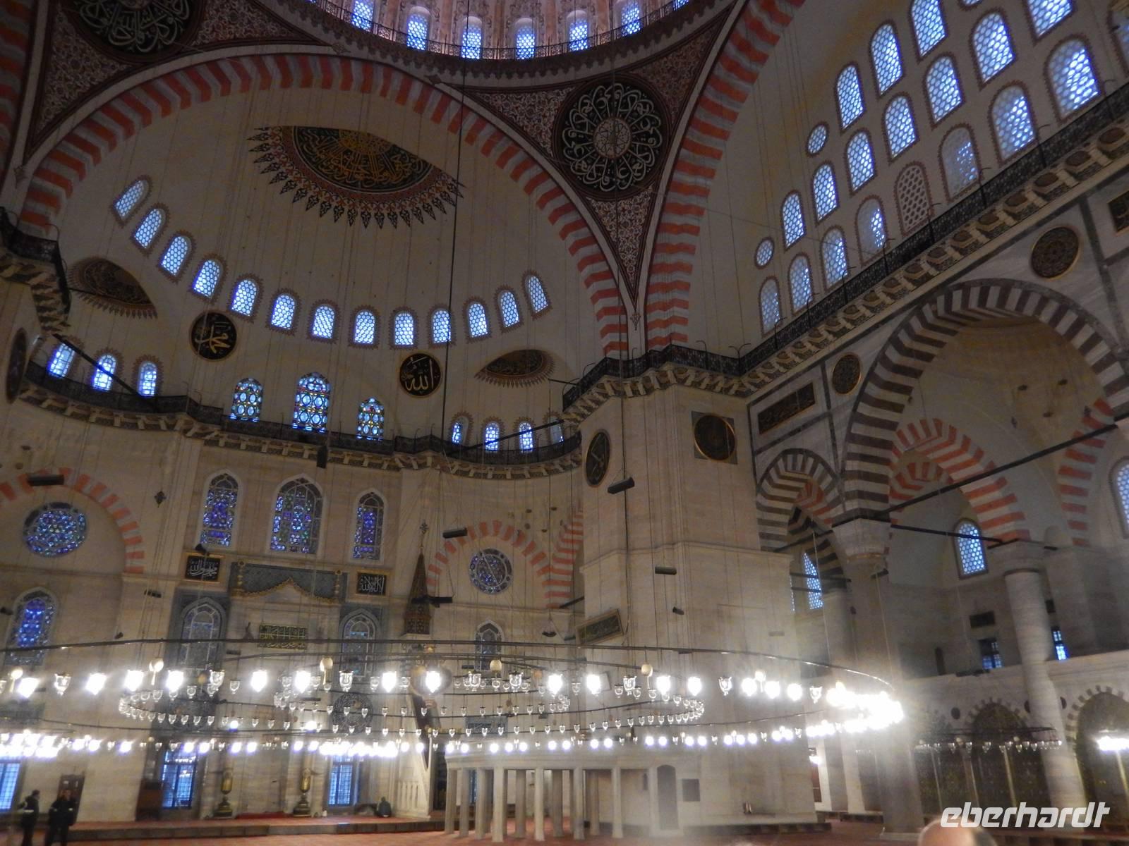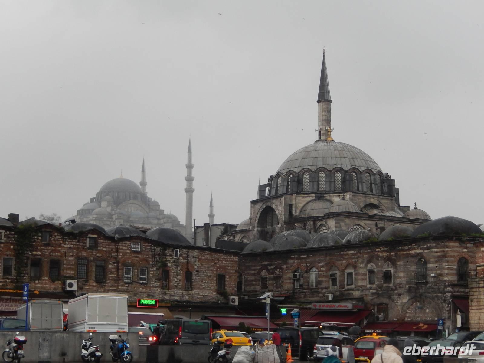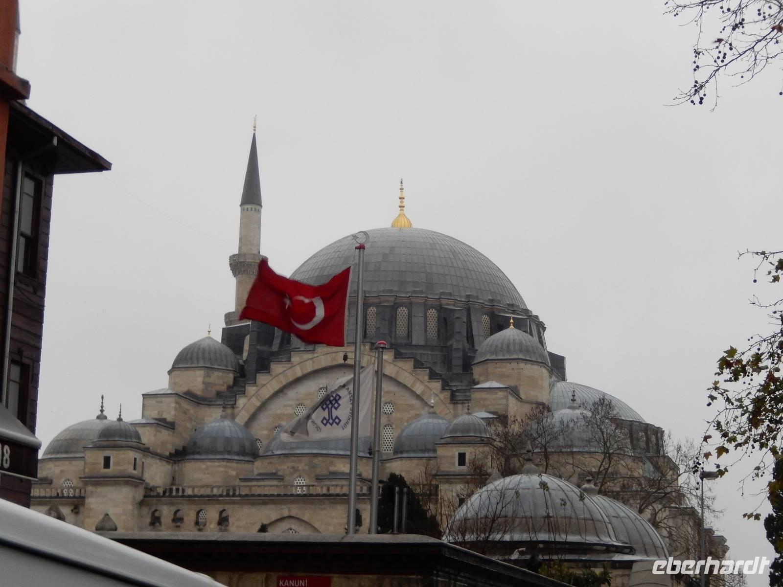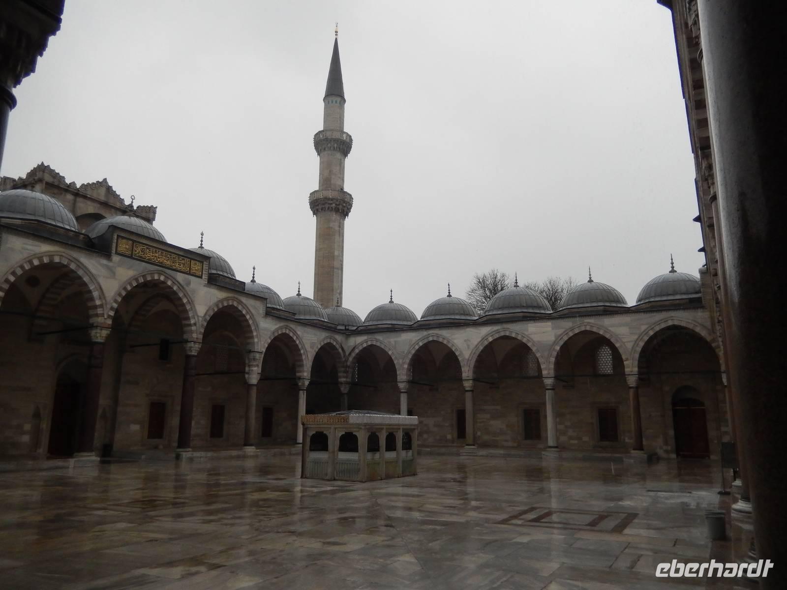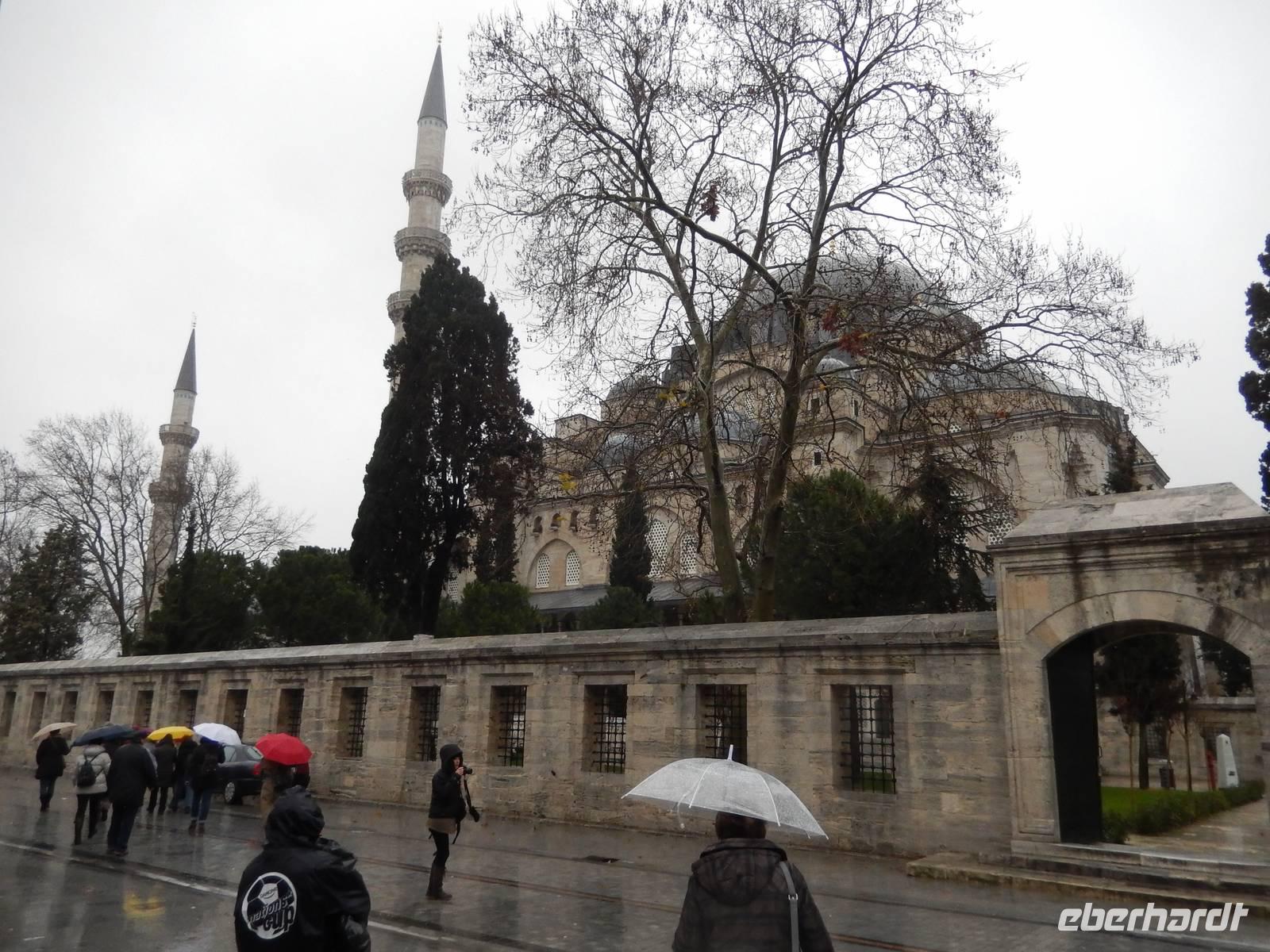 Heute verschont uns der Schnee, dafür regnet es aber den ganzen Tag. Am frühen Morgen machen wir uns nach dem auf den Weg zur Süleymaniye Moschee. Hier angekommen können wir uns nicht entscheiden, ob die Blaue Moschee oder diese hier den Titel der Schönsten Moschee der Stadt verdient. Wieder begeben wir uns barfuß ins Innere. Am frühen Morgen haben wir die Moschee fast für uns allein und so lauschen wir in aller Ruhe Serdars Geschichten und bewundern die schöne Kuppel.