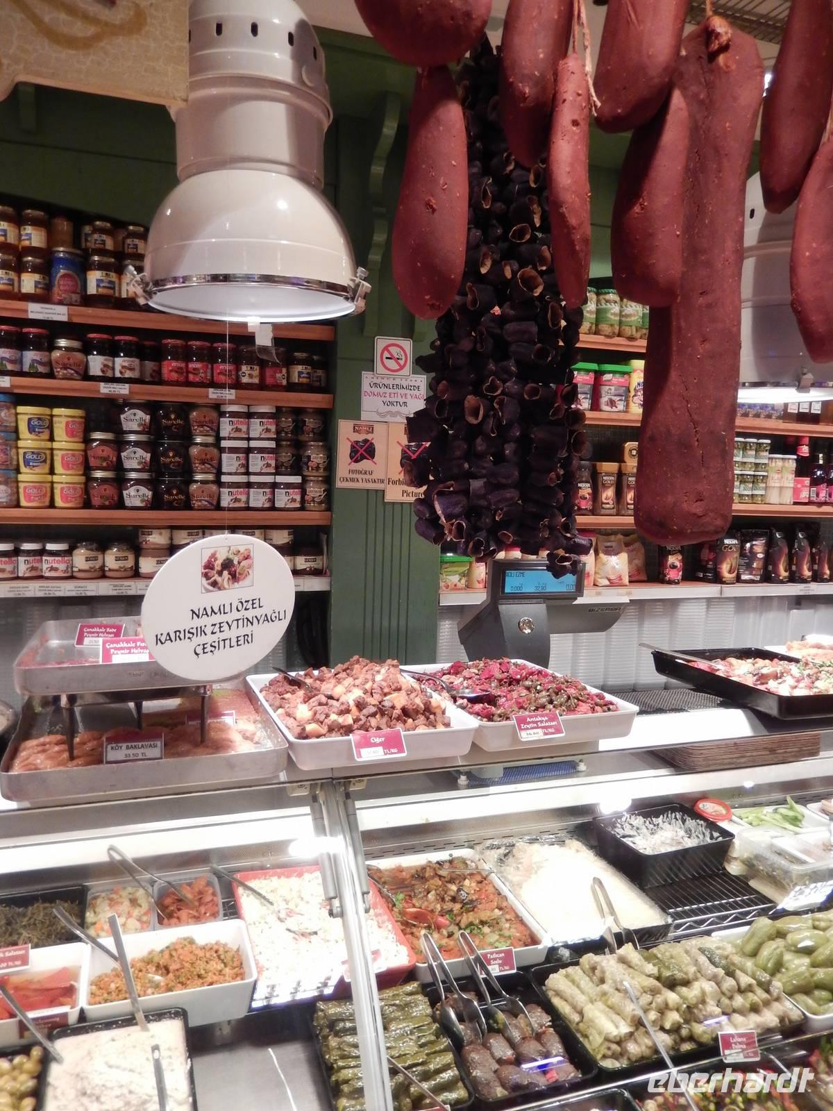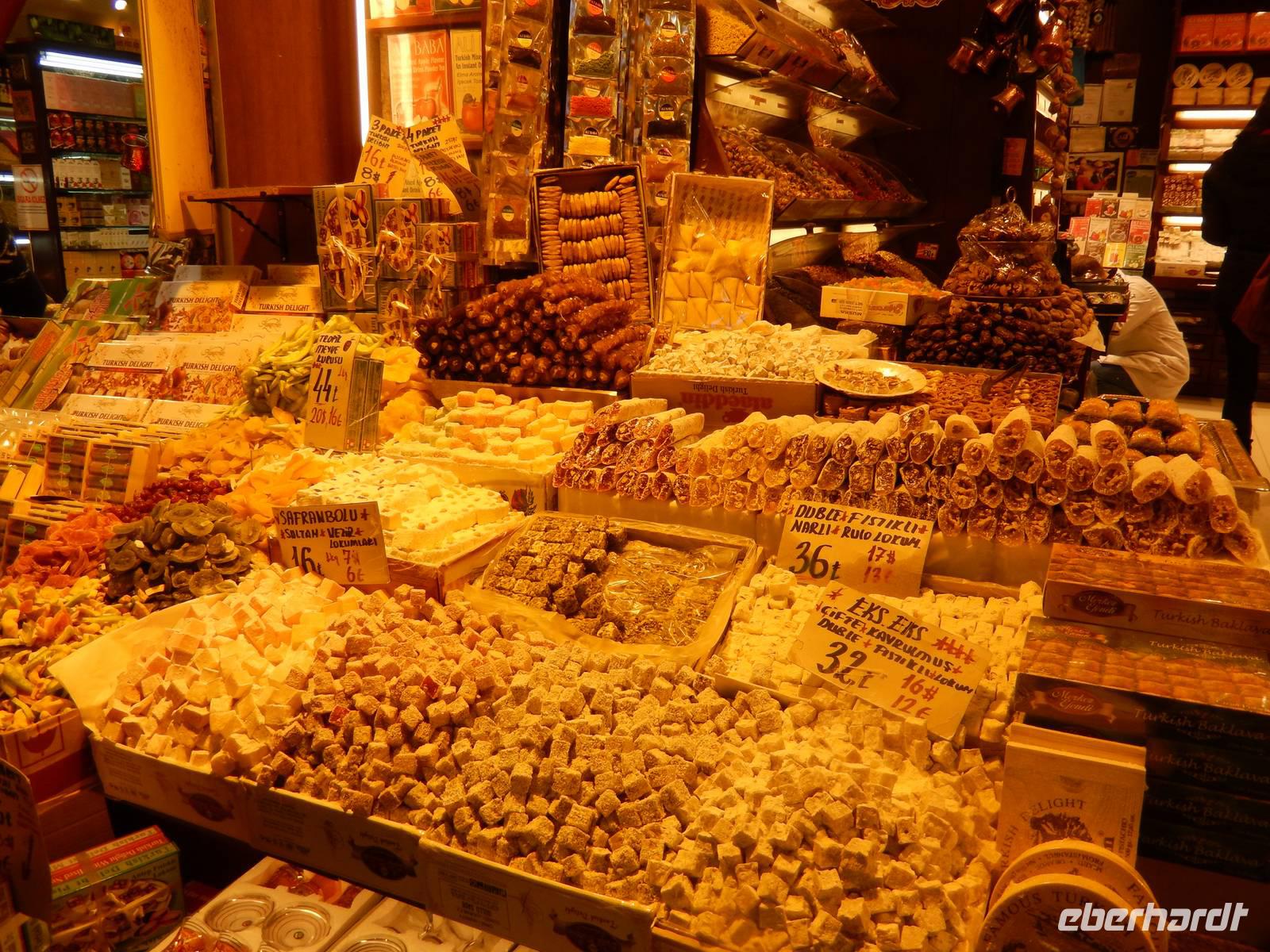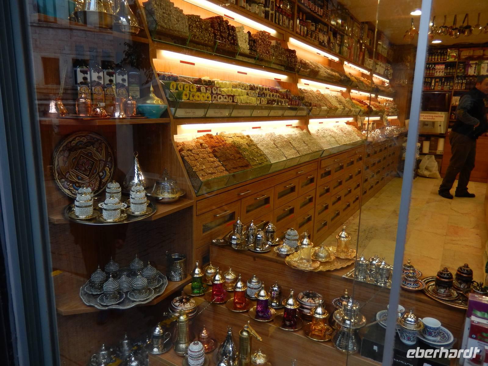 Den restlichen Nachmittag lassen wir auf dem Ägyptischen Bazar ausklingen. Hier finden wir hügelweise Gewürze, Türkischen Honig in allen Geschmacksrichtungen, typische türkische Souvenire wie Mosaiklampen und das bekannte Blaue Auge. Anschließend geht es zurück zum Hotel und wir ruhen uns etwas aus bis es zum Abendessen geht. Heute essen wir in einem typischen Kebap-Haus, untypisch für Touristen, denn hier essen normalerweise nur Einheimische. Wir lassen es uns schmecken und lernen die türkischen Komplikationen beim Alkoholausschank kennen. Um Alkohol ausschenken zu dürfen, bedarf es einer Genehmigung, welche nur Restaurants erteilt werden kann, die sich nicht in der Nähe einer Moschee befinden. Bei der engen Anhäufung von Moscheen in dieser Stadt, kein leichtes Unterfangen. Auch beim anschließenden Zusammensitzen in der Bar, ist kein Bier oder Wein im Hotel vorrätig. Doch der nette Kellner besorgt alles nach unseren Wünschen im gegenüberliegenden Einkaufsmarkt.