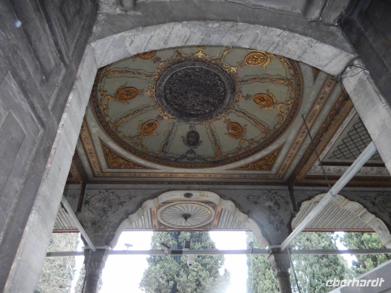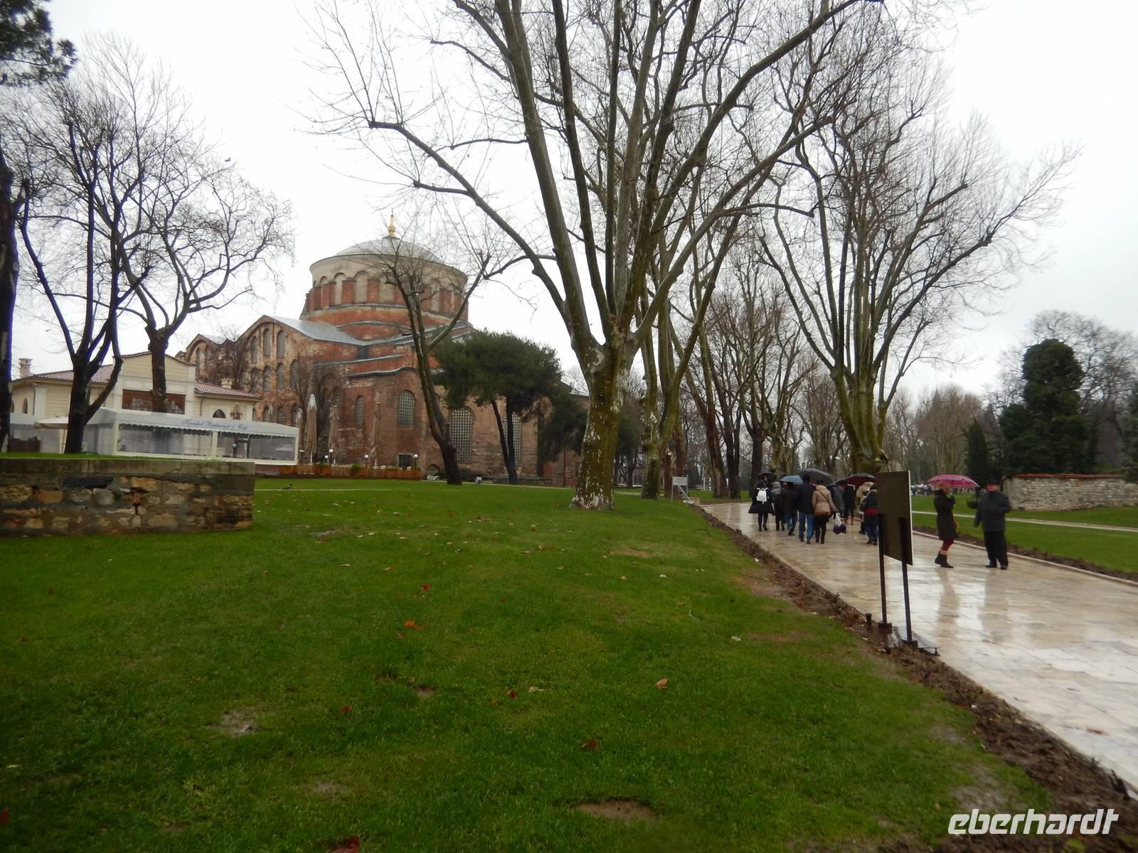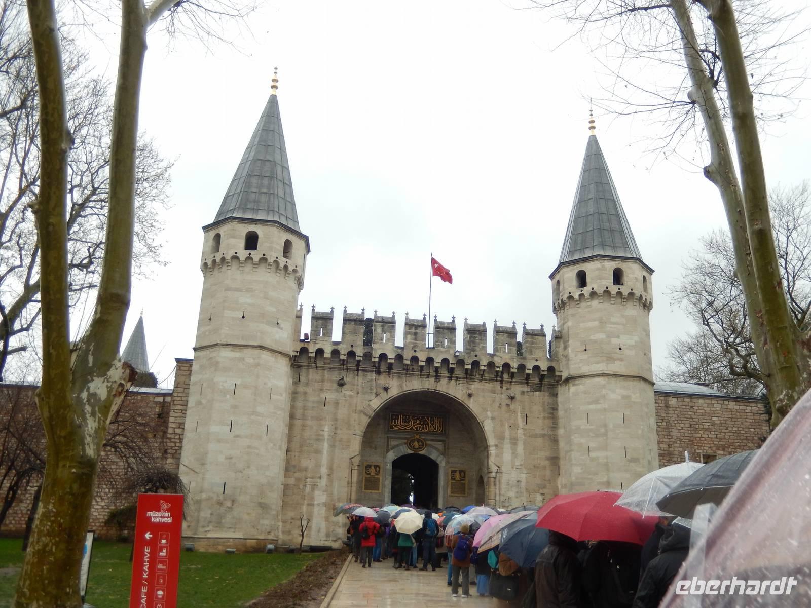 Dann fahren wir zum Topkapi Palast undd werden von einer langen Schlange erwartet. Dieser war gestern geschlossen gewesen. Viele Jahre lang war dieser Palast Regierungszentrum der politischen Macht des osmanischen Reiches gewesen. Hier lebte der Sultan mit seinem Harem und seiner Familie.