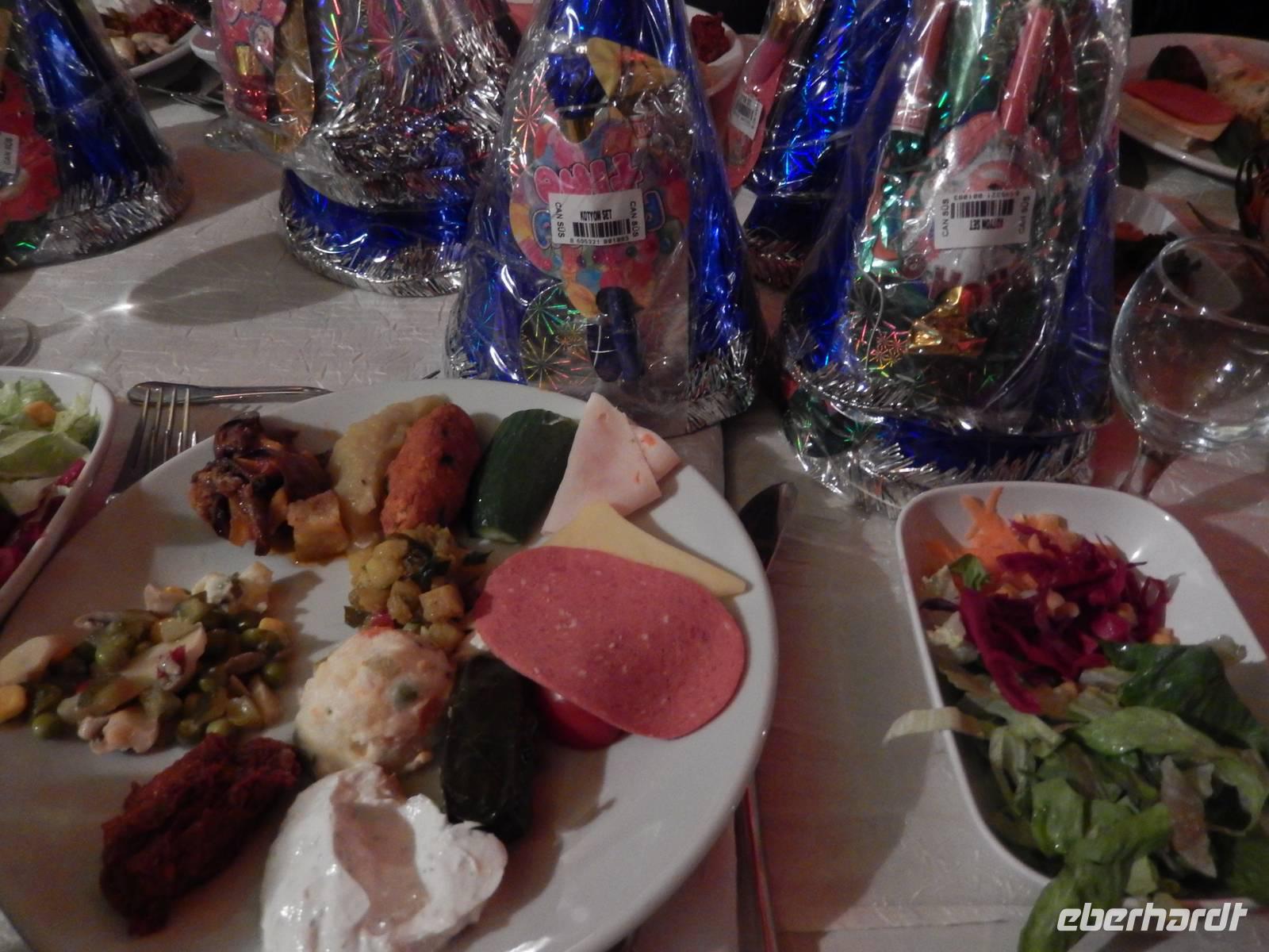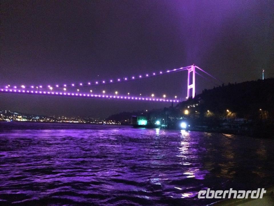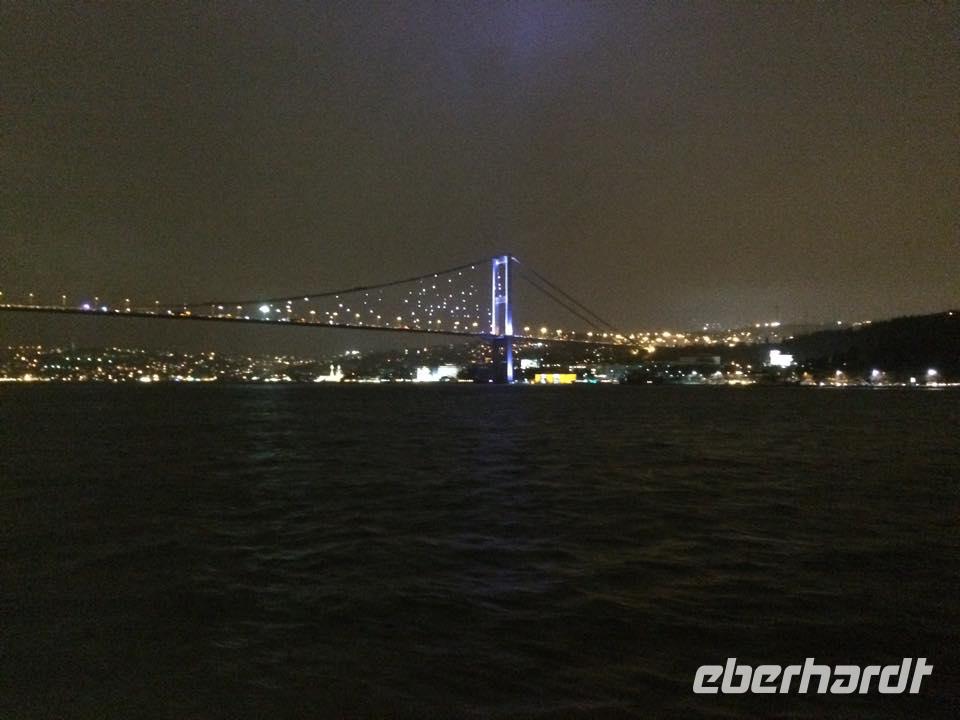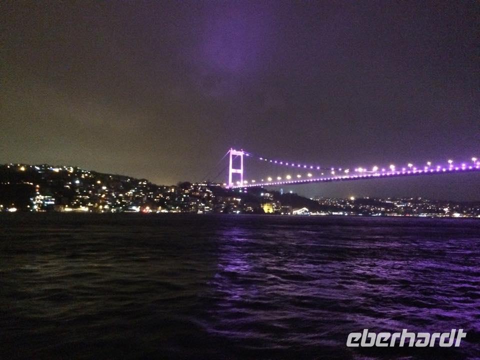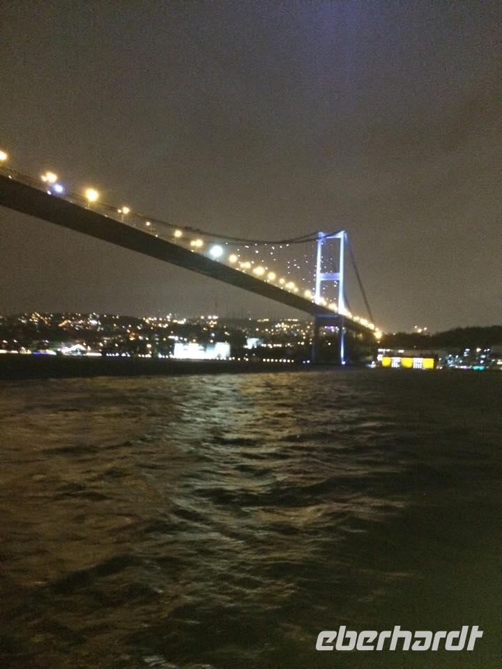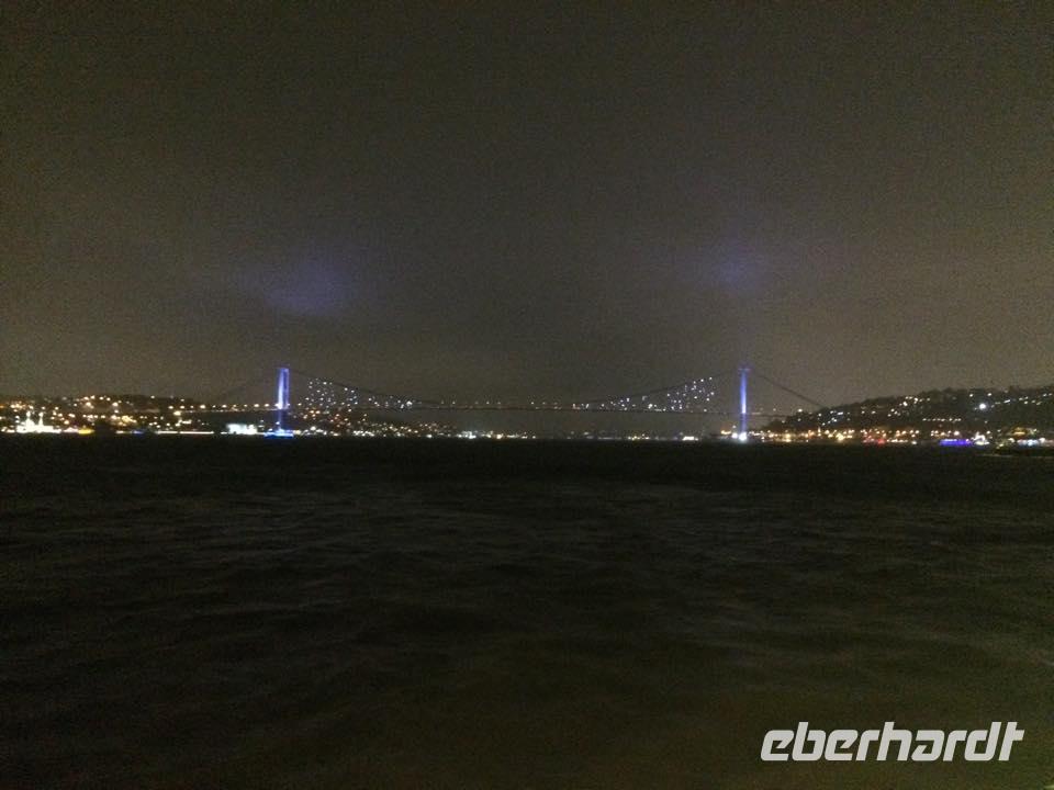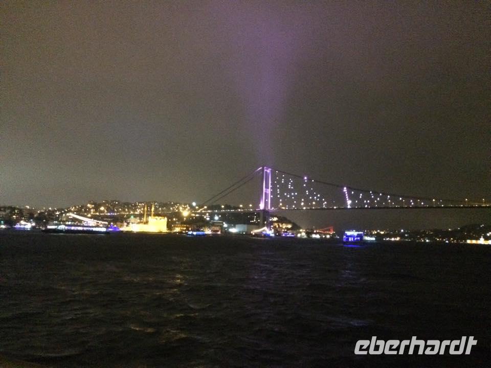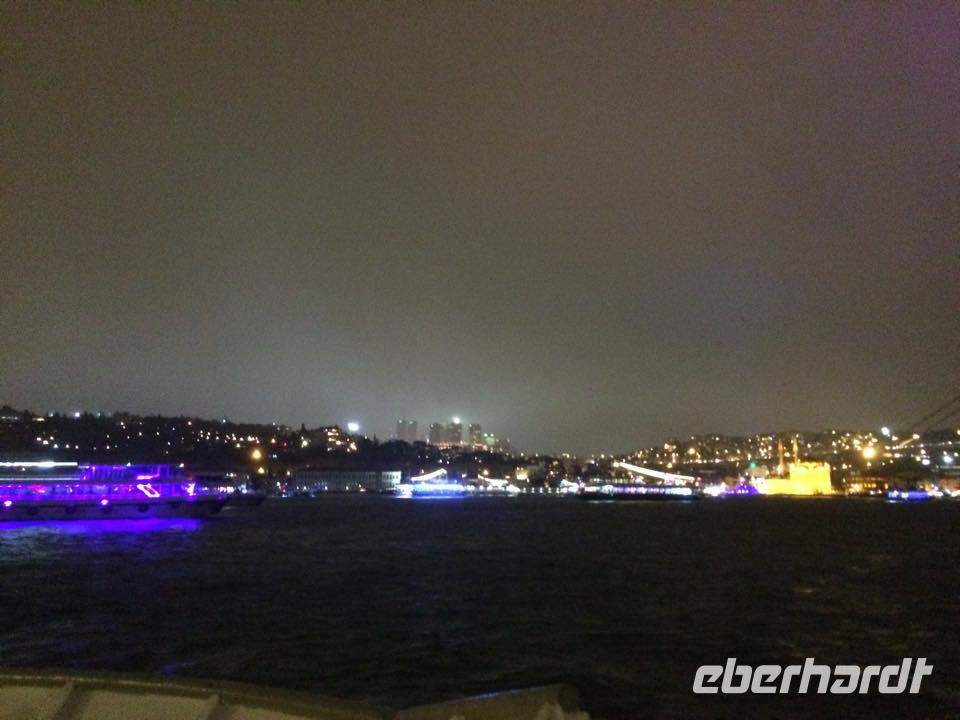 Um acht gehen wir dann auf unser Boot und bekommen unser Abendessen serviert. Getränke sind inklusive und eine türkische Band verbreitet heitere Stimmung. Auf den Boot feiern auch Einheimische ins Neue Jahr, was uns einen guten Einblick in eine typisch türkische Silvesternacht gibt. Sie singen und tanzen ausgelassen, für unsere Ohren vorerst viel zu laut. Doch später tanzen auch wir mit den Einheimischen in den Abend hinein. Gegen zwölf Uhr hält das Boot unter der Brücke, welche die Grenzen zwischen Europa und Asien bildet, und wir stoßen mit einem Glas Sekt an. Das Feuerwerk fällt hier in Istanbul wider Erwarten ziemlich klein aus. Doch alle sind nun guter Stimmung und so tanzen wir noch eine Zeitlang und haben unseren Spaß. Um 2 hält das Boot und wir fahren zurück ins Hotel. Anschließend lassen wir den Abend noch gemütlich in der Hotelbar ausklingen.